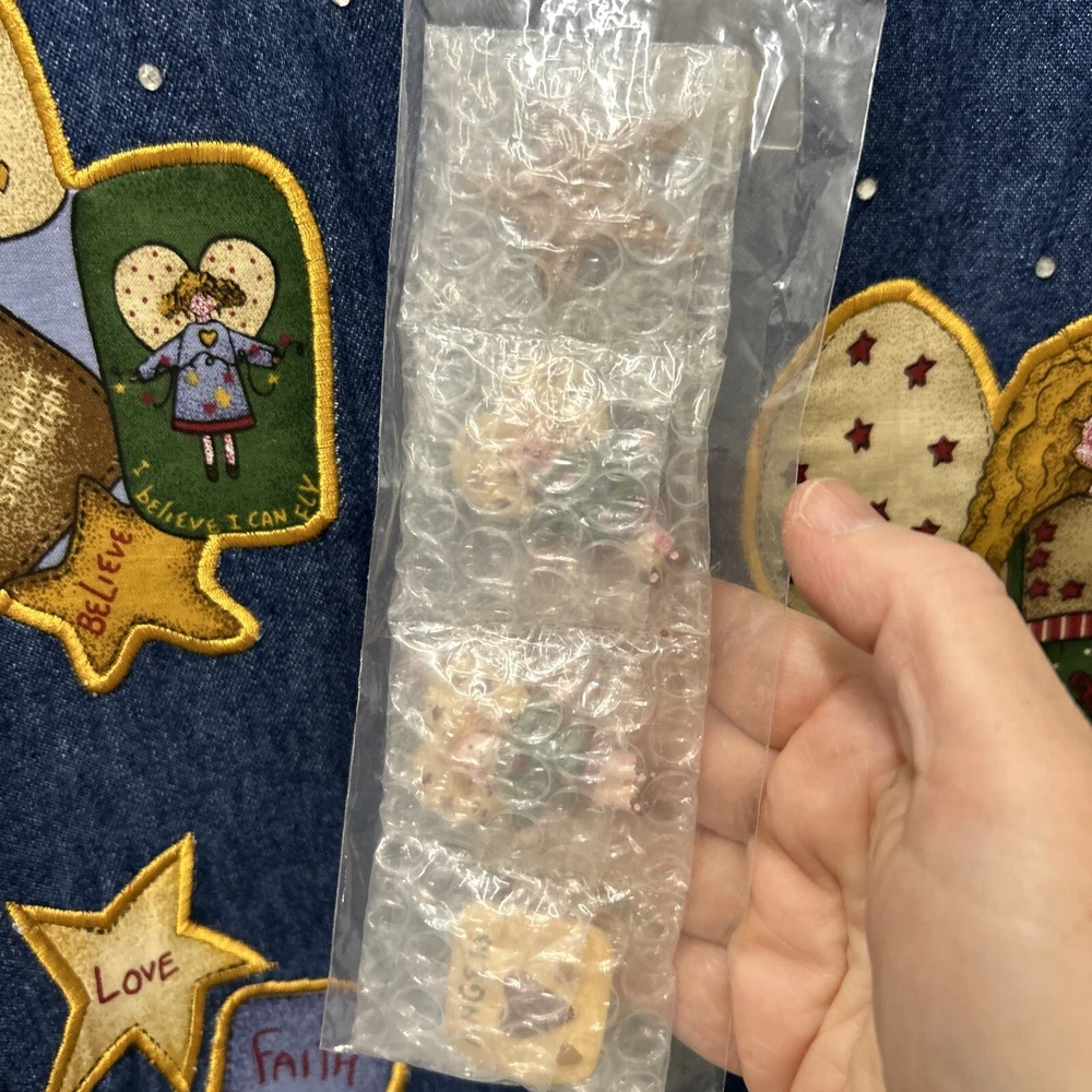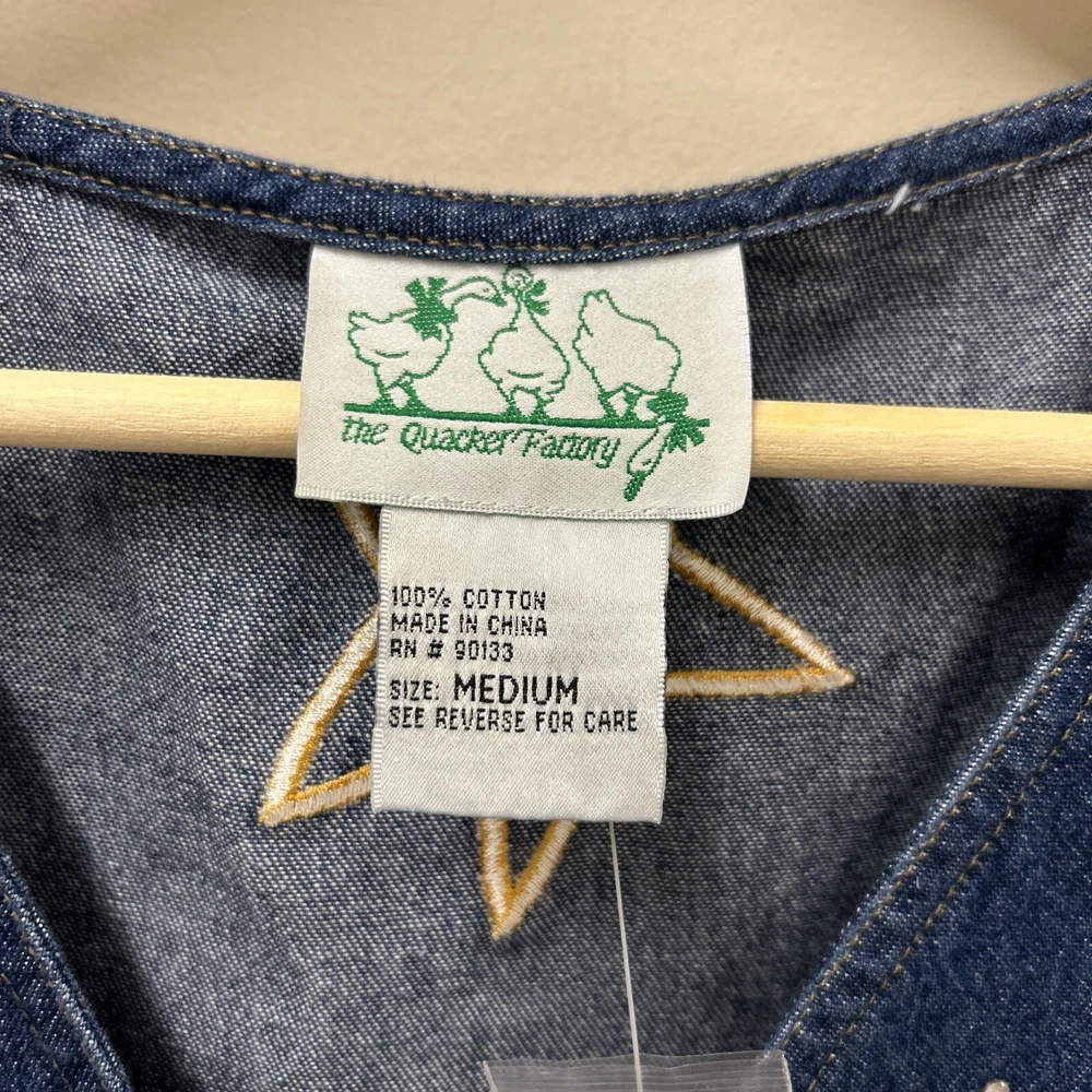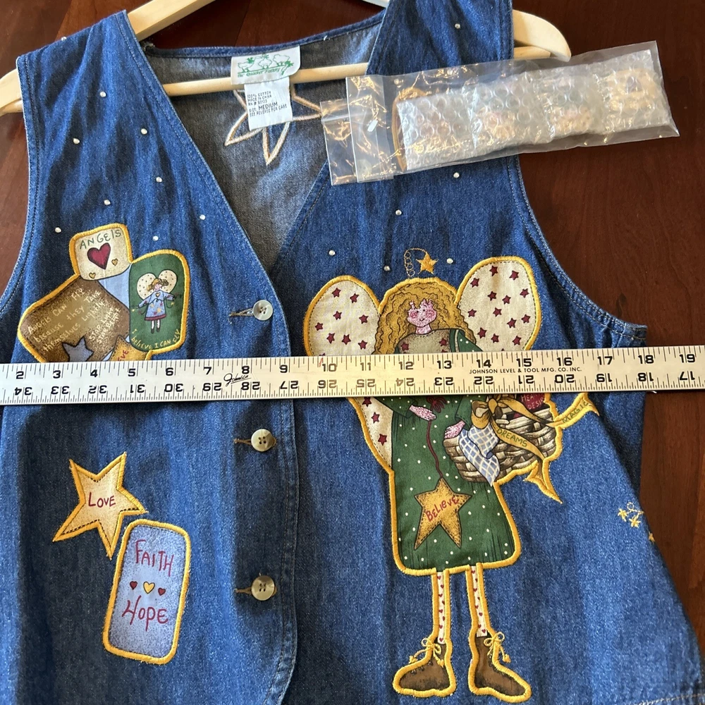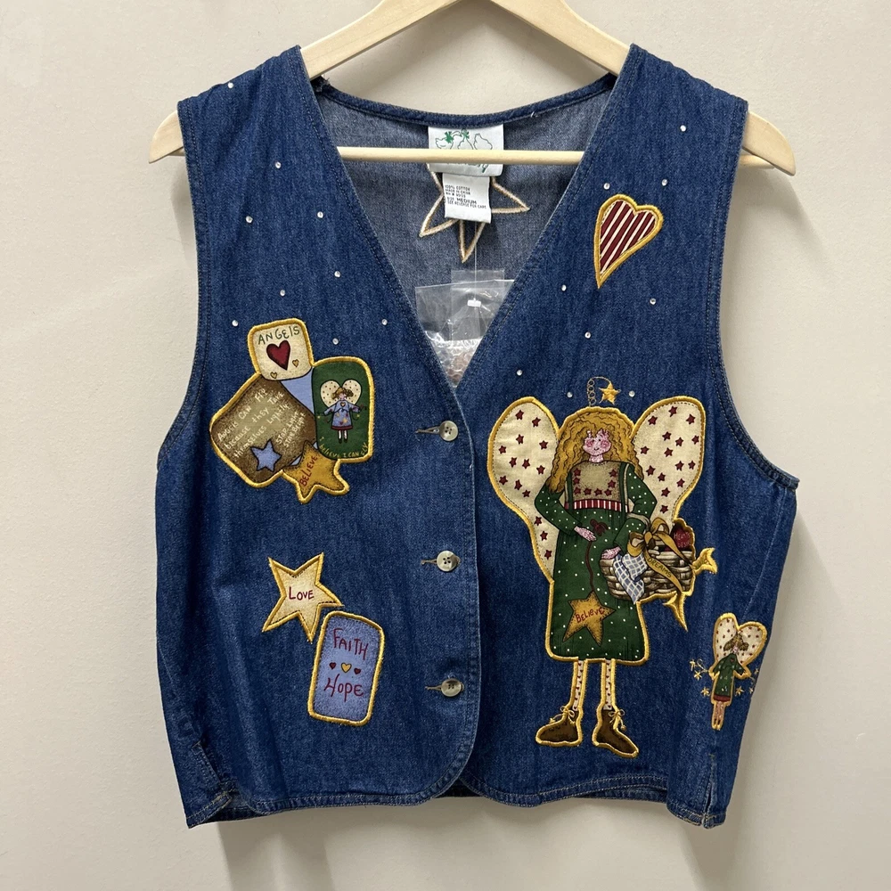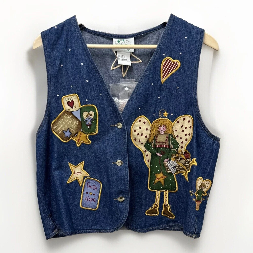 Quacker Factory Jean Vest Jacket M Angel Denim Button Sleeveless Christmas NWOT This Quacker Factory Jean Vest Jacket in size M is a must-have for any fashion-forward woman. The vest features a unique angel and stars pattern, with extra buttons for added style. The outer shell material is made of 100% cotton denim, making it perfect for travel, casual outings, and business meetings. The vest has a button closure and is machine washable for easy care. The sleeveless design and short length make it perfect for layering over a shirt or blouse, while the blue color adds a pop of color to any outfit. The jacket is not only stylish but also has a theme of angels, faith, and love. This vest is perfect for anyone who wants to add a touch of angelic charm to their wardrobe.