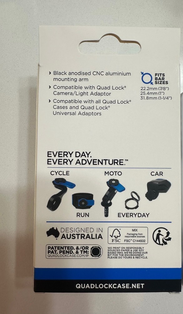 Material:AluminumBrand:Quad LockUPC:9348943001946gtin13:9348943001946Mounting Location:HandlebarMounting Type:Clip, GripSuitable Handlebar Sizes:0.87 in, 1 in, 1.25 inFeatures:Ring, HolderColor:BlackNumber of Ports:1MPN:QLM-OFM-PROItem Weight:4.2 ouncesType:Bike MountFastening:ClipDesign/Finish:Plain, MatteCompatible Model:For Apple iPhone SE, Universal, For Apple iPhone 8, For Apple iPhone 11 Pro, For Apple iPhone 8 Plus, For Apple iPhone XS MaxCompatible Brand:For Apple, Universal, For Samsung