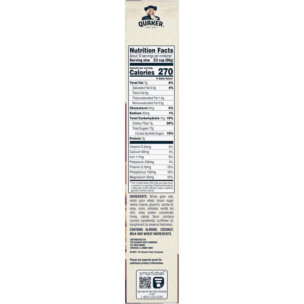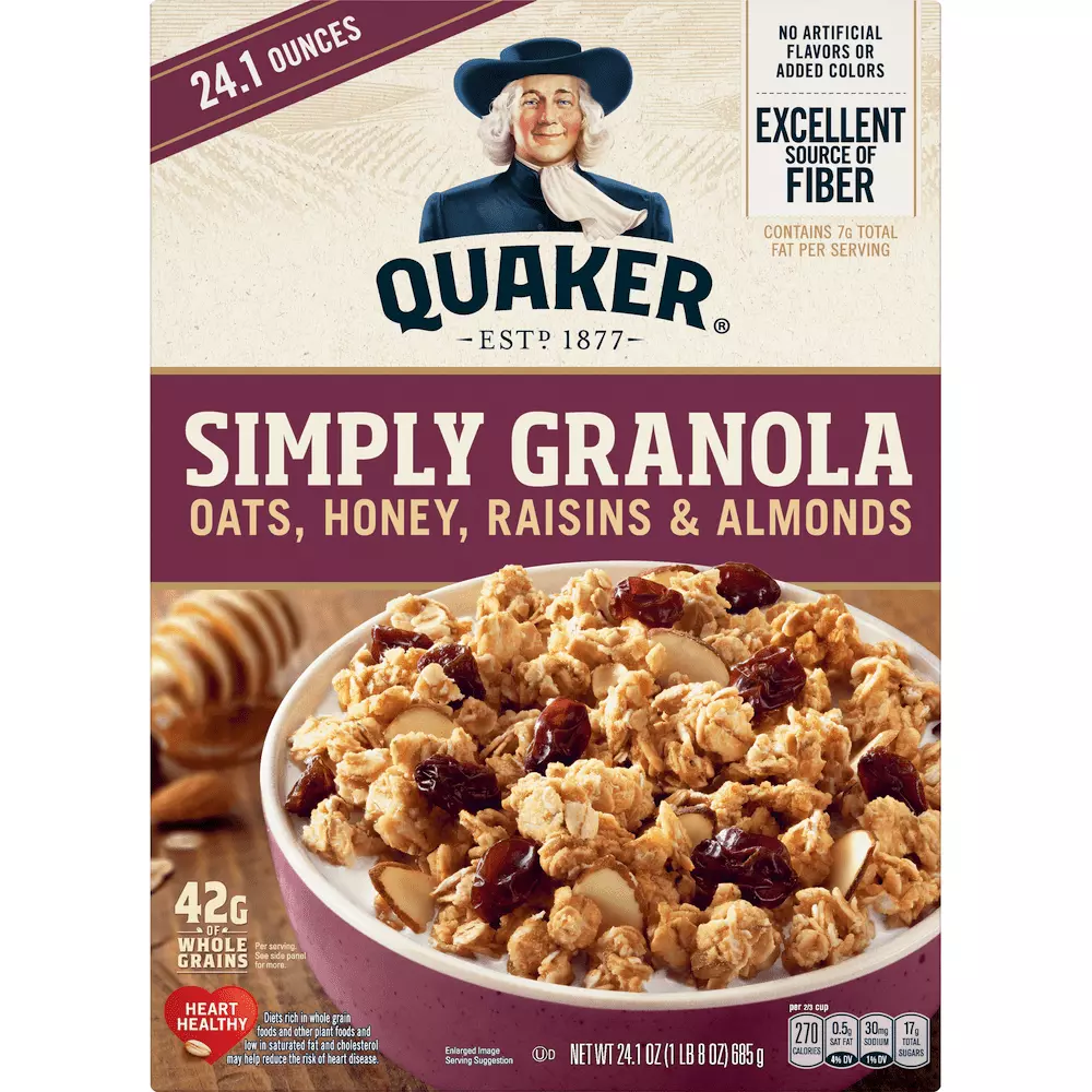 Great mornings inspire great days bustling with new possibilities, unknown adventures, and amazing friends. Prepare for all that lies ahead by filling your bowls, bellies, and hearts with the love of a nourishing breakfast from Quaker Oats. Quaker Simply Granola Oats, Honey, Raisins & Almonds, 24.1 oz, offers a wholesome and delicious blend of crunchy granola. Made with hearty oats, sweet honey, juicy raisins, and crunchy almonds, this granola provides a satisfying and nutritious breakfast or snack. Enjoy it with milk, yogurt, or as a standalone treat, and experience the perfect balance of flavor and texture in every bite. Excellent source of fiber 42g whole grains Enjoy with milk, over yogurt, or as a snack on the go No Artificial Flavors, No Added Colors Heart Healthy - Diets Rich In Whole Grain Foods And Other Plan Foods And Low In Saturated Fat And Cholesterol May Help Reduce The Risk Of Heart Disease OU Kosher Dairy