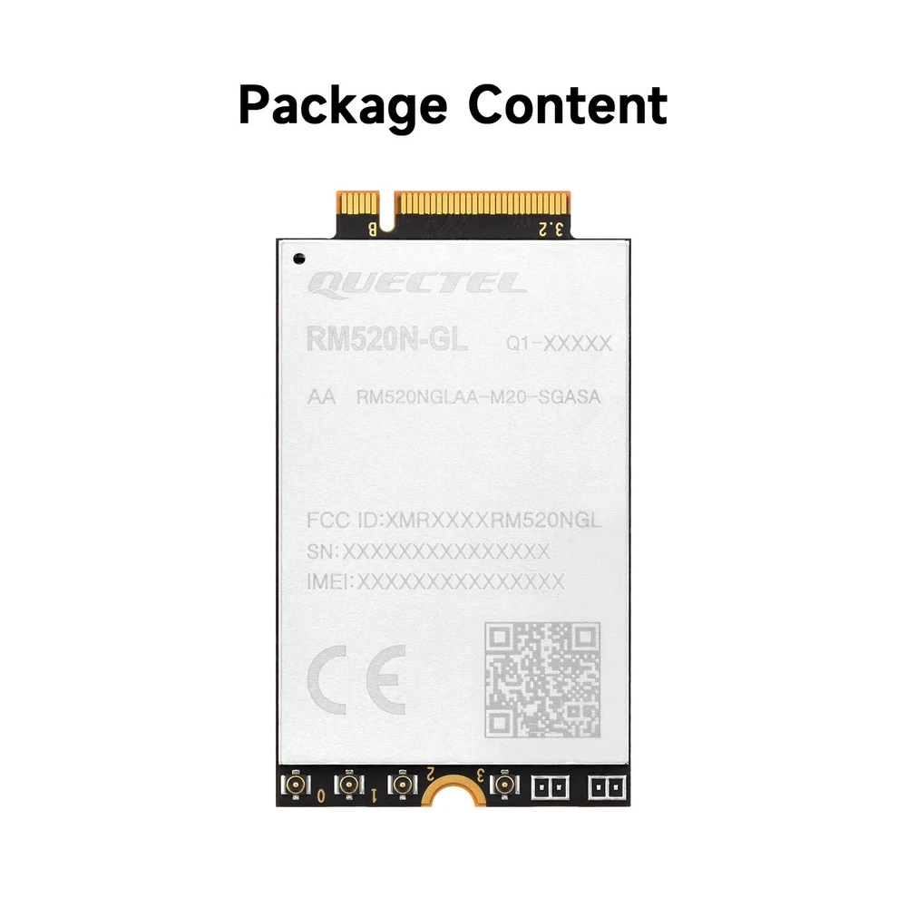 DESCRIPTION Quectel RM520N-GL IoT 5G Global Band Module, 5G Sub-6G Module, M.2 Form Factor With 3GPP 5G Release 16 Specification Quectel RM520N-GL IoT 5G Global Band Module 5G Sub-6G Module, M.2 Form Factor With 3GPP 5G Release 16 Specification The RM520N-GL is a 5G Sub-6GHz module specially optimized for IoT/EMBB applications. Adopts 3GPP Release 16 specification and supports 5G non-standalone (NSA) and standalone (SA) modes. Designed in an M.2 form factor, RM520N-GL is compatible with Quectel RM50xQ 5G module series, LTE-A Cat 6 module EM06, Cat 12 module EM12/EM12xR/EM120K series, and Cat 16 module EM160R-GL, facilitating migration from LTE-A to 5G. This module is an industrial-grade module for industrial and commercial applications only. The RM520N-GL series nearly covers all the mainstream carriers worldwide. The integrated multi-constellation high-precision GNSS receiver (supports GPS, GLONASS, BDS and Galileo) greatly simplifies the product design and provides quicker, more accurate positioning capability. Built in a rich set of network protocols, integrates multiple industry-standard interfaces and supports multiple drivers and software functions (USB/PCIe drivers for Windows 7/8/8.1/10, Linux, and Android), which can be adopted in a wide range of eMBB and IoT applications including industrial routers, home gateways, STB, industrial laptops, consumer laptops, industrial PDAs, rugged tablet PCs, video surveillance and digital signage. Designed for IoT/eMBB applications, support 5G/4G/3G, M.2 form factor Full coverage of multi network standards including 5G and LTE-A Supports NSA and SA modes Multi-constellation GNSS receiver available for applications requiring fast and accurate positioning in any environment Supports multi functions: DFOTA and VoLTE (optional) Supports 3GPP Release16 Specifications 5G SUB-6 RM500U-CN RM500Q-GL RM502Q-AE RM520N-GL 5G Standard 3GPP R15 3GPP R16 Region / Provider China Global (except US) Global (except China) Global Operating temperature -30 °C ~ +75 °C -30 °C ~ +70 °C Extension temperature -40 °C ~ +85 °C Dimensions 30.0 × 52.0 × 2.3 (mm) Weight 8.9 (g) 8.7 (g) Power supply 3.3~4.4 V, typical 3.7 V 3.135~4.4 V, typical 3.7 V Power consumption 90 μA @ shutdown 3.7 mA @ hibernate TBD @ USB 2.0, idle TBD @ USB 3.0, idle 70 μA @ shutdown 4.0 mA @ hibernate 32 mA @ USB 2.0, idle 54 mA @ USB 3.0, idle 80 μA @ shutdown 4.2 mA @ hibernate 39 mA @ USB 2.0, idle 54.5 mA @ USB 3.0, idle 195 μA @ shutdown 4.7 mA @ hibernate 41 mA @ USB 2.0, idle 60 mA @ USB 3.0, idle FREQUENCY BAND 5G 5G NR NSA n41, n78, n79 n41, n77, n78, n79 n1, n2, n3, n5, n7, n8, n12, n20, n25, n28, n38, n40, n41, n48, n66, n71, n77, n78, n79 n1, n2, n3, n5, n7, n8, n12, n13, n14, n18, n20, n25, n26, n28, n29, n30, n38, n40, n41, n48, n66, n70, n71, n75, n76, n77, n78, n79 5G NR SA n1, n28, n41, n77, n78, n79 n1, n2, n3, n5, n7, n8, n12, n20, n25, n28, n38, n40, n41, n48*, n66, n71, n77, n78, n79 n1, n2, n3, n5, n7, n8, n12, n13, n14, n18, n20, n25, n26, n28, n29, n30, n38, n40, n41, n48, n66, n70, n71, n75, n76, n77, n78, n79 LTE LTE-FDD B1, B2, B3, B5, B7, B8, B20, B28 B1, B2, B3, B4, B5, B7, B8, B12(B17), B13, B14, B18, B19, B20, B25, B26, B28, B29, B30, B32, B66, B71 LTE-TDD B34, B38, B39, B40, B41 B34, B38, B39, B40, B41, B42, B43, B48 LAA - B46 UMTS WCDMA B1, B2, B5, B8 B1, B2, B3, B4, B5, B6, B8, B19 B1, B2, B4, B5, B8, B19 GNSS - GPS / GLONASS / BeiDou (Compass) / Galileo DATA RATE 5G SA Sub-6 downlink 2 Gbps; uplink 1 Gbps downlink 2.1 Gbps; uplink 900 Mbps downlink 4.2 Gbps; uplink 450 Mbps downlink 2.4 Gbps; uplink 900 Mbps 5G NSA Sub-6 downlink 2.2 Gbps; uplink 575 Mbps downlink 2.5 Gbps; uplink 600/650 Mbps downlink 5 Gbps; uplink 650 Mbps downlink 3.4 Gbps; uplink 550 Mbps LTE downlink 600 Mbps; uplink 150 Mbps downlink 1.0 Gbps; uplink 200 Mbps downlink 2 Gbps; uplink 200 Mbps downlink 1.6 Gbps; uplink 200 Mbps UMTS downlink 42.2 Mbps; uplink 11 Mbps downlink 42 Mbps; uplink 5.76 Mbps Application Scenarios Industrial Routers, Home Gateways, Set Top Boxes, Industrial Laptops, Consumer Laptops, Industrial PDAs, Rugged Industrial PCs, And Digital Signage... Dimensions Resources & Services * Resources for different product may vary, please check the wiki page to confirm the actually provided resources. PACKAGE CONTENT Weight: 0.009 kg This is an M.2 module without antenna or base board, it is recommended to used with the 5G antenna , 5G HAT and 5G DONGLE HAT . RM520N-GL x1