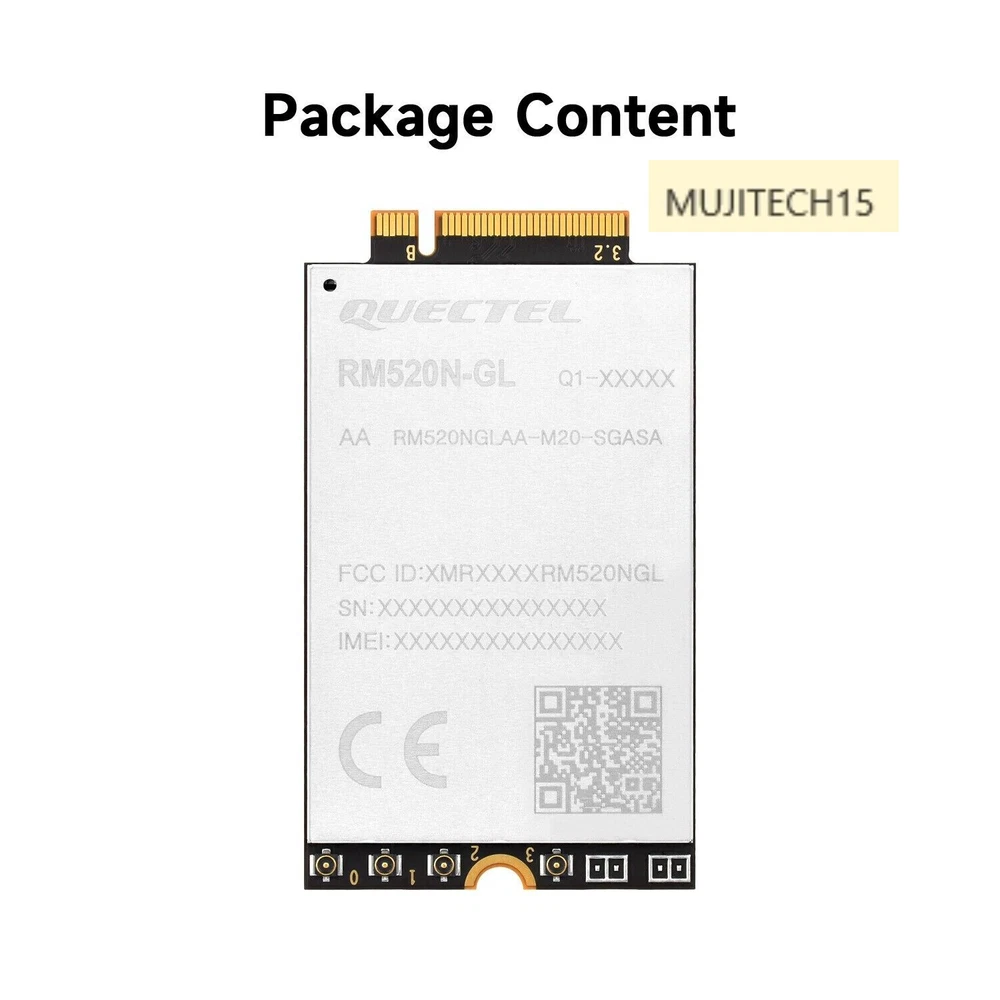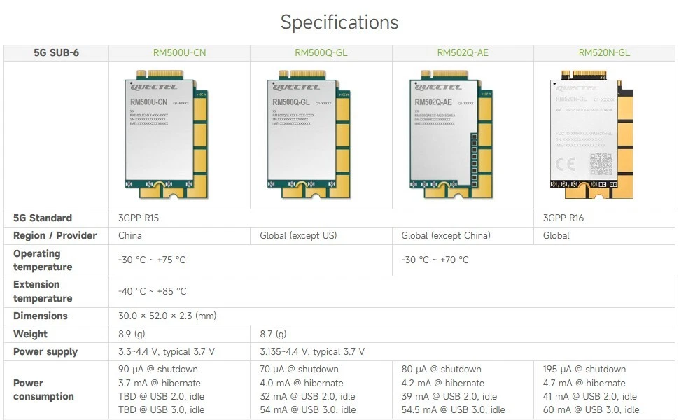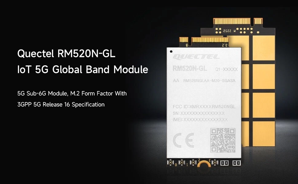 Quectel RM520N-GL IoT 5G Global Band Module 5G Sub-6G Module, M.2 Form Factor With 3GPP 5G Release 16 Specification The RM520N-GL is a 5G Sub-6GHz module specially optimized for IoT/EMBB applications. Adopts 3GPP Release 16 specification and supports 5G non-standalone (NSA) and standalone (SA) modes. Designed in an M.2 form factor, RM520N-GL is compatible with Quectel RM50xQ 5G module series, LTE-A Cat 6 module EM06, Cat 12 module EM12/EM12xR/EM120K series, and Cat 16 module EM160R-GL, facilitating migration from LTE-A to 5G. This module is an industrial-grade module for industrial and commercial applications only. The RM520N-GL series nearly covers all the mainstream carriers worldwide. The integrated multi-constellation high-precision GNSS receiver (supports GPS, GLONASS, BDS and Galileo) greatly simplifies the product design and provides quicker, more accurate positioning capability. Built in a rich set of network protocols, integrates multiple industry-standard interfaces and supports multiple drivers and software functions (USB/PCIe drivers for Windows 7/8/8.1/10, Linux, and Android), which can be adopted in a wide range of eMBB and IoT applications including industrial routers, home gateways, STB, industrial laptops, consumer laptops, industrial PDAs, rugged tablet PCs, video surveillance and digital signage. Designed for IoT/eMBB applications, support 5G/4G/3G, M.2 form factor Full coverage of multi network standards including 5G and LTE-A Supports NSA and SA modes Multi-constellation GNSS receiver available for applications requiring fast and accurate positioning in any environment Supports multi functions: DFOTA and VoLTE (optional) Supports 3GPP Release16 Specifications 5G SUB-6 RM500U-CN RM500Q-GL RM502Q-AE RM520N-GL 5G Standard 3GPP R15 3GPP R16 Region / Provider China Global (except US) Global (except China) Global Operating temperature -30 °C ~ +75 °C -30 °C ~ +70 °C Extension temperature -40 °C ~ +85 °C Dimensions 30.0 × 52.0 × 2.3 (mm) Weight 8.9 (g) 8.7 (g) Power supply 3.3~4.4 V, typical 3.7 V 3.135~4.4 V, typical 3.7 V Power consumption 90 μA @ shutdown 3.7 mA @ hibernate TBD @ USB 2.0, idle TBD @ USB 3.0, idle 70 μA @ shutdown 4.0 mA @ hibernate 32 mA @ USB 2.0, idle 54 mA @ USB 3.0, idle 80 μA @ shutdown 4.2 mA @ hibernate 39 mA @ USB 2.0, idle 54.5 mA @ USB 3.0, idle 195 μA @ shutdown 4.7 mA @ hibernate 41 mA @ USB 2.0, idle 60 mA @ USB 3.0, idle FREQUENCY BAND 5G 5G NR NSA n41, n78, n79 n41, n77, n78, n79 n1, n2, n3, n5, n7, n8, n12, n20, n25, n28, n38, n40, n41, n48, n66, n71, n77, n78, n79 n1, n2, n3, n5, n7, n8, n12, n13, n14, n18, n20, n25, n26, n28, n29, n30, n38, n40, n41, n48, n66, n70, n71, n75, n76, n77, n78, n79 5G NR SA n1, n28, n41, n77, n78, n79 n1, n2, n3, n5, n7, n8, n12, n20, n25, n28, n38, n40, n41, n48*, n66, n71, n77, n78, n79 n1, n2, n3, n5, n7, n8, n12, n13, n14, n18, n20, n25, n26, n28, n29, n30, n38, n40, n41, n48, n66, n70, n71, n75, n76, n77, n78, n79 LTE LTE-FDD B1, B2, B3, B5, B7, B8, B20, B28 B1, B2, B3, B4, B5, B7, B8, B12(B17), B13, B14, B18, B19, B20, B25, B26, B28, B29, B30, B32, B66, B71 LTE-TDD B34, B38, B39, B40, B41 B34, B38, B39, B40, B41, B42, B43, B48 LAA - B46 UMTS WCDMA B1, B2, B5, B8 B1, B2, B3, B4, B5, B6, B8, B19 B1, B2, B4, B5, B8, B19 GNSS - GPS / GLONASS / BeiDou (Compass) / Galileo DATA RATE 5G SA Sub-6 downlink 2 Gbps; uplink 1 Gbps downlink 2.1 Gbps; uplink 900 Mbps downlink 4.2 Gbps; uplink 450 Mbps downlink 2.4 Gbps; uplink 900 Mbps 5G NSA Sub-6 downlink 2.2 Gbps; uplink 575 Mbps downlink 2.5 Gbps; uplink 600/650 Mbps downlink 5 Gbps; uplink 650 Mbps downlink 3.4 Gbps; uplink 550 Mbps LTE downlink 600 Mbps; uplink 150 Mbps downlink 1.0 Gbps; uplink 200 Mbps downlink 2 Gbps; uplink 200 Mbps downlink 1.6 Gbps; uplink 200 Mbps UMTS downlink 42.2 Mbps; uplink 11 Mbps downlink 42 Mbps; uplink 5.76 Mbps