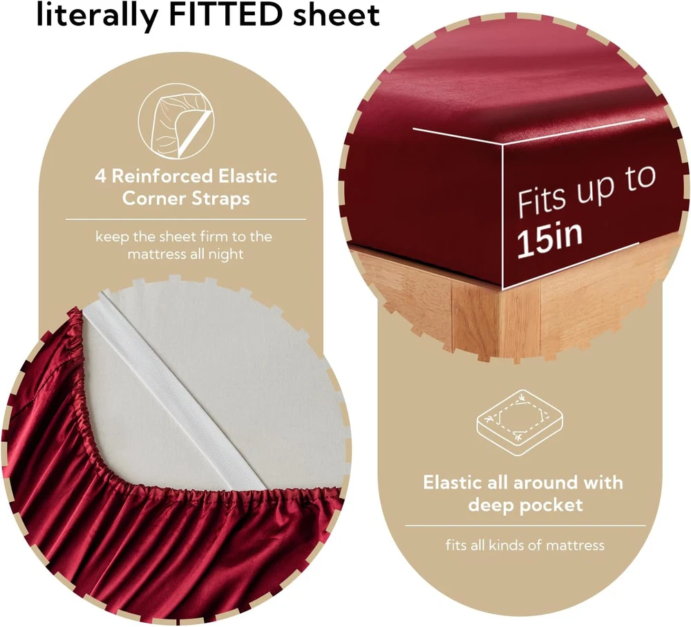 Fast Shipping Great Customer Support Satisfaction Guaranteed DESCRIPTION Shipping Shipping Shipping All domestic packages are shipped for Free (Unless other shipping method was selected during the checkout) Most items ship and arrive much sooner than the estimate delivery date. Usually within 2-3 days from payment. However, we have longer estimates to compensate for the occasional delay or supply chain breakdown. We do not accept P.O. BOXES - PLEASE PROVIDE A PHYSICAL ADDRESS Return Return Return In the event that you would like to return your purchase, we allow returns that are processed within the defined return date (the return date is to be found in the return policy/shipping and handling section) Please contact us for a return authorization and the return shipping address. Payment Payment Payment PayPal is our preferred method of payments it's the quickest, easiest and most secure way to pay for your goods or services online. PayPal offers buyer and seller protection should there be a problem. If you do not have a PayPal account, to get started and buy your first item with us is very easy. Simply click on the 'Buy It Now' button and follow the eBay checkout steps. Select PayPal as the payment method you then will be given the chance to enter your card details in to PayPal's secure checkout in order to pay for your order. Once the payment has been made, you will then be given the opportunity to make your own PayPal account to make paying for your items in the future very easy. Should there be a problem with payment please do let us know. Feedback Feedback Feedback Customer satisfaction is very important to us. If you have any problem with your order,please contact us and we will do our best to make you satisfied, please do not leave a negative feedback before we resolve your problem. We guarantee that your issue will be solved quickly. As long as you are happy with your purchase of , please leave us a positive feedback. Your feedback is very important to us it affects our search placement on eBay. We will leave a positive feedback for you in return automatically once we receive your feedback. Contact Us Contact Us Contact Us If you have any queries, please contact us via ebay. We usually respond within 24 hours on weekdays. Thank you for visiting our ebay store! Queen Size Bed Sheets Set: 1 Flat Sheet: 90"x 102", 1 Fitted Sheet: 60"x 80" + 15" Deep Pocket, 2 Pillowcases: 20"x 30". Silky Soft Sleeping Experience: Crafted from 100% satin polyester, our sheets are luxurious and smooth to the touch. Experience ultimate comfort without friction or restriction. The breathable fabric keeps your skin cool, offering a sensation akin to sleeping on clouds. Enhanced Sheet Stability: Our fitted sheet features all-around elastic bands and additional corner straps, ensuring a secure fit that prevents slipping, so that you can roll freely on the bed without worrying about messing up the bed. Wake Up Beautifully: Our satin fabric minimizes hair friction, reducing frizz and breakage for smoother, shinier hair. Additionally, it aids in skin care, retaining moisture to nourish your skin and diminish wrinkles over time, enhancing your beauty. Easy Care: Our satin pillowcases and sheets are durable, but proper care is essential. Machine wash gently in cold water with a neutral detergent, and tumble dry on low temperature. Avoid bleaching and wash separately in a laundry bag to prevent pilling and color fading. Avoid contact with rough objects. If you have any questions, please contact us. Queen Satin Sheet Set 4 Pcs Luxury Pillowcase, Flat & Fitted Burgundy Click here to see description Fast Shipping Great Customer Support Satisfaction Guaranteed DESCRIPTION Shipping All domestic packages are shipped for Free (Unless other shipping method was selected during the checkout) We ship within two business days of payment, usually sooner Standard FREE shipping takes between 3-5 business days Expedited shipping takes between 2-3 business days Overnight shipping takes between 1-2 business days We do not accept P.O. BOXES - PLEASE PROVIDE A PHYSICAL ADDRESS We Ship Globally using ebay's GSP, the item is sent to a logistic center in KY and shipped from there to the rest of the world. International customers are responsible for all duties and taxes Contact your local authority for questions related to the amount of duties or taxes you will be responsible for Return In the event that you would like to return your purchase, we allow returns that are processed within the defined return date (the return date is to be found in the return policy/shipping and handling section) Please contact us for a return authorization and the return shipping address. Please contact us for a Return Merchandise Authorization (RMA) number. We advise you to use a reputable carrier service when returning your goods. Please pack all returns appropriately. We ship globally Via eBay's global shipping program (GSP). Thus we don't cover returns for items shipped globally. Buyers returning such items will be refunded ONLY for the item's cost and not for the shipping. please check the Voltage information and make sure it matches the one in your country. In case it's not stated in the description, do ask us. Payment PayPal is our preferred method of payments it's the quickest, easiest and most secure way to pay for your goods or services online. PayPal offers buyer and seller protection should there be a problem. If you do not have a PayPal account, to get started and buy your first item with us is very easy. Simply click on the 'Buy It Now' button and follow the eBay checkout steps. Select PayPal as the payment method you then will be given the chance to enter your card details in to PayPal's secure checkout in order to pay for your order. Once the payment has been made, you will then be given the opportunity to make your own PayPal account to make paying for your items in the future very easy. Should there be a problem with payment please do let u