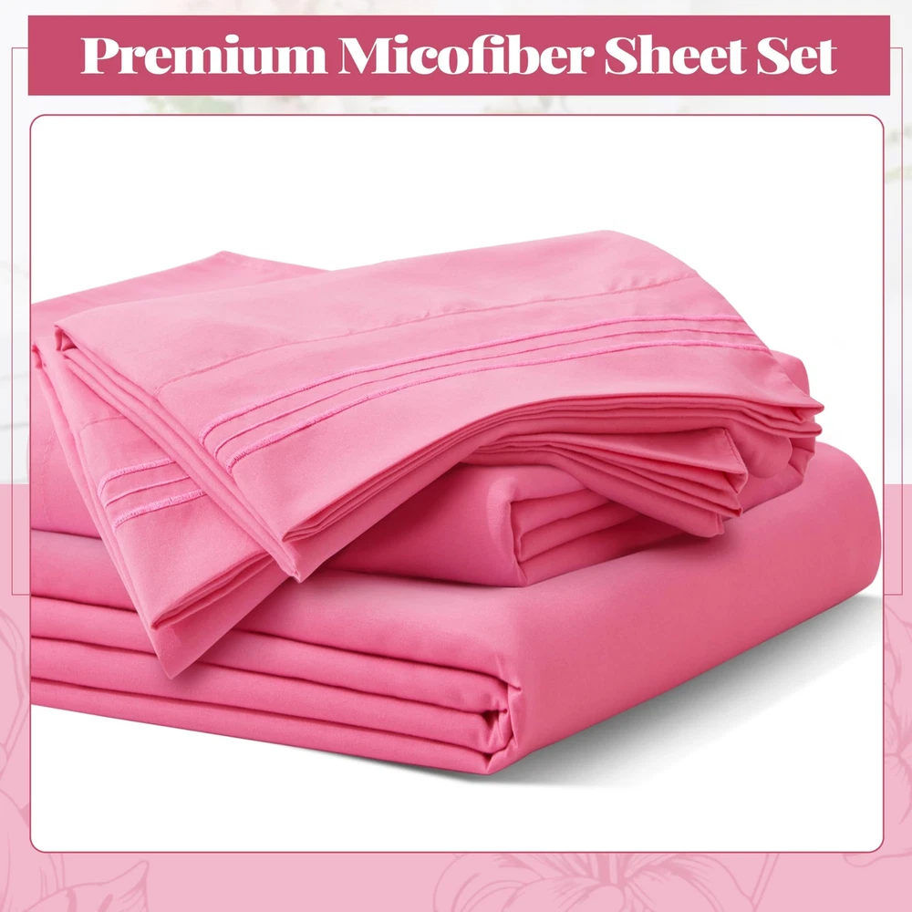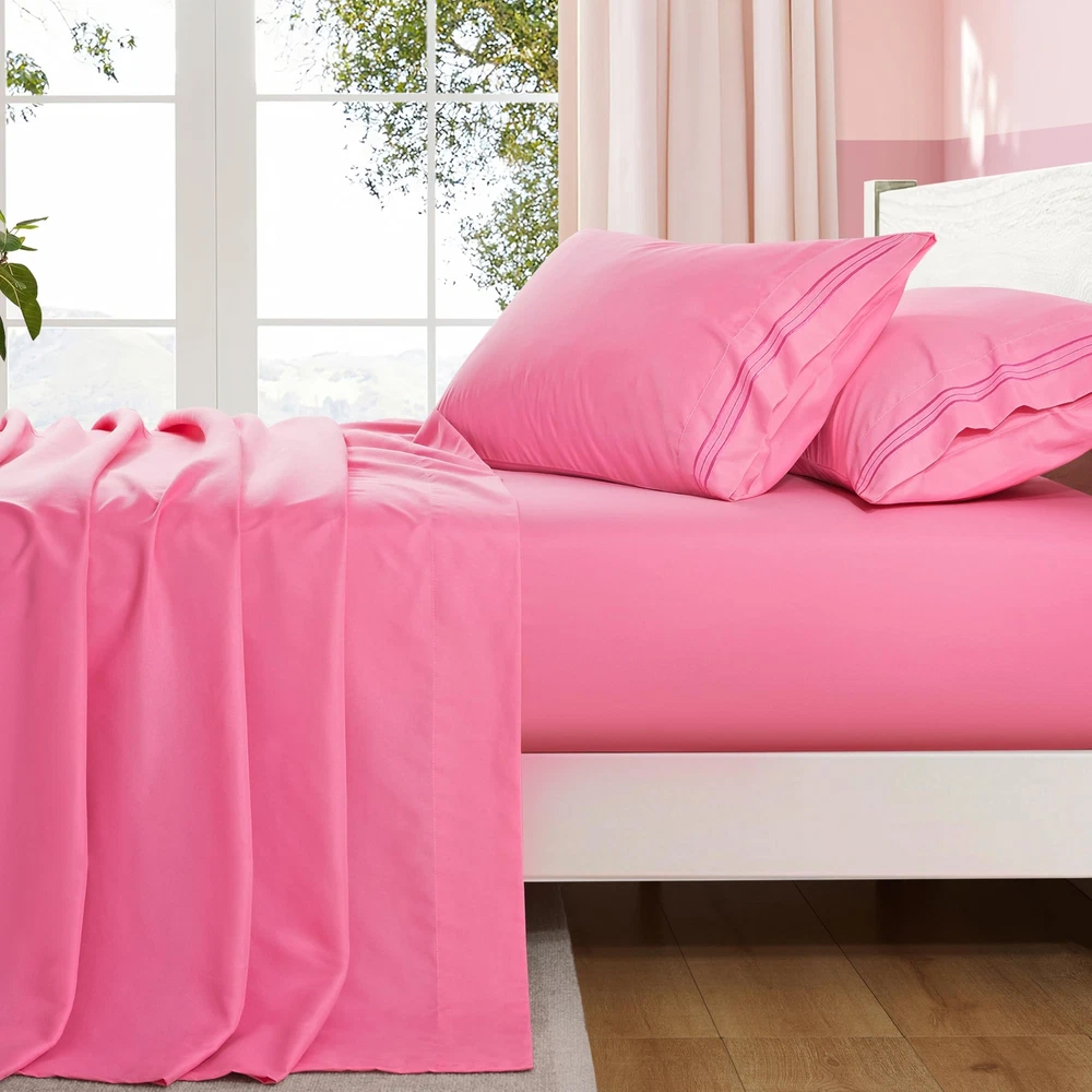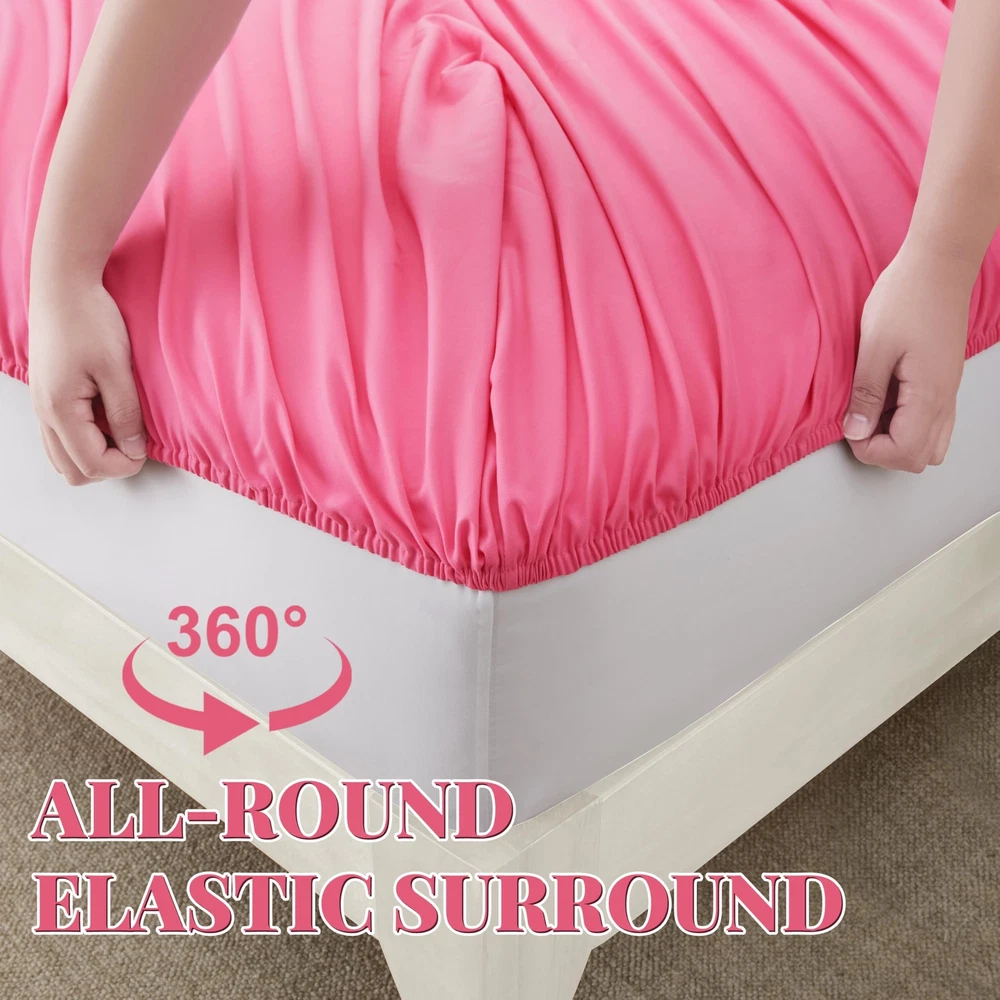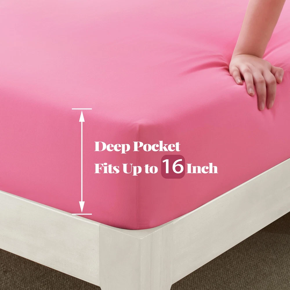 Features Soft touch and durable construction for a deep, luxurious night's sleep. The cool, breathable, machine washable sheet set is made from microfibre that resists pilling, tearing, shrinking and fading. Deep Pocket Design Deep pocket design fits mattresses up to 16 inches deep with elastic around the sheet. The shams are designed to add elasticity and durability to maintain a snug fit to the mattress, allowing you to toss and turn in bed without worrying about the shams coming loose. Easy care If you wash them by hand, no problem. However, if you plan to dry the sheet sets in the dryer, please machine wash in cold water and tumble dry on low heat, keeping them cool or unheated. Please do not bleach! Specification : Material : Microfiber Color: Hot Pink, Sage Green, Pink, Aqua Blue, Burnt Orange, Light Teal, White, Black. Package Included: A four-piece set of microfiber queen size sheets: 1 Queen size flat sheet(90x102 inch) 1 Queen size deep pocket fitted sheet(60x80 inch, 16 inch deep) 2 Pillow case(20x30 inch) Warm Notices : 1. The color of the product may be slightly different due to the photographic image and your screen, but the color difference will not be large. What Will You Receive: A four-piece set of microfiber queen size sheets. Each includes a queen size flat sheet(90x102 inch), a queen size deep pocket fitted sheet(60x80 inch, 16 inch deep) and two pillow case(20x30 inch). The 4-piece set on the bed meets daily household needs. Enjoy vibrant colors that remain as vivid as the first night you used them, thanks to the exceptional color-fastness of brushed microfiber sheets. Luxurious Microfiber Material: Experience luxury and performance with our brushed microfiber sheets, which is made of premium ultrafine yarns, meticulously brushed, conditioned, and woven into premium fabrics for a lustrous, ultra-soft finish. providing a virtually weightless sensation that linger in your dreams. All-Around Elastic & Superior Craftsmanship: The brushed microfiber polyester fabric offers exceptional softness, while the all-around elastic on the fitted sheet ensures a neat finish. Resistant to shrinkage and fading, these sheets provide a Comfortable hotel sleeping experience, with a lightweight and breathable construction for year-round comfort. Wrinkle-Free & Breathable: The proprietary weaving process creates tightly woven fabric for enhanced breathability and wrinkle resistance. Enjoy a fresh look with each use, making these teal queen bed sheets an excellent choice for any bedroom setting. Easy Care & Energy Efficiency: These sheets are featuring with 1800 high thread count and more durable. The fade-resistant ultrafine yarns ensure easy maintenance with a short cold-water wash and low-heat tumble dry, maintaining a wrinkle-resistant quality that improves over time.