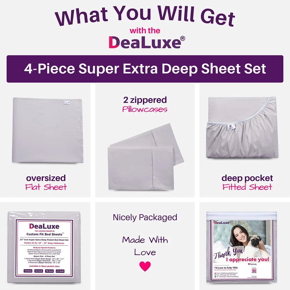 This is your perfect real 16” Extra Deep Queen Size 4-Piece Bed Sheet Set. Each and every piece with the best details. Queen Size: 16” Fitted Sheet 60” X 80” + 16”, Oversized Flat Sheet W 102” X L 108”, 2 Zipper Closure Pillowcases 20” X 30”. Designed and tested in the USA by our bedding experts for comfort, durability, easy care and style. Revolutionary real super oversized flat sheets for your high profile mattress up to 18”. What does real super oversized flat sheets mean for you? Well, the problem with all the other sheets sets on is that it has a regular flat sheet, and they will not cover your high-profile mattress. Our custom-fit flat sheets are different they are designed to cover your high profile 18” mattress they will hang over 21” on each side and neatly cover your high profile mattress on all sides. Real 16” extra deep pocket fitted sheets perfect for your 14”-18” inch mattress. What’s the difference between 14”sheets and 16” Deep Pocket Sheets? 14” Regular fitted sheets are made for mattress up to 16” only, vs these 16” Deep Sheets will fit a mattress from 14” up to 18” making it the perfect choice for high profile pillow-top mattresses, the more fabric there is, the better it will hold all night long for a neat look and cozy feel, made for your ultimate pleasure and comfort. 2 Zipper Closure Pillowcases. What does this mean for you? Most bed sheets sets and pillow cases on come with flap closure pillow cases that are is flimsy, messy and annoying. Our Pillow Cases are different, featuring a special zipper closure, no more distress with messy, flimsy flap closures pillowcases. Now you can look forward to resting your head on a neat, cozy and comfy pillow case. Get some peace of mind. Sleep in a cloud with these lush and super soft pillowcases. Made for you to enjoy hassle free Perfect Fit for 14”–18” Pillow Top Mattress with minimal care. Machine washable 16” Inch Deep Pocket Sheets, tumble dry low, remove promptly, no ironing needed. free, stain and fade resistant.