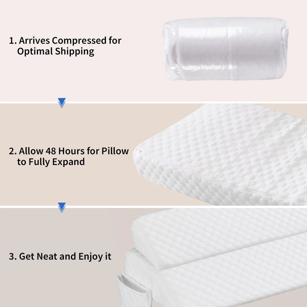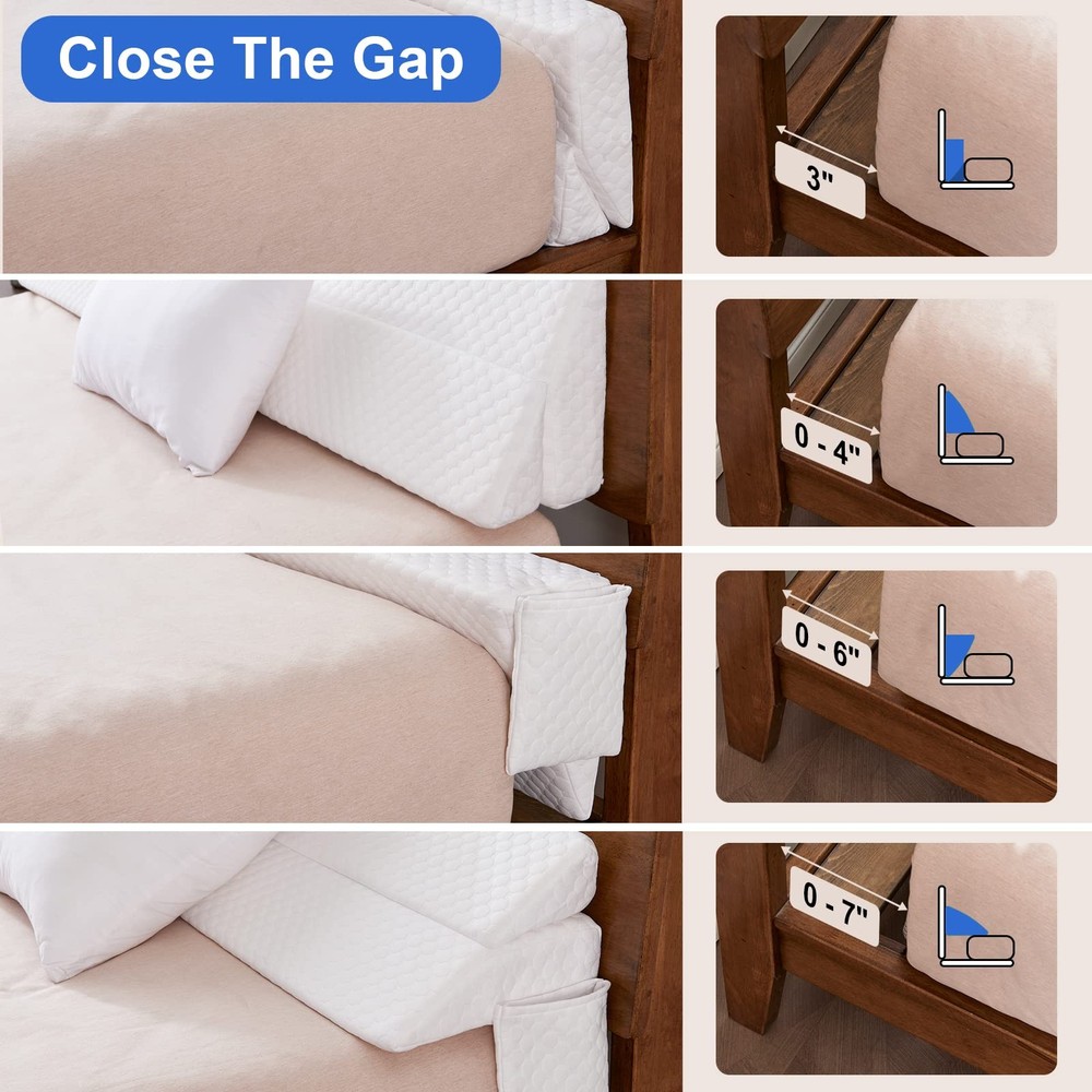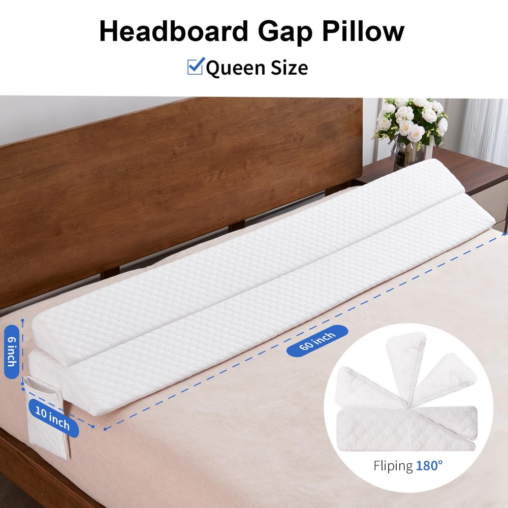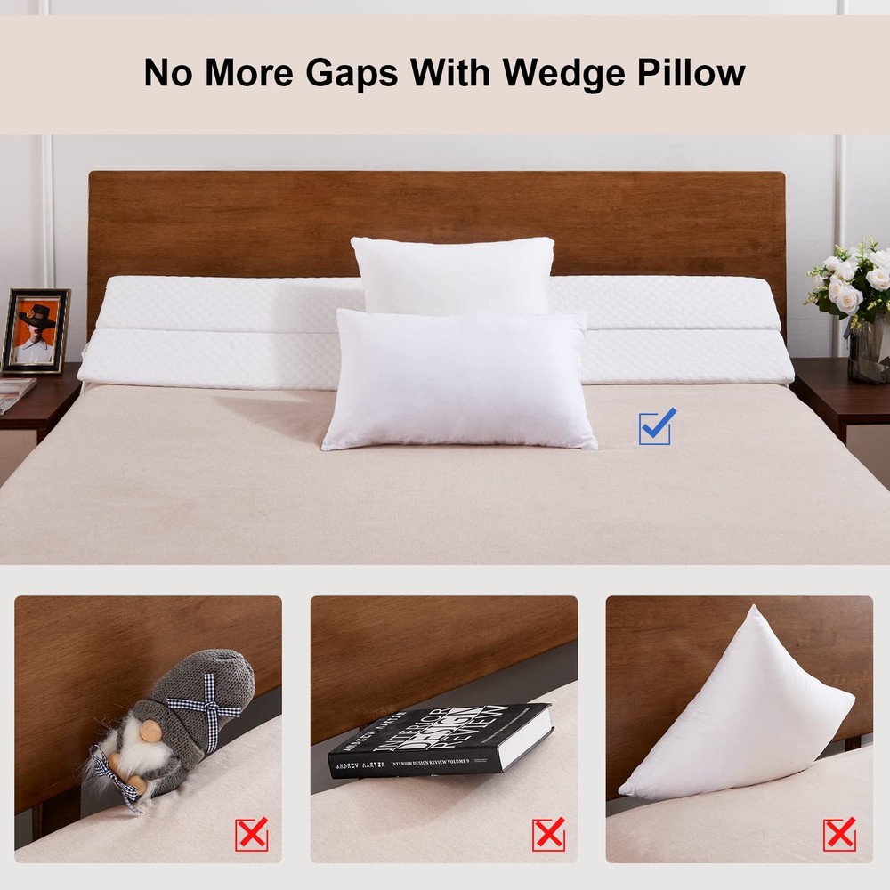 Bed Wedge Mattress Filler Pillow Close the gap between your headboard or wall, the perfect solution for preventing pillows or other items on bed from slipping off.The wedge pillow cover made with a skin-friendly, breathable fabric, have no peculiar smell, soft and silky, no pilling on the surface, precise sewing and reliable quality.Removable pillowcase with zipper, easy to clean.Long time use will not pilling, not shrink, not fade.The bed gap pillow comes with convenient pocket on both sides, which can store your phone, glasses, remotes or other small items.The bed wedge pillow can not only be used as a headboard pillow wedge, a headboard pad or as a cushion along the side of the bed, but also works great between wall and mattress, or as a sofa cushion support board, crib guardrail, etc. [★GENERAL NOTE★] - Our bed gap filler pillow is conveniently shipped using vacuum packaging for ease of transportation. We recommend that you please allow 24-72 hours for the pillow to return to its complete shape.Gently pat and knead it at regular intervals to speed up expansion.If the rebound effect is not well, recommend using steam ironing. [CLOSE 7INCH GAP] - bed wedge pillow can close close the gap (0-7'') between your headboard or wall and mattress.Effectively stop pillows, children's toys, TV remote controls, etc and sleep in peace.This kind of bed gap filler is a good helper for your bed. [HIGH DENSITY FOAM] - Our bed wedge pillow using 30D high-density quality sponge, soft and hard enough to support, high resilience to ensure multiple use to maintain its original shape.The new foam may initially have a slight, harmless odor before use.This is normal. To speed up the odor dissipation, keep it in a dry, well-ventilated place. [GOOD BED PILLOW COMPANIONS ] - Unique design mattress gap filler is adjustable to free style fill the gap as your like,the triangle on the wedge pillow can be turned over to become a rectangular pillow.It's perfect as a bed gap filler, and can also be used to elevate your head, alleviating pressure on your shoulders and neck during side and back sleeping. Use it as a back support pillow, sofa filler, arch support or foot elevator. [REMOVABLE COVER] - The headboard pillow made with a skin-friendly, breathable fabric, have no peculiar smell, soft and silky. The zipper design allows you to remove the pillowcase for replacement and cleaning.Which is machine washable and non-pilling for long time using.The headboard wedge pillowcase features reinforced pockets on both sides for convenient storage of your cell phone, remote control, glasses, and other items. With easy access at any time, enjoy the ultimate relaxation experience. [GIVE YOU THE BEST USER EXPERIENCE] - This wedge triangular pillow was designed to provide outstanding comfort and support as well as a convenience.so you never have to compromise on comfort.It also works great between wall and mattress, or as a sofa cushion support board etc.