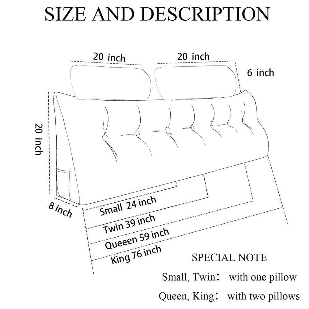 Looking for the perfect reading or bed rest pillow? Look no further! Our premium plush reading pillow is here to provide you with ultimate comfort and relaxation. Made with a soft Teddy Velvet cover, it offers a luxurious feel that you'll love. The pillow is filled with polyester fiber, ensuring excellent support for your back and neck. Available in 4 sizes - Small、Twin, Queen, and King - to suit your needs. Small、Twin size comes with one 20 x 6 inch headrest, while the Queen and King sizes come with two headrests, providing additional comfort and support. The detachable cover makes it easy to clean, keeping your pillow fresh and hygienic. The side pockets of the pillow are perfect for storing your glasses, remote control, or other small items, keeping them within reach. Whether you're reading, watching TV, or just relaxing in bed, this pillow is the ideal companion. Choose our comfortable bed rest pillow and enjoy a cozy and relaxing time in bed. Order now and experience the difference! 💦SIZE OPTIONS: Available in Four sizes—small size headboard pillow (24 x 20 x 8 inches),twin size headboard pillow (39 x 20 x 8 inches), Queen size headboard pillow (59 x 20 x 8 inches), and King size headboard pillow(79 x 20 x 8 inches)—to fit a variety of bed types. This headboard wedge pillow with 2 pack neck roll pillow large,Whether you're using it solo or sharing with a partner, offers the perfect size for your comfort. 💦COMFORT MEETS SUPPORT: this wedge headboard pillow,Filled with high-quality polyester, provides the ideal balance of soft comfort and firm support,with 2 pack neck roll pillow large, helping you maintain the right posture while reading, watching TV, or resting, relieving pressure on your back and neck,can relieve snoring,Relieve fatigue and pain. 💦SELECTED TEDDY VELVET FABRIC: the velvet surface is fluffy and soft, not easy to shed hair, and it feels like petting a cat when you touch the skin. The velvet has high density, is moisture-absorbent and breathable, and feels comfortable, just like falling into a soft embrace, just right in comfort, allowing the body and mind to enjoy the happiness of being wrapped in softness.Three-dimensional edging, wear-resistant and durable. 💦EASY TO CLEAN:The removable pillow cover makes cleaning easy, allowing you to keep your pillow fresh and clean with minimal effort., Can be hand washed, machine washable, and dryable.The intimate pocket design on the side is intimate and user-friendly, and can be used to place small items such as mobile phones, glasses, remote controls, etc. 💦VERSATILE DESIGN FOR ANY SPACE: This triangle headboard pillow is a perfect addition to any bedroom, living room, or reading nook. Whether you're lounging, reading, or using it as a bedrest pillow,just like falling into a soft embrace, making the hours before bed more lazy and comfortable. Thiswedge pillow is not only a pillow, but also a cushion, leg support, and waist support. You can place it however you want.