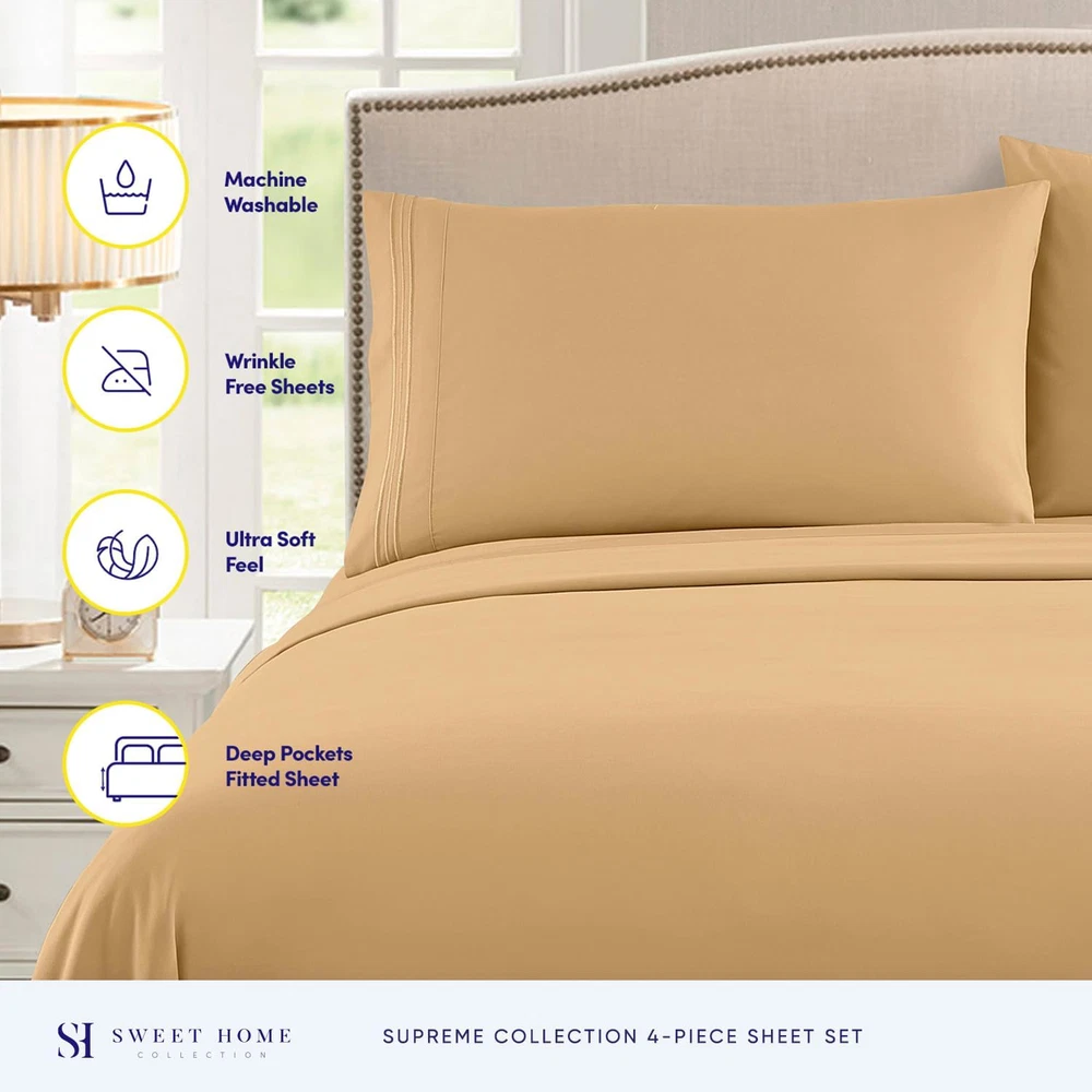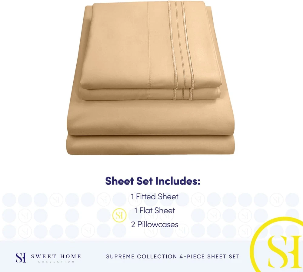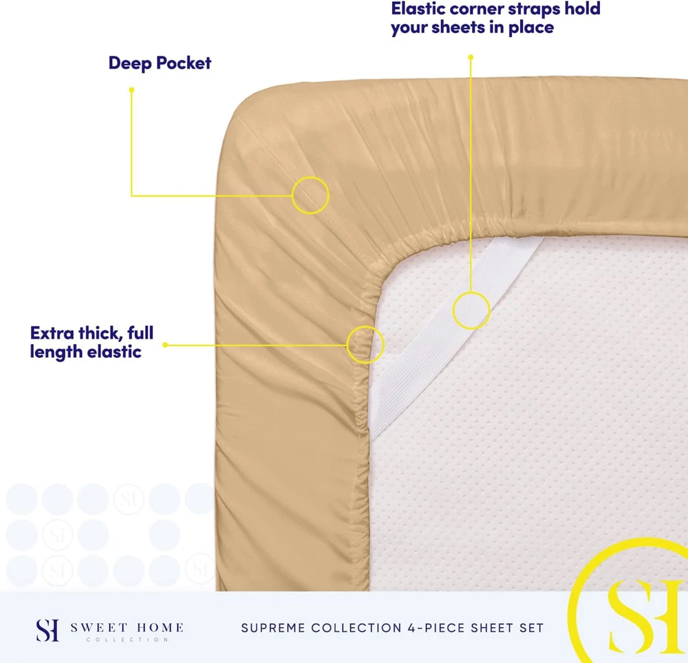 Fast Shipping Great Customer Support Satisfaction Guaranteed DESCRIPTION Shipping Shipping Shipping All domestic packages are shipped for Free (Unless other shipping method was selected during the checkout) Most items ship and arrive much sooner than the estimate delivery date. Usually within 2-3 days from payment. However, we have longer estimates to compensate for the occasional delay or supply chain breakdown. We do not accept P.O. BOXES - PLEASE PROVIDE A PHYSICAL ADDRESS Return Return Return In the event that you would like to return your purchase, we allow returns that are processed within the defined return date (the return date is to be found in the return policy/shipping and handling section) Please contact us for a return authorization and the return shipping address. Payment Payment Payment PayPal is our preferred method of payments it's the quickest, easiest and most secure way to pay for your goods or services online. PayPal offers buyer and seller protection should there be a problem. If you do not have a PayPal account, to get started and buy your first item with us is very easy. Simply click on the 'Buy It Now' button and follow the eBay checkout steps. Select PayPal as the payment method you then will be given the chance to enter your card details in to PayPal's secure checkout in order to pay for your order. Once the payment has been made, you will then be given the opportunity to make your own PayPal account to make paying for your items in the future very easy. Should there be a problem with payment please do let us know. Feedback Feedback Feedback Customer satisfaction is very important to us. If you have any problem with your order,please contact us and we will do our best to make you satisfied, please do not leave a negative feedback before we resolve your problem. We guarantee that your issue will be solved quickly. As long as you are happy with your purchase of , please leave us a positive feedback. Your feedback is very important to us it affects our search placement on eBay. We will leave a positive feedback for you in return automatically once we receive your feedback. Contact Us Contact Us Contact Us If you have any queries, please contact us via ebay. We usually respond within 24 hours on weekdays. Thank you for visiting our ebay store! ELASTIC CORNERS BUILT IN - What separates our bed sheets from the rest are the special elastic sheet straps built in. These elastic corners keep your fitted sheet secure to the bed and come on all of our sheets. LAY IN LUXURY – No more sleepless nights on uncomfortably itchy sheets! Sleep soundly on the softest 1800 Supreme Collection sheets. Be warned, though: You may never be an early bird again! SUPERB SHEET SET – Each luxurious set has 1 fitted, 1 flat sheet, and 2 pillowcases (NOTE: Twin & Twin XL sizes include 1 pillowcase). Deep pockets, thick elastic, and BUILT IN SHEET STRAPS make your new soft sheets stay in place! STAY CLEANER, LONGER – Who has time to wash their sheets every few nights? When it’s time for a wash, machine wash cold, and tumble dry low. PERFECT FIT FOR ANY BED – Sleep soundly for years to come! Your deep pocket sheets are fade, shrink, and wrinkle resistant. We’ve got you (and your bed) covered. Good rest comes cheap! Cheap sheets are usually itchy, uncomfortable, and the enemy of good sleep. Not Sweet Home Collection’s luxury sheet set, though! Our brushed microfiber 1800 Supreme Collection Sheets are cooling, comfortable, and luxurious at an affordable price! No more dreading lying down on scratchy sheets. These soft luxury bed sheets promise rest and relaxation so you get the shuteye you need to start every day fully charged. No matter what you sleep on, we have the sheets for you! Ill-fitting sheets make for an unsatisfying night’s sleep. Whatever size your mattress is, Sweet Home Collection has the perfectly fitted sheet set for you! Our sheet sets come in twin, twin XL, full, queen, king, and California king sizes to give everyone in the family a good night’s rest. Here are the measurements for the different bed sizes: Twin Sheets Queen Size Luxury Breathable Bed Sheets Set - 1800 Supreme Extra Soft Camel Click here to see description Fast Shipping Great Customer Support Satisfaction Guaranteed DESCRIPTION Shipping All domestic packages are shipped for Free (Unless other shipping method was selected during the checkout) We ship within two business days of payment, usually sooner Standard FREE shipping takes between 3-5 business days Expedited shipping takes between 2-3 business days Overnight shipping takes between 1-2 business days We do not accept P.O. BOXES - PLEASE PROVIDE A PHYSICAL ADDRESS We Ship Globally using ebay's GSP, the item is sent to a logistic center in KY and shipped from there to the rest of the world. International customers are responsible for all duties and taxes Contact your local authority for questions related to the amount of duties or taxes you will be responsible for Return In the event that you would like to return your purchase, we allow returns that are processed within the defined return date (the return date is to be found in the return policy/shipping and handling section) Please contact us for a return authorization and the return shipping address. Please contact us for a Return Merchandise Authorization (RMA) number. We advise you to use a reputable carrier service when returning your goods. Please pack all returns appropriately. We ship globally Via eBay's global shipping program (GSP). Thus we don't cover returns for items shipped globally. Buyers returning such items will be refunded ONLY for the item's cost and not for the shipping. please check the Voltage information and make sure it matches the one in your country. In case it's not stated in the description, do ask us. Payment PayPal is our preferred method of payments it's the quickest, easiest and most secure way to pay for your goods or services online. PayPal offers buyer and sel