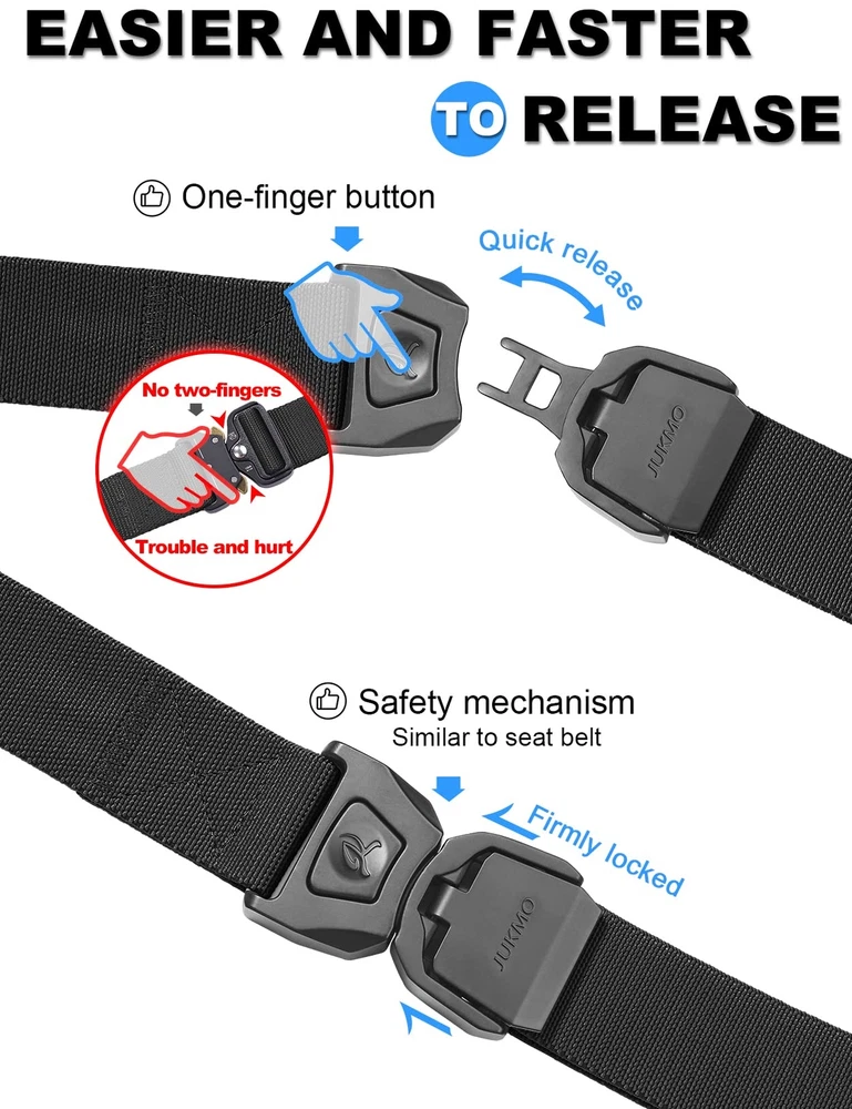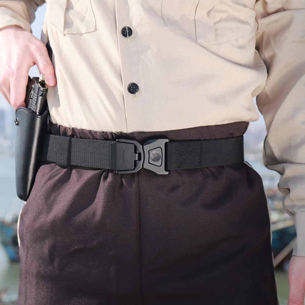 ONE BUTTON QUICK RELEASE BUCKLE – The crafted heavy-duty buckle is made of zinc alloy. As long as you push the button on the buckle, the buckle would release instantly. It is super convenient to release your pants for doing whatever you want to do. You would never meet a belt so quick convenient like this. The designed buckle has very strong load-bearing capacity, which can meet your different wearing requirements HIGH QULITY STRETCH NYLON – We intent to make the strap be stretch. The strap is made by special stretch material which is more solid than regular belt. More than that, it is very sturdy as well as stretch, which make your waist be more comfortable as well as stay tight, when you take large range of activities. Anyone who do physical activities for a long period of hours will get a great use out of the tactical belt FOR SPECIAL YOU – Our solid belt suits for military, SWAT, fire fighters, work, sport and other tactical users. Anyone who need to take any activity will be in harmony with the belt AS A PRESENT – Our elaborate belt is enclosed in an elegant gift box for you giving whoever you love, or yourself SHOPPING GUARANTEE – If you meet any problems after purchasing the belt, it is free to return or replace. If it past the return time, please don't hesitate to contact us by Amazon message. We promise to provide you 100% satisfying guarantee.
