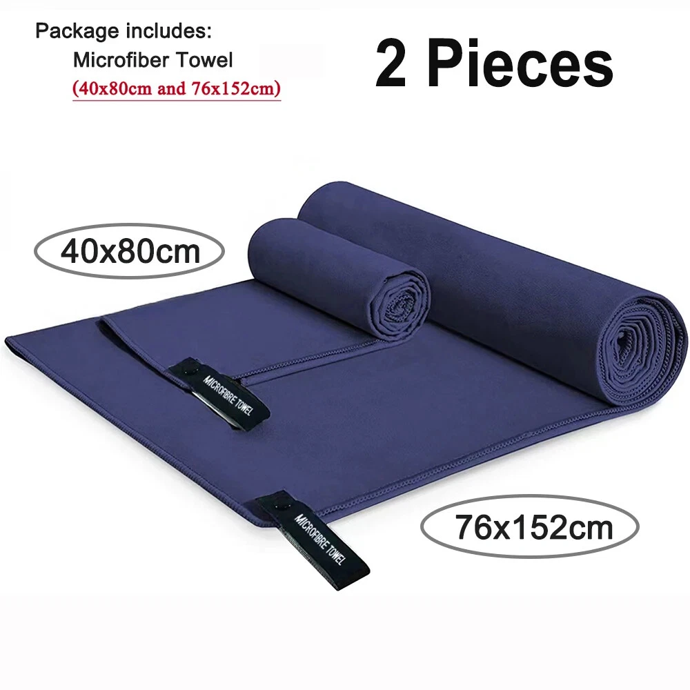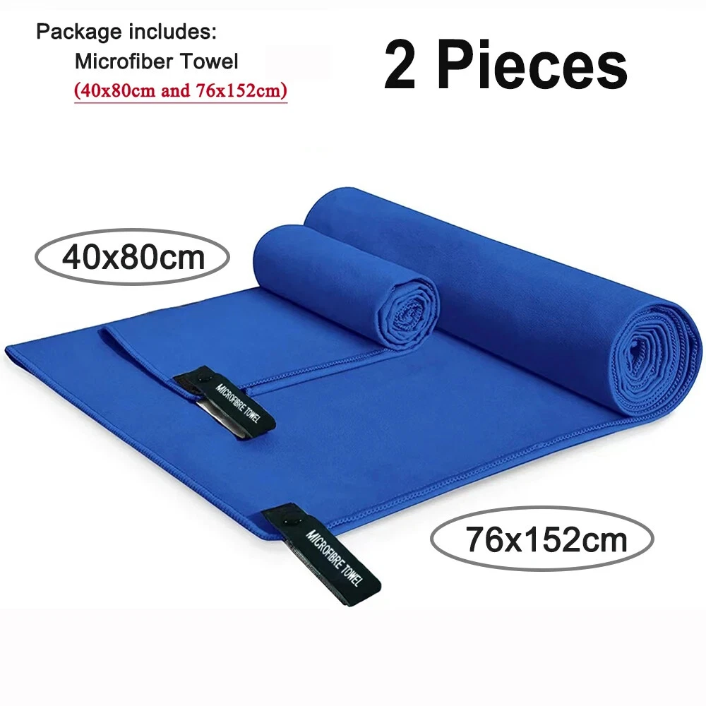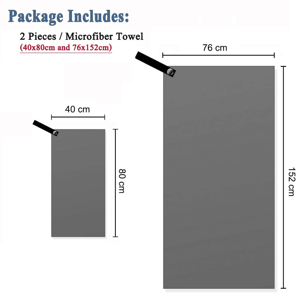 Quick Drying Microfiber Towels / Beach Towel / Sports Travel Swimming Towel / 2 Pieces Two pieces towel includes : One face/hand towel 40x80cm with one Extra Large 76x152cm Ultra-Soft microfiber fast drying towel Quick Drying : Dry up to 10 times faster than normal towels. Hang it outside and it will be dry very soon. Super Absorbent: This Ultra-Soft towel can hold up to 5 times water of it's weight. Easy to Carry Out: Light weight towels come with one carry bag. Towels with sturdy snap loop. Perfect for hanging out to dry.
