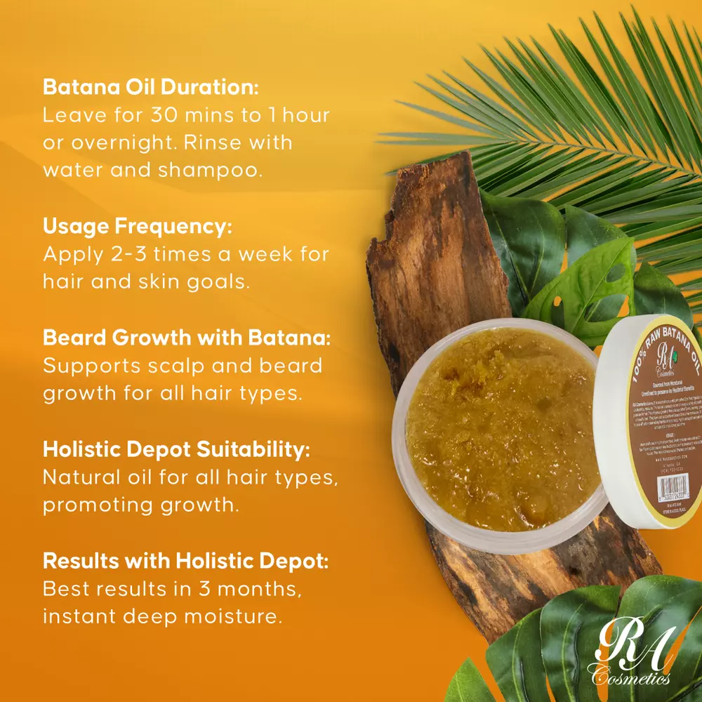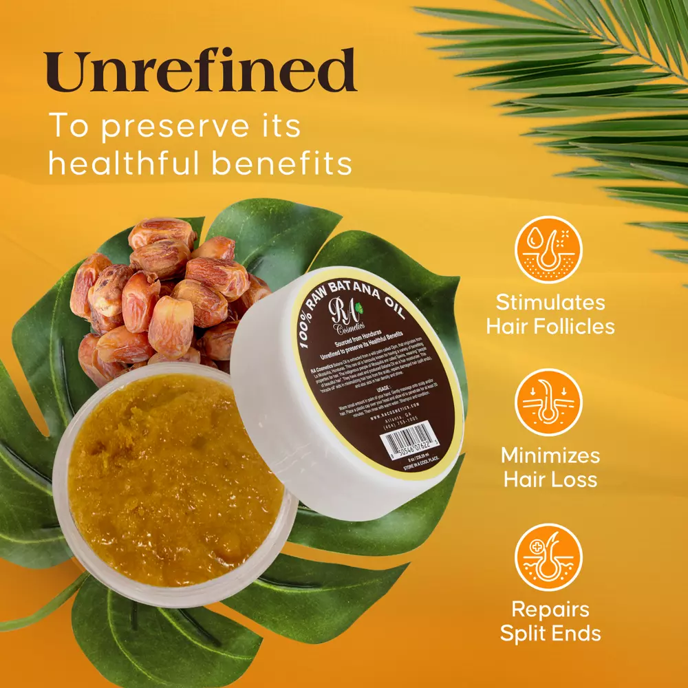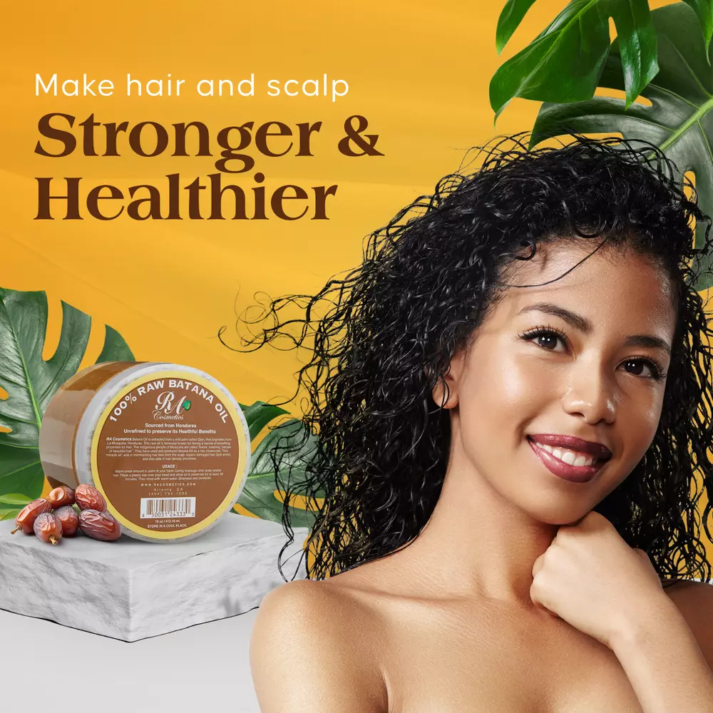 Nourish Your Hair Naturally: Experience the power of RA Cosmetics 100% Natural Batana Hair Oil, sourced from Honduras. This unrefined oil is packed with vitamins, derived from the nut of the South American Palm Tree, providing your hair with natural nourishment. Hair Strength and Vitality: Elevate your hair care routine with our Unrefined Batana Oil, known for its ability to strengthen and nourish hair. Restore vitality to your locks while controlling hair breakage and promote overall hair health with our natural solution. Versatile Daily Moisturizer: Pamper your hair and scalp daily with Batana Oil as a moisturizer. Its lightweight yet deeply penetrating formula provides a natural sheen and hydration, leaving your hair feeling soft and manageable. Indigenous Beauty Secret: Uncover the beauty secret that has been passed down through generations among South American indigenous peoples. Batana Oil is not just a product; it's a tradition of care and nourishment that brings you closer to the roots of natural beauty. Intensive Oil Treatment for Luxurious Locks: Unlock the secret to luscious, radiant hair by incorporating Batana Oil into your deep conditioning routine. Warm a small amount, massage onto the scalp and hair, and let the oil work its magic. Rinse after 20 minutes for a salon-like treatment at home