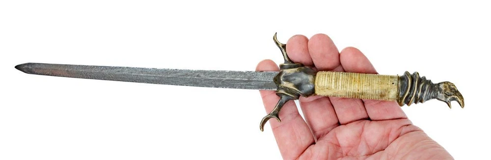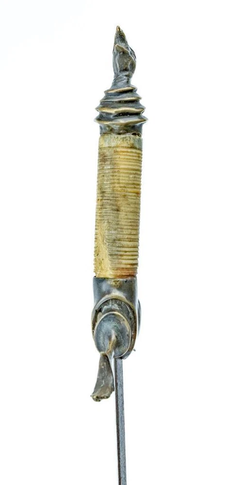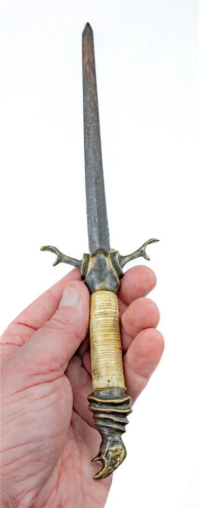 ( CELL PHONE USERS PLEASE CLICK THE "SEE FULL DESCRIPTION" LINK BELOW FOR MORE DETAILS AND PHOTOGRAPHS! ) Original 18th C. German Naval Vulture Head Stiletto Dirk Dagger Double Edged Blade & Carved Handle Original 18th C. German Naval Vulture Head Stiletto Dirk Dagger Double Edged Blade & Carved Handle Click images to enlarge Description Up for Consideration is a Rare Beautiful Original Late 18th Century, c.1770's-1810 German Stiletto Style Dirk / Dagger, 5.0 inch Double Edged Blade, Ornate Brass Antler Crossguard, Turned Ox-Bone Grip set with Brass Vulture Head Pommel! c1770-1810 Offered to you is this Amazing Very Unique late 18th Century to early 19th century Custom Made German or Spanish Naval Stiletto Style Dirk or Dagger measuring 14.0 inches long total with a 9.25 inch Double Edge Blade. Beautiful 5.50 inches Carved and turned Ox-Bone Handle. Brass Stag Antler Crossguard and an exquisite Vulture or Baby Eagle head pommel are Beautifully detailed and tight. Most likely a Late Revolutionary War to Napoleonic War Naval Dirk as it Originally came out of a Naval Military Museum in Edinburgh, Scotland 20 years ago o as since has been on display in a private Museum in Worcester, Massachusetts ever since. We have tried to locate a similar example of this Stiletto Style Dirk / Dagger and have come up with nothing believing this was a custom made piece! No Hallmarks present. Very Good condition Hilt and blade are nice and tight! As our High Resolution Photographs are an Important Part of Our Description and as All Sales are Final Please Note All Images to assess your own opinion before bidding! We are Happy to combine Shipping Costs for Multiple Orders but please let us know before you pay for your items! *No International Sales or Shipping and we are Sorry for Any Inconvenience. Your Postage Includes: Tracking, Full Insurance and all Materials! Please feel free to Email Us with any questions! Thanks for Looking! Payment Payment method : We accept PayPal ,Google Pay, Visa, Master Card, Amex & Discover through EBay! Payment is expected within 48 hours of auction close and we are glad to combine shipping Costs on Multiple Orders! If payment is Not Received within 48 hours and Payment arrangement have not been made in advance, a Non-Payer case will be filed automatically against you through Ebay! All Non-Paying buyers will be Blocked from bidding on our items in the future and your Actions will be noted in our Feedback Forum to warn other Sellers! Shipping We will combine shipping on multiple orders, please let us know before you pay for your items! US shipping only. Postage includes: shipping, tracking, insurance and materials. No International Sales or Shipping! Sorry for any Inconvenience! O.N.T Terms of Sale Payment is expected within 24 hours of Auction close and we are glad to combine shipping Costs on Multiple Orders! Returns Accepted ONLY if the item listed is Grossly described Incorrectly. Buyers have 2 days to inform us of a problem & Return the item back to us! Buyer is responsible for the Cost of Returning the Item! Other than this ALL SALES are FINAL! US Shipping only! No International Shipping! - Sorry Thank you! Our New England Treasures 4u! About Us About our Company: We are a small company based in New England who is not new to eBay or online auctions by any means but rather took a 5 year break from selling on this site to travel throughout the states collecting and picking Americas finest treasures! We are dedicated to offering the rarest and most unusual Antiquities from Vintage Jewelry & Watches, Rare Books, Ephemera, Historical Autographs and Manuscripts, Revolutionary & Civil War Military, Art Glass & Pottery, Rare Original At, Fraternal, Political, Boy Scout Advertising, Primitives, Folk Art and just the weirdest damn items that you can find out there to offer you for sale and we have a warehouse full of it! We do not like fixed priced auctions or reserved prices, and we will start each and every one of our auctions at a .99 cent starting price! We do our best to describe everything accurately and stand by our items with a 100% money back is guarantee on anything we sell! Please never hesitate to contact us with questions on items or to contact me with requests for items you may be searching for as we just may have it and we will gladly put them up for auction for you! We hope you enjoy our wonderful treasures! Good Luck Bidding! - New England Treasures Antique Emporium Pictures sell! Auctiva offers Free Image Hosting and Editing. 300+ Listing Templates! Auctiva gets you noticed! The complete eBay Selling Solution. Track Page Views With Auctiva's Counter