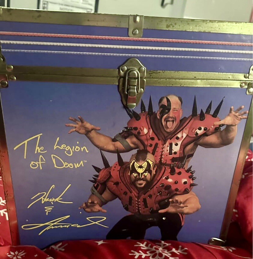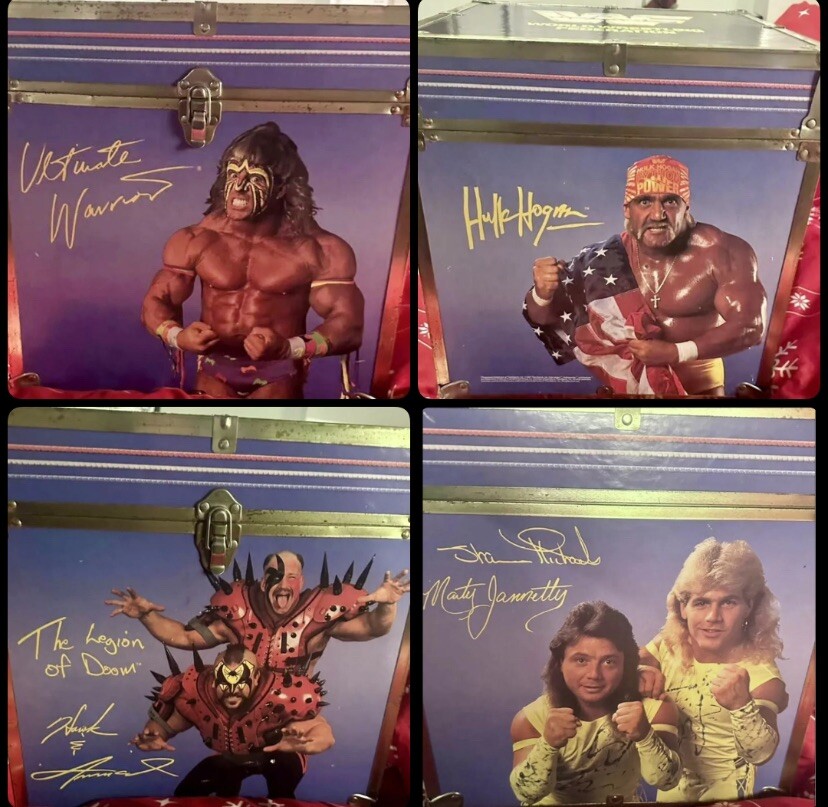 This is a 1991 WWF Wooden Toy Chest Cube, one of the rarest and most unique collectibles from the golden era of wrestling. ✅ Legends Featured • Hulk Hogan (deceased 2025) • Ultimate Warrior (deceased 2014) • Legion of Doom – Road Warrior Hawk & Animal (both deceased) • *The Rockers (Shawn Michaels & Marty Jannetty) • Classic WWF block logo on the lid ✅ Size & Build • Measures approx. 16 ″ × 16 ″ × 16 ″ • Solid wood construction with metal-reinforced corners and functional latches • Designed as a toy chest but now a true display centerpiece ✅ Condition This chest does show visible wear from age, so please review all photos carefully. However, compared to others on the market, this is the best conditioned example currently available. The graphics remain vibrant and intact, making it stand out as a premium piece. ✅ Collectibility With most of the featured wrestlers having sadly passed away, including Hulk Hogan’s recent passing in 2025, items like this have become exceptionally scarce and highly sought after. It represents not just a storage chest, but a piece of wrestling history. ⸻ ✨ A true grail item for any WWF collector — both a nostalgic display piece and a valuable long-term investment.