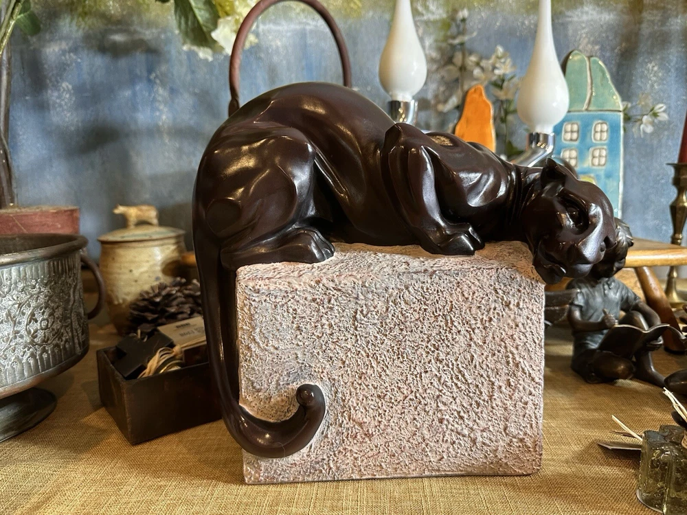 SEE VIDEO to appreciate this signed RARE original Alexsander Danel (America, 1940-2001) sculpture. This is a large art deco sculpture of a brown panther created in1996 by American artist Alexsander Danel for Austin Productions. The piece is dated with year, signature of the artist, and the production whom the piece was made for on the two corners of the sculpture. The sculpture is made of polychrome and stone, showcasing modernist style. It is a rare piece signed by the artist, measuring 12 inches in length, 11 inches in height, and 4 inches in width. This unique and original statue of this gorgeous panther captures the essence of the artist's work and is a valuable addition to any art collection. This piece is vintage as it is over 30 years old. These are very rare to find and more so over the past 10 years. Alexsander (sometime people write Alexander) Danel's sculpture are not only sought after but are collector pieces --- What a great find, indeed! A large art deco sculpture of a Panther designed by Alexsander Danel for Austin Sculptures, dates 1996. Presents marks of use and wear. Offering a regal and modernist/art deco style large sculpture: The artist Alexsander Danel for Austin Products. Dated 1990 is signed A. Danel. In good vintage condition. Very minor one or two tiny paint chips on the back, not even worth mentioning, but of course, one must. A very handsome animal and impressive molded rendering. You will receive Alexsander Danel's sculpture that is within the pictures. You may see other items in the background, as well. If you are new here, these are items that will be listed and in my Ebay shop either this week or next week. So, you get a sneak peak of what is coming up next!! :) Here is my Ebay shop : YouBeYou LLC MORE ABOUT THE ERA OF THIS PIECE This piece is the result of a deep knowledge of animal anatomy, inspired by the panthers made during the Art Deco period (20-30's). Among all the representations of wild animals in Art Deco, the panther motif was particularly common and Alexsander Danel was the most sought after artist of that time and even today! The artist's quality and elegance were especially valued. The representation of wild animals was one of the most frequent themes during the Art Deco period, since this was the time of the discovery of wild Africa, mainly by reporters covering the new rallies. European society was fascinated by the exotic fauna in freedom, a reflection of a world still to be exploited, still far from the control imposed by civilization. If you have any questions even after you have purchased the item --- I am here for you to answer any questions that you may have! I strive to work diligently with every buyer to ensure they are a satisfied buyer, so please contact me anytime. This is a pre-owned item and I take great care to accurately describe the item but please see the pictures for full details. While we do our best to list every item in detail, these are vintage and pre-owned items, and some flaws are to be expected. Please see all photos/ video as they are a large part of the description of our items. Items come from a smoke-free environment. Each item is described in accurate detail with multiple measurements and various photos at different angles front and back, side to side, top and bottom. I have additional similar items that I have yet to list that you may be interested in. Feel free to follow my store ( YouBeYou LLC ) to see those when posted. Please see all photos/ video as they are a large part of the description of our items. I strive to make every purchase a pleasant experience. Please feel confidence in you purchase that I'll make every effort to correct any issues that may arise. If used, there are always some signs of wear -- well, because it is used, vintage, or antique. Most items are used -- Each item is inspected for quality. It is very important to us that you have a happy Ebay experience! Thank you for supporting a small business like ours! (Note: pictures may include measurements, and some have a video.)