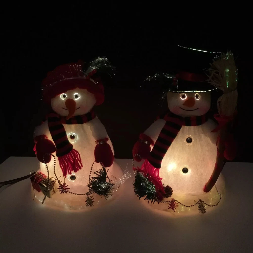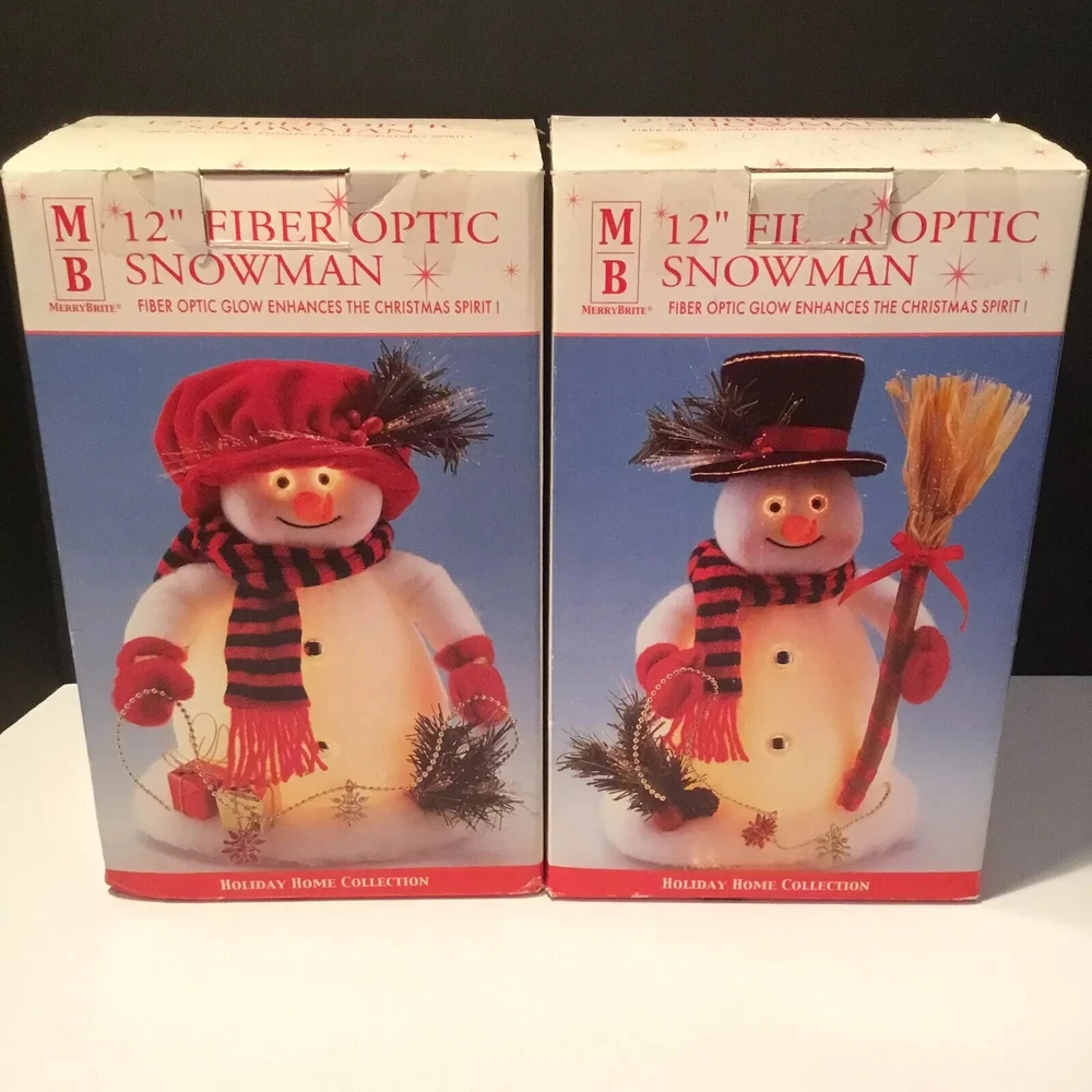 This is a rare Mr. & Mrs. Snowman fiber optic table top plush from 2002, perfect for the Christmas season. The snowman figurines stand 12 inches tall and feature color-changing lights. The design includes animation and seasonal themes, made from mixed materials. A unique and festive collectible for holiday decor. Exact items pictured are what you will receive.