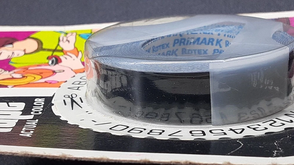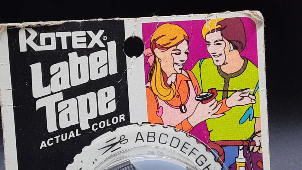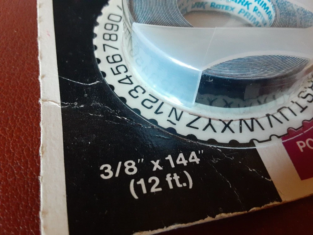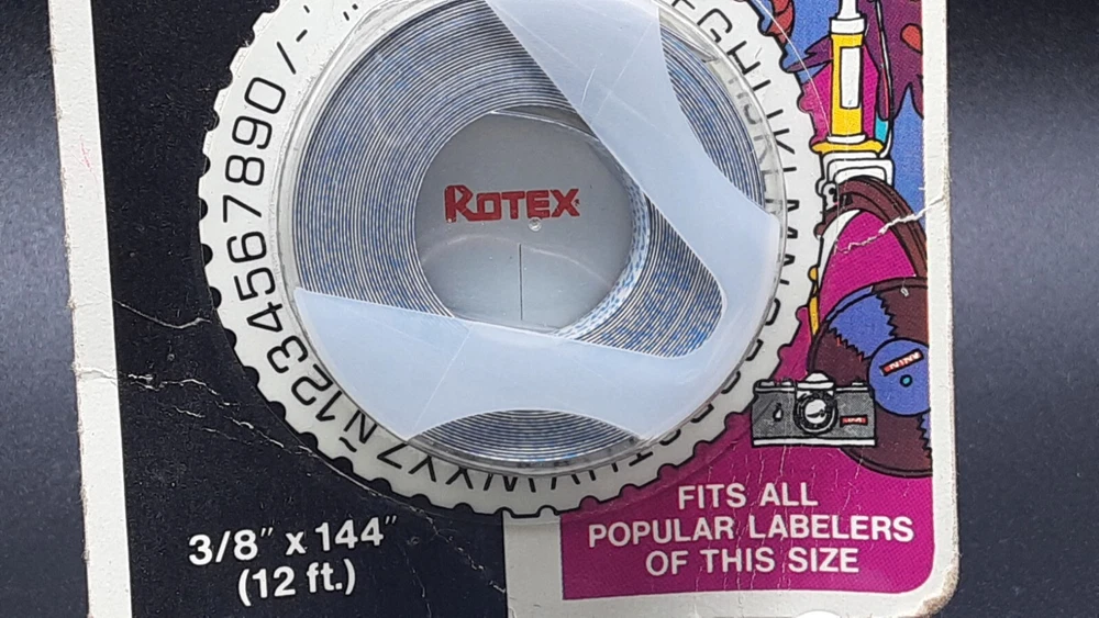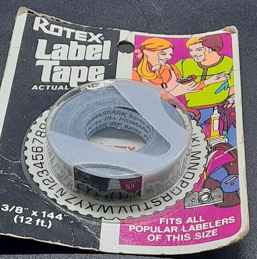 RARE Rotex Authenic Vintage 70s Label Maker TAPE Refill Black retro graphics NOS I believe this is one of those cases when the accessory is worth more than its machine..very hard to find this on a pictorial card, probably will be desired more as a collectible of that era than for actual use. This is for TAPE ONLY, no labeler included. Color is black and the tape measure 3/8" x 144" (12 ft) packaging has a little wear. i have lots of vintage items!