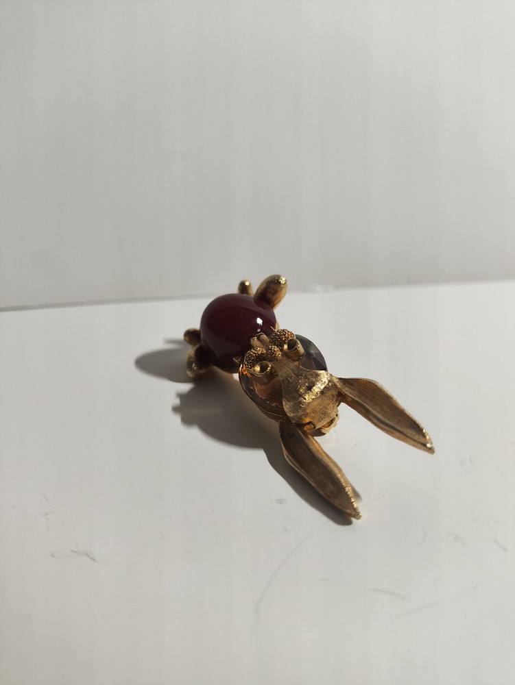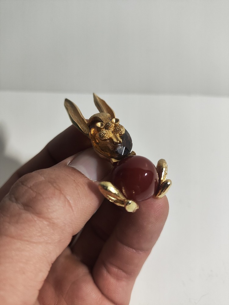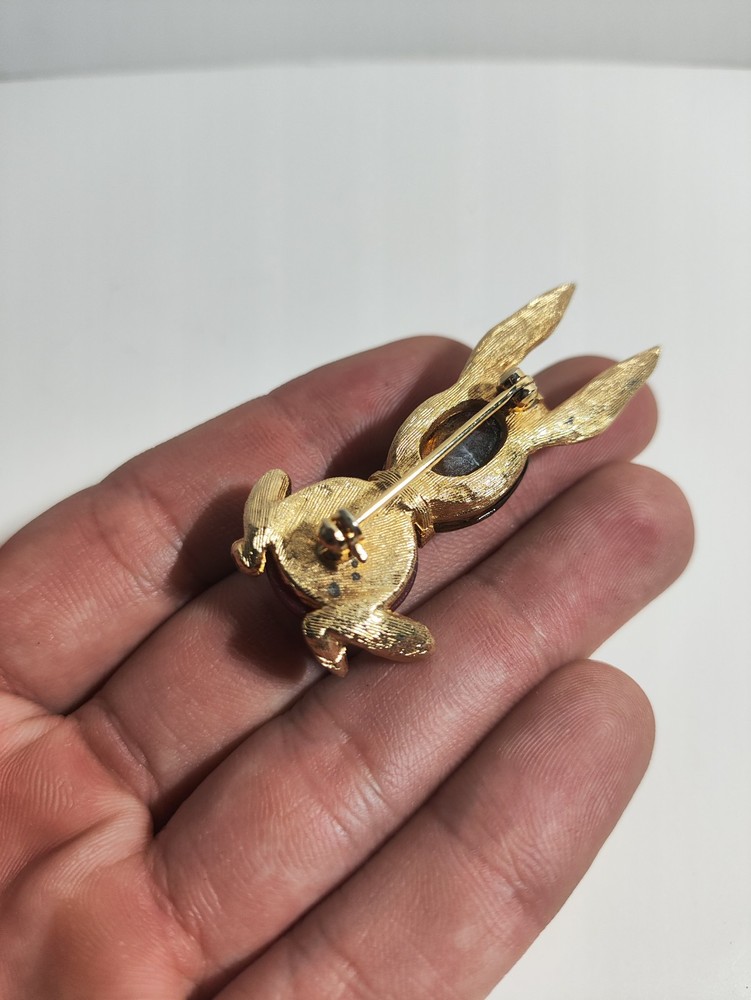 Disclaimer - theres not gems in the eyes of the bunny. The price is reflected by this. Elevate your jewelry collection with the rare vintage Rabbit Figural Brooch, a delightful piece from Jelly Belly that exudes timeless charm. This exquisite brooch features a pink glass main stone, complemented by sparkling rhinestones, all set upon a lustrous gold-plated base that adds a touch of luxury to this delightful lapel pin. Crafted with meticulous attention to detail, the brooch showcases a playful bunny design, bringing a whimsical flair to any outfit. Whether pinned to a jacket or scarf, this elegant accessory is sure to make a statement and become a treasured addition to your collection.