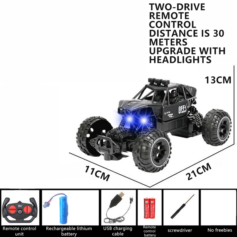 RC 4X4 Off-Road Car: Remote Control Buggy Truck with LED Lights, Great Gift Exciting Remote Control Car Versions for Every Adventurer The 7.87-inch version is a compact option without LED warning flash features, **Car Size and Specifications** the 7.87-inch version, measured at a 1:20 scale, operates on a 2WD system, but its remote control range is limited to 10 meters. Please be mindful of these differences when choosing your car. Car size: 21*11*13cm Features for Maximum Fun These cutting-edge remote control cars are the newest additions to the market, offering various exciting features. With a suspension shockproof system designed to protect the car during rough play, sturdy rubber wheels for an anti-skid experience, and the flexibility to traverse ground, grass, or sand, these cars are perfect for outdoor adventures. Whether you're a child or an adult, these RC cars are guaranteed to provide endless enjoyment and excitement for all ages. Charging time: 2.5h Battery life: 30 minutes Remote control distance: 20 meters Speed: 15km/h Remote control battery: 2 AA batteries not included 100% brand new, high quality. Packing List: 1 x Rc car 1* Transmitter 1* Battery 1* USB cable