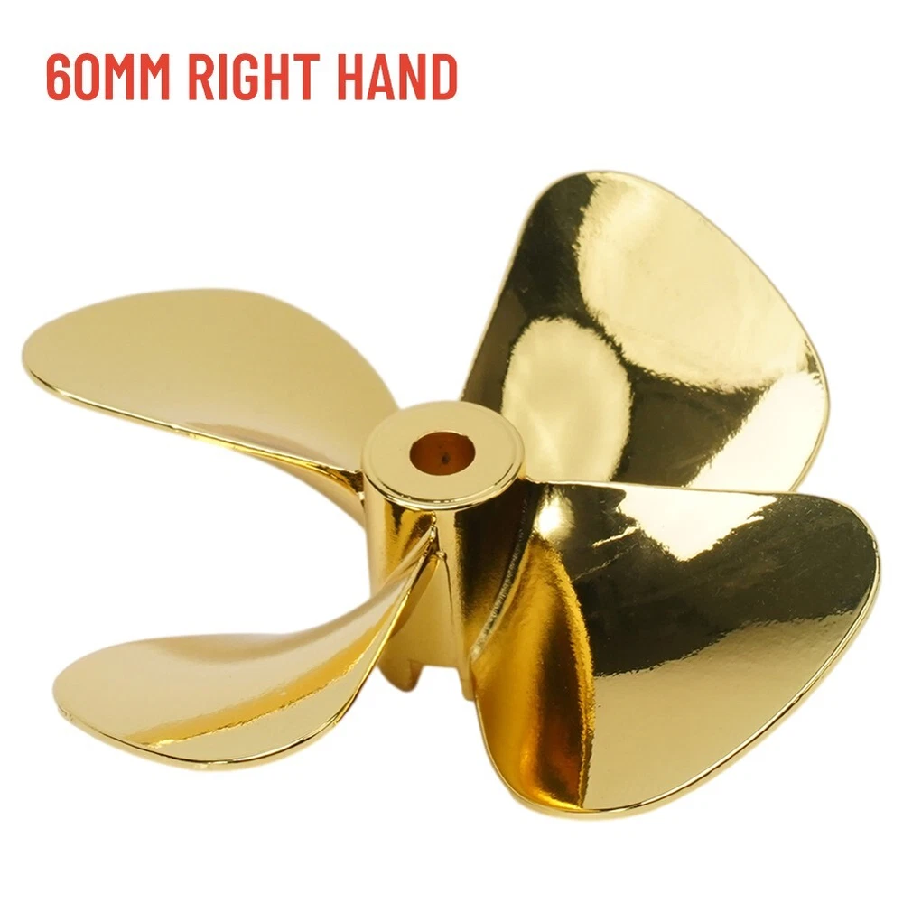 RC Boat Model 55mm/60mm Metal Propeller 4 Blades 4mm Shaft For RC Marine ROV Au DESCRIPTION Features: * brand new and high quality. *These 4-blades metal propellers are for RC boat, heavy boat, tug boat, fishing bait boat, wood boat, Marine, ROV etc. *This propeller is made of Zinc Alloy, with gold color plate. it is made by casting,it is strong and . *It works with propeller drive dogs.( Not include in listing ) *There are two sizes propellers optional,left-hand and right-hand available: D55mm:Rotating Diameter 55mm, Hub height: 17mm D60mm:Rotating Diameter 60mm, Hub Height: 17mm Tips: Right-Hand(RH):which rotates clockwise as viewed from the stern when in forward gear Left-Hand(LH):which rotates counter clockwise as viewed from the stern when in forward gear Please note: Affected by manufacturing process,the shaft hole diameter is about 4.15mm, It is not tightly matched with 4mm shaft. so it is not suitable for speed boat. and you have to adjust the balance of the propeller through the propeller drive dog and fixing nut. Specification: *Material: Zinc Alloy *Made by Casting, With gold color plate *Shaft hole diameter: 4.15mm, Fit 4mm diameter drive shaft *Rotating Diameter: 55mm/60mm (optional) *Type: Right-Hand / Left-Hand Propeller (optional) Package Contents: 1* Propeller Prop Note: 1. The real color of the item may be slightly different from the pictures shown on website caused by many factors such as brightness of your monitor and light brightness. 2. Please allow slight manual measurement deviation for the data. POLICES Shipping Payment WARRANTY We only ship to confirmed ebay Order addresses. Please comfirm that your Order address is in line with your shipping address. Please kindly note that the c ombined shipping is not provided because the shipping fee is calculated by weight. Also, the each additional item means exactly the the same color and size. It takes about 7 -15 working days to US; about 10-30 working days to other countries. Transit time may be a little delayed because of the bad weather and customs inspection . If you do not receive your item within 30 working days since payment finished, please contact us immediately for further assistance. Payment must be completed within 5 days. If you have any problems about payment, please contact us via ebay message. We strive for 100% customer satisfaction! Positive Feedback is very important to us. If you have any questions, p lease feel free to contact us via "Ask seller a question" . We will reply your email within 24 working hours.