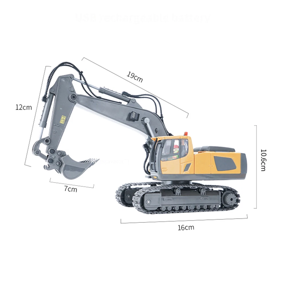 Channel: 11CH Item Name: RC Excavator Main Color: Yellow, Black Material: ABS+ Electronic Component Running Time: 240mins gtin13: Does not Apply Brand: Unbranded/Generic Control Distance: About 30m MPN: Does not Apply Battery: 3.7V 1200mAh Rechargeable Battery (Included) ASIN: B0B9SS39MG Frequency: 2.4GHz Fuel Type: Electric Application: Collection, Decoration, Entertainment, Gift Type: Remote Control Excavator Scale: 1/20 Battery for Transmitter: 2 * 1.5V AA Batteries (not Included) UPC: Does not Apply Base Size: 16*10.6cm, Flexible Arm: 12cm+19cm Charging Time: 140mins
