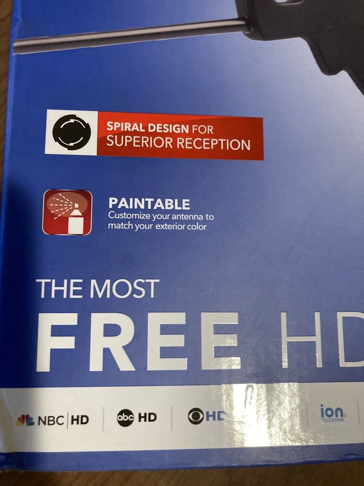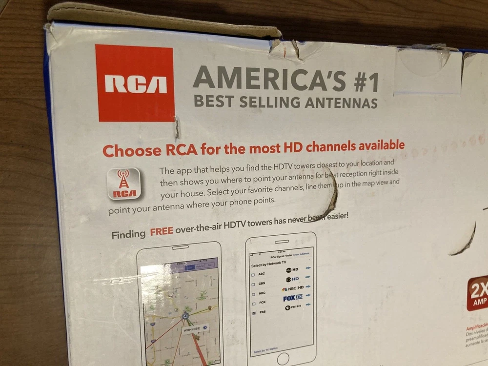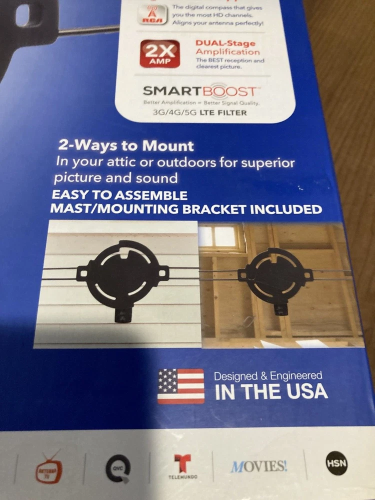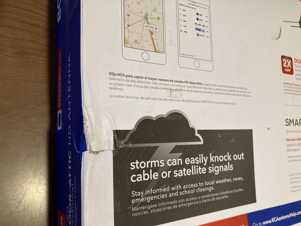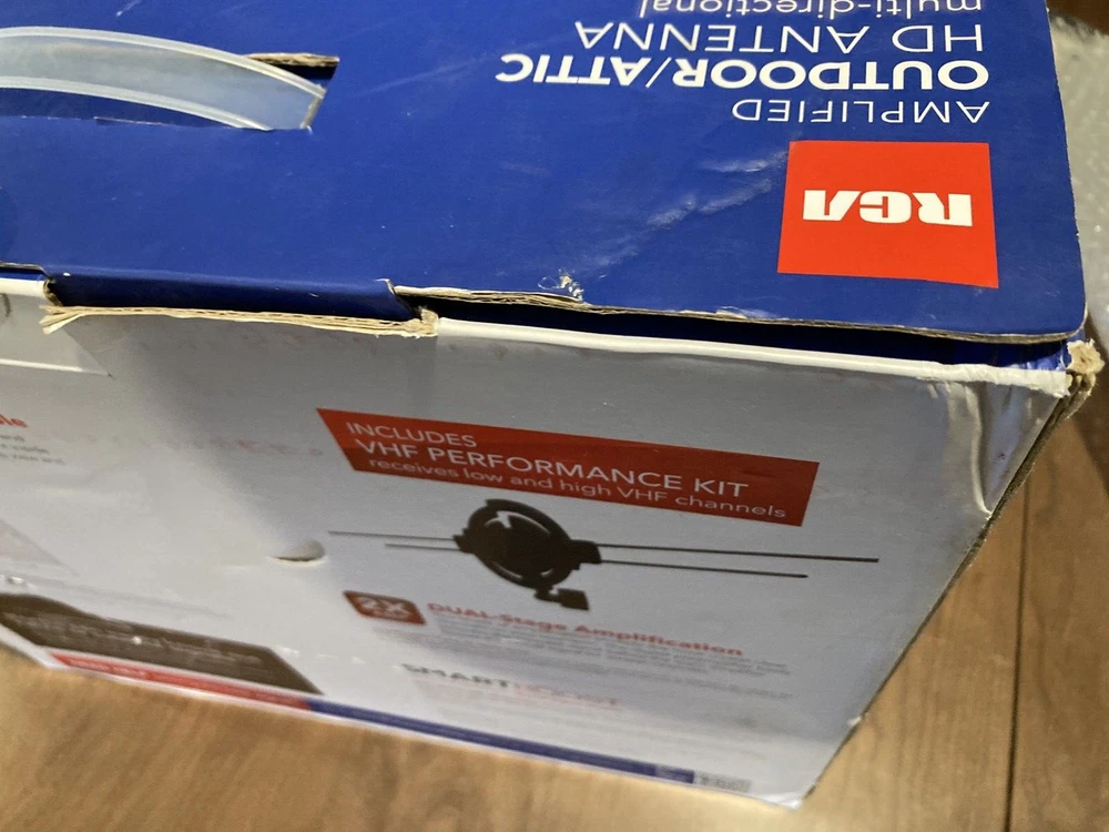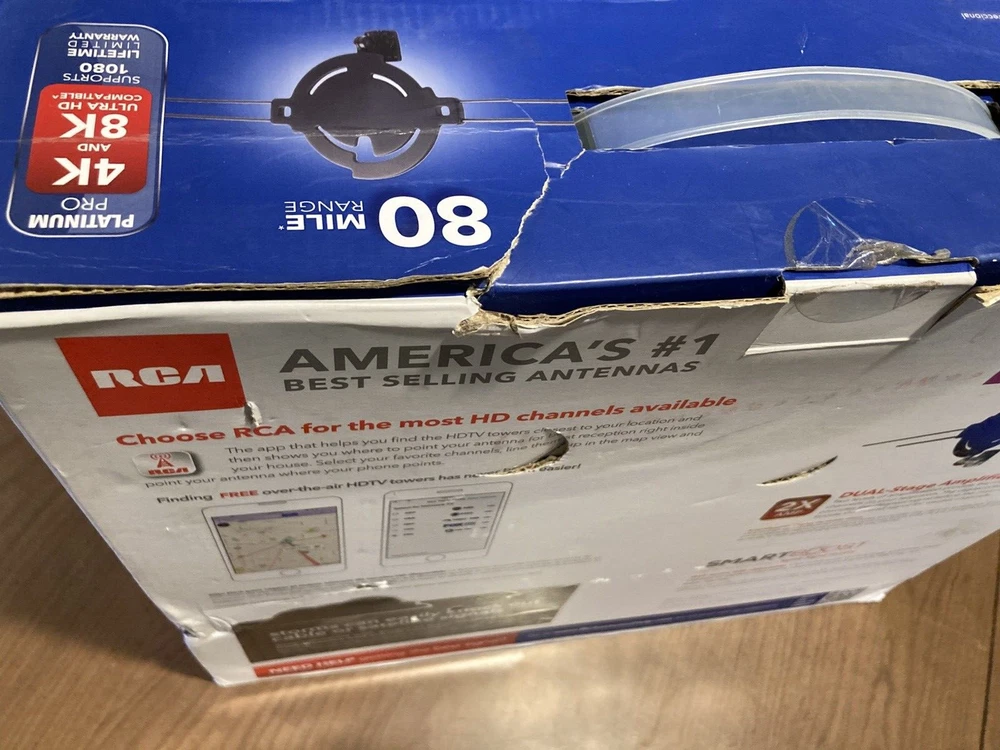 PLEASE-SEE-ALL-PICTURES RCA AMPLIFIED MULTI-DIRECTIONAL HD-ANTENNA OUTDOOR/ATTIC-MOUNT THE-MOST-FREE-HDTV PAINTABLE 80-MILE-RANGE NEW-IN-BOX BOX-HAS-BEEN-OPENED SEE-ALL-PICS-OF-BOX