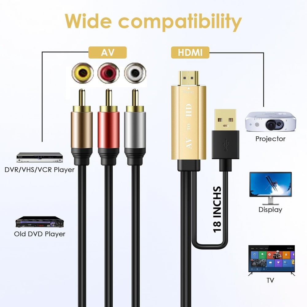 If you want to use your DVD, VCR, VHS, Android TV box, or game system with RCA output to connect to your new HDTV or HDMI, this RCA to HDMI converter is what you need. RCA to HDMI Converter Kit: Contain all necessary cables you need, such as Male RCA cable, HDMI cable, micro USB Power cable and built-in intelligent chip, no need to buy extra cable, more convenient to use. Features: Converter RCA signals into HDMI signals so you can watch your video on your HD Smart TV. No need to buy extra RCA cable and HDMI cable. No driver need,just plug and play. Helped to play your video consoles with your newer TV,then you got back to live your memories again. Allows you to view your favorite VHS tapes and preserve memories. It can bring back your family memories, relive your childhood in seconds, and it’s also a ideal choice for those who still love playing older game systems. Makes it easy to get old tech to work with new tech without a whole lot of fuss and costs. Note: This converter is not bidirectional. Just a one-way connector only, convert signal from RCA to HDMI. It can not convert HDMI to RCA. Connect old AV devices to modern HDMI-equipped TV: This RCA to HDMI converter can convert analog RCA composite input to HDMI up to1080P output. Great for using older video players with smart TV, easily connected old-school VHS/DVD/VCR player to smart TV, you can watch old equipment sources and use old game systems on new TV that may not have RCA, which can bring back your childhood memories. Perfect for making old video peripherals useful again. All in one AV to HDMI Cable Adapter: Supplied with RCA male cable, HDMI cable, and USB power cable, features a built in RCA to HDMI converter chipset, no need to buy extra cable, Hassle Free and Save you money by eliminating the need for extra components. Great For Viewing VHS and DVDs from old analog Player to New Digital TV. Easy HDMI hook up for older AV devices: Easy to use, no need any drivers, just plug to play, Please remember to hook up the USB power cable to 5V power source to make it work, you can get it to work within minutes. Note: the Audio Video cable to HDMI Converter only support converts AV to HDMI, can't converts HDMI to AV. 1080P HDMI Quality Supported: The av to hdmi converter has an built in authentic HD chip that supports advanced signal processing with great precision, colors, resolutions scale up to 1080P HDMI. Wide Compatibility: This composite to hdmi adapter is widely applied to use your old DVD, VCR, VHS, Android TV box, PS2, PS3 or game system with RCA input to connect to your new HDTV or HDMI only monitor, this RCA to HDMI converter is the right choice.