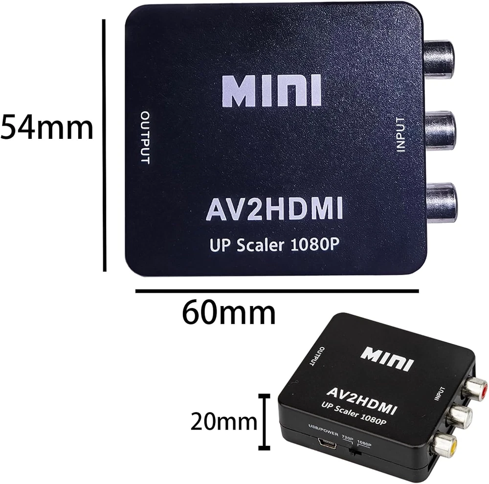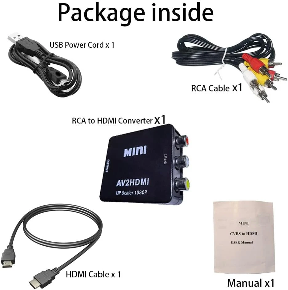 Package Set with HDMI cable x 1, RCA male cable x 1, Micro USB cable x 1, RCA HDMI adapter x 1, USER Manual x 1. Good for VHS Player, av to hdmi for VCR Player, rca to hdmi for wii and etc av cable hdmi adapter. The RCA to HDMI Converter only supports RCA to HDMI, NOT HDMI to RCA, and doesn't support the HDMI DVD player connects to your older TV with RCA ports av hdmi upscaler. Meaning RCA inputs for HDMI output only-cvbs hdmi converter The AV HDMI converter is applied for Xbox, WII, PS3, PS1, PS2, STB, VHS, N64, VCR, DVD Players and others devices with composite AV input vcr hdmi converter. Composite hdmi adapter TV formats such as PAL, NTSC4.43, SECAM, NTSC3.58, PAL/N, PAL/M, & More. The RCA HDMI is Plug and Plays & Easy to Use, The mini AV HDMI Adapter needs no extra driver, portable & flexible. And please Note that the USB power cable needs a 5V 1A power during use. This mini composite hdmi converter user-friendly. This PUTELTAL CVBS to HDMI converter offers HDMI output up to 720p/1080p 60Hz Resolutions, The VCR hdmi converter Convert RCA AV CVBS composite (Red, White, Yellow) input to HDMI output on Monitors/HDTVs. Product Description