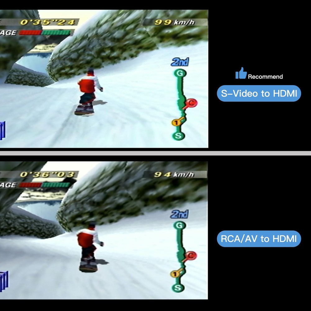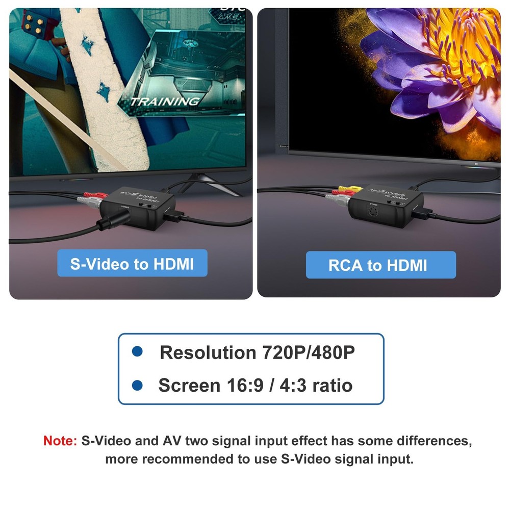 FeiEVER is a brand that specializes in making video converters for old game consoles and old video devices, offers easy to operate, and high quality converters to connect to HDTV. Note: Since RCA and S-Video share the same R and L audio inputs, if you want to use the S-Video signal input, you must connect the R and L audio in order to get sound. AV and S-Video signals cannot be input at the same time, only one signal input can be selected. The converter can only convert SVideo to HDMI or AV to HDMI, not HDMI to RCA/Svdieo. Specifications: Input ports: 1 x RCA(AV/L/R)+S-Video Output ports: 1 x HDMI Input formats: PAL/NTSC M/NTSC4.43/ SECAM/PLA-M/ PAL-N. Output formats: HDMI Resolution 720P/480P or screen 16:9/4:3 ratio. Dimension: L:2.36in W:1.77in H:0.82in Weight: 40g Power supply: USB 5V/1A Package List: 1 x RCA/S-Video to HDMI Converter 1 x USB Power Cable (adapter not included) 1 x Quick Start Guide Warranty: This AV/S-video to HDMI converter provides one year warranty & friendly customer service. 【S Video to HDMI Adapter】Video processing by S-Video signal, output HDMI resolution 720P/480P or screen 16:9/4:3 ratio video, display clear picture on HDTV/monitor. 【RCA to HDMI Adapter】RCA composite (Yellow, White, Red) outputs HDMI resolution 720P/480P or on-screen 16:9/4:3 ratio video to display high-definition video on HDTV/monitor. 【Wide Compatibility】Supports many old game machines, XBOX,VHS,DVD, VCD, etc. (such as NES,SNES, N64, GC,FC,PS1,PS2,PS3,MD1-3,SS,DC…)。 【Plug and Play】Simple operation, plug and play, no need to install a separate driver. 【Attention & Package】Please ensure to connect this RCA/Svdieo to hdmi converter to power source to make it work.Package include:1*RCA/S-Video to HDMI Converter,1*usb power cable(adapter not included),1*Quick start guide.