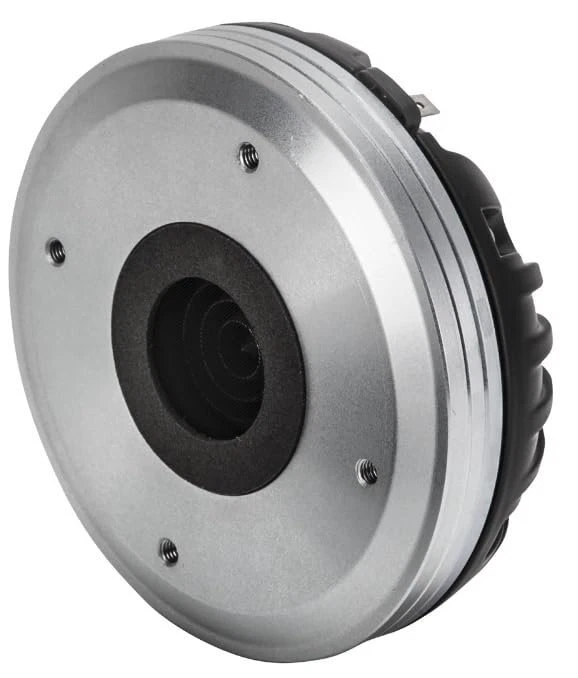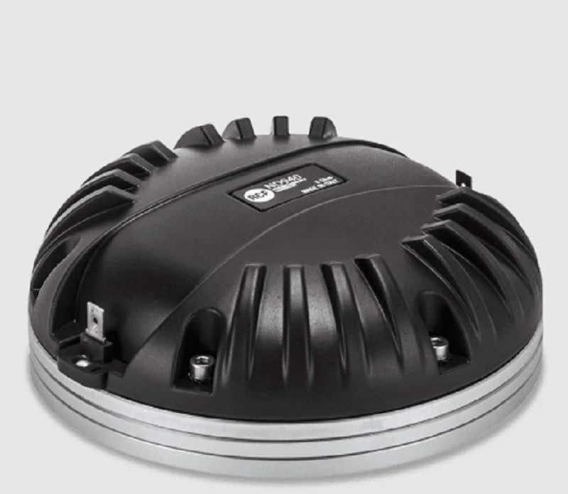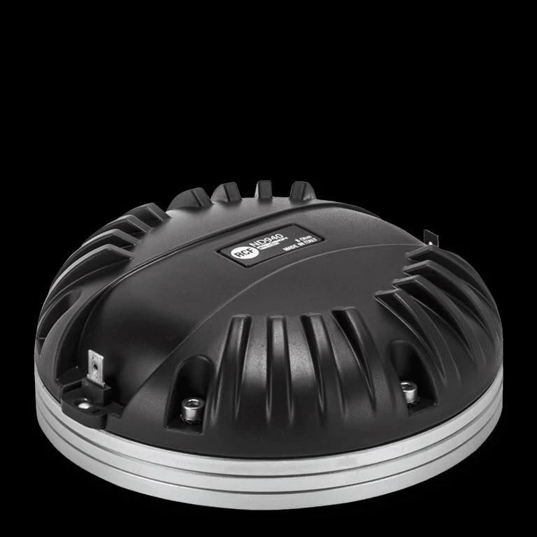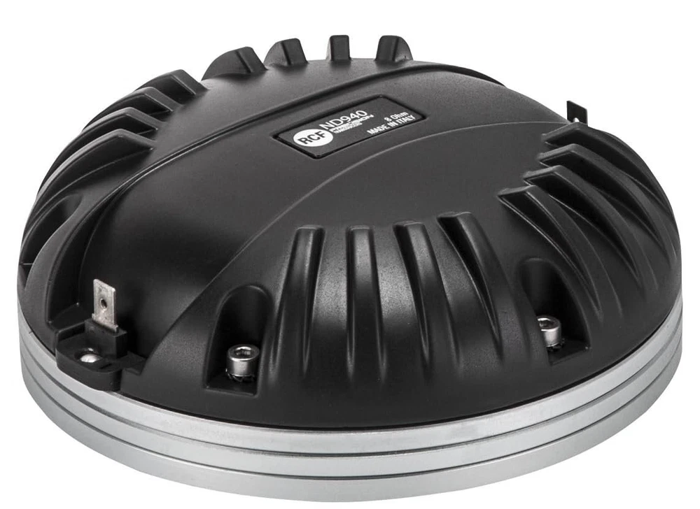 RCF ND940 Neo Mid High Driver 1.4 inch Exit Throat Titanium Diameter 140 Watts Rms 280 Watts Peak 8-Ohm 4" Kapton Former Edge Wound Aluminum Voice Coil Pro Audio Features || 4.0 inch, Kapton former, edge wound aluminium voice coil || 280W continuous program power handling || Frequency range: 500Hz - 20kHz || 4-slot optimized geometry phase plug || Titanium diaphragm, Polyimide surround || Safety agency : CE compliant || Thiele - small parameters || Bl factor (Bl) (T x m) : 17.60 T x m || SPECIFICATIONS || Exit Throat Diameter : 1.4 inch / 36 mm || Related Impedance : 8 ohm || Program Power (watt) : 280 W || Power handling capacity : 140 W || Sensitivity : 110 dB || Frequency range : 500 - 20000 Hz || Diaphragm Material : Pure Titanium || Suspension Material : Polyimide || Suspension Design : Flat || Minimum Impedance (ohm) : 8.50 ohm || SPECIFICATIONS || Voice Coil Diameter : 4.0 inch / 102 mm || Voice Coil Winding Material : Edgewound Aluminum || Voice Coil Former Design : Direct Drive Kapton || Number of layers : 1 || Kind of layers : outside || Flux Density : 2.0 T || Phase Plug Design : 4 slot || Phase Plug Material : Aluminum || Magnetics : Neodymium || Voice Coil Demodulation Ring : Copper || MOUNTING INFORMATION || Overall diameter : 140 mm / 5.51 inches || Overall height : 60 mm / 2.36 inches || Mounting : 4 x 6 mm threaded holes at 90° || Weight : 2.72 kg / 6 lbs || SHIPPING INFORMATION || Package Height : 79 mm / 3.11 inches || Package Width : 169 mm / 6.65 inches || Package Depth : 171 mm / 6.73 inches || Package Weight : 2.87 kg / 6.33 lbs ||