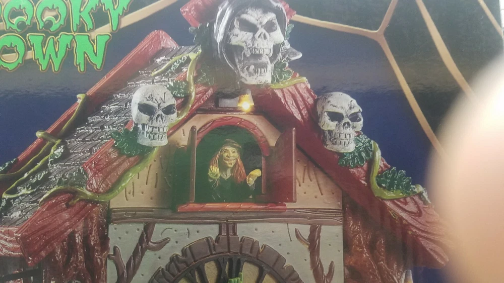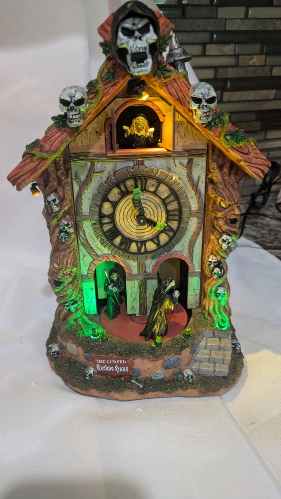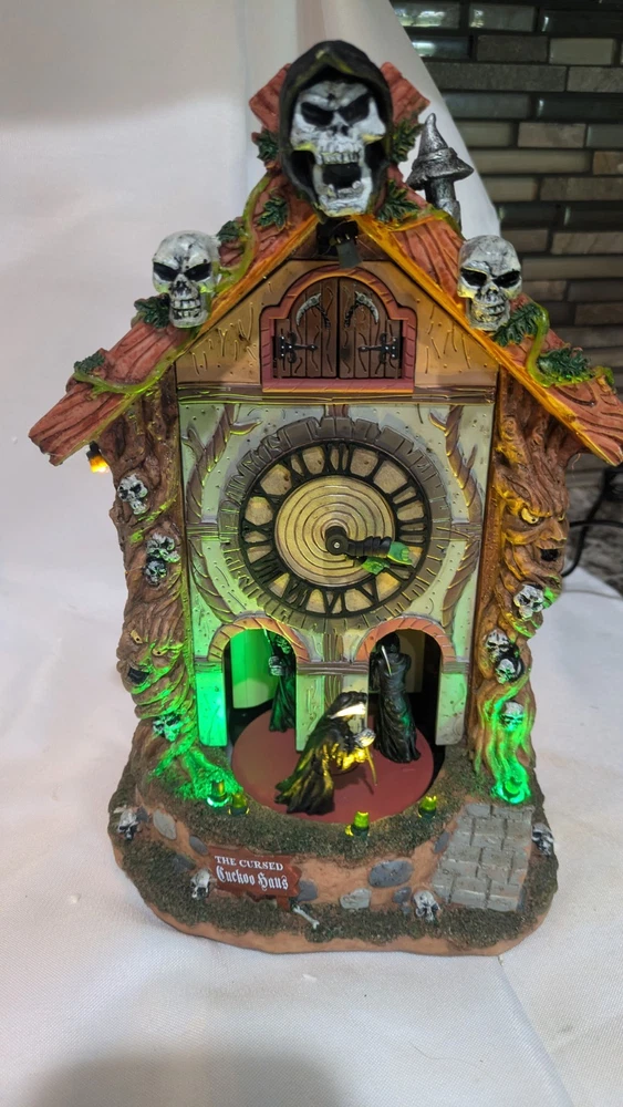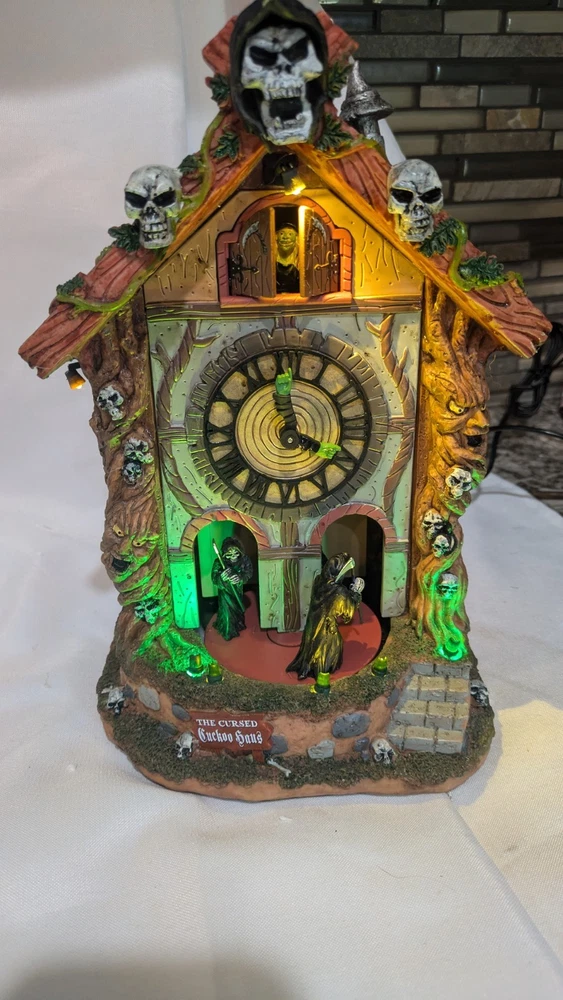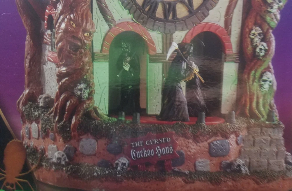 Spooky Town Lemax Signature THE CURSED CUCKOO HAUS Clock Halloween.I removed it from the package. The clock hand moves counterclockwise continues To move. It doesn't keep active time it is always in motion. When it hits the hour & 1/2 hour the witch door opens when it closes the grim reapers move around until it hits the quarter hour. They stop moving until the witch door opens again . Sold as is no returns. Message me with any questions. Thanks This was only opened for inspection and pictures.