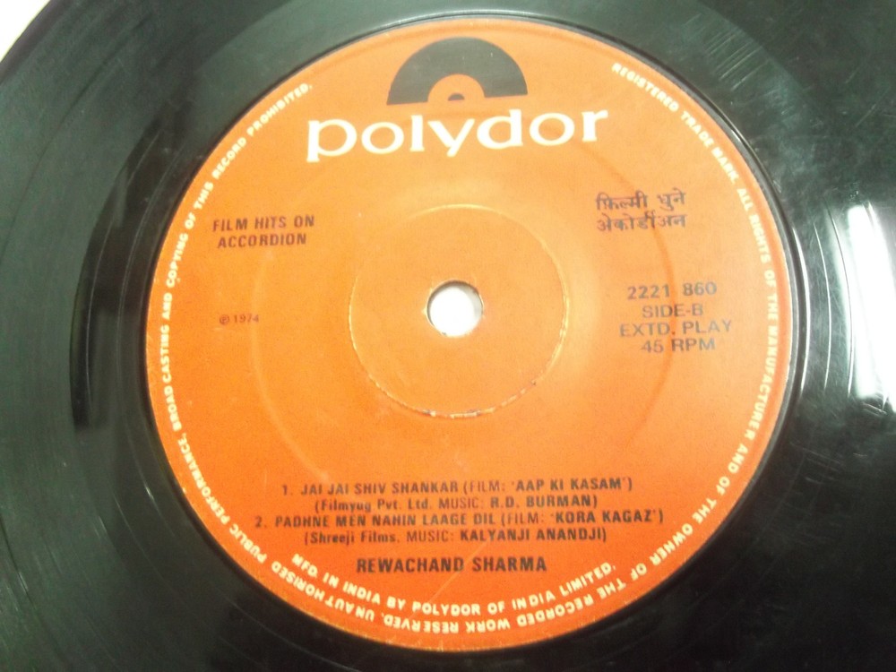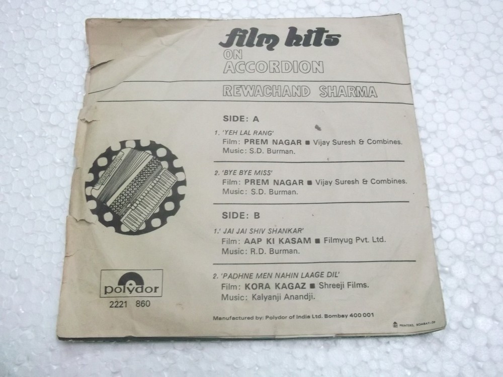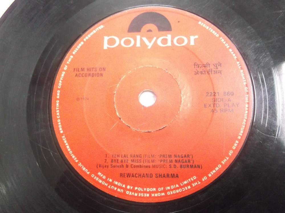 REWCHAND SHARMA FILM HITS ON ACCORDION BOLLYWOOD INSTRUMENTAL rare EP vg+