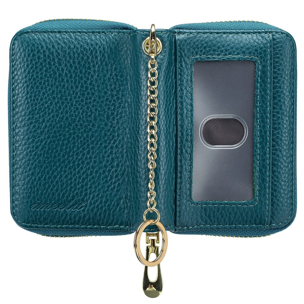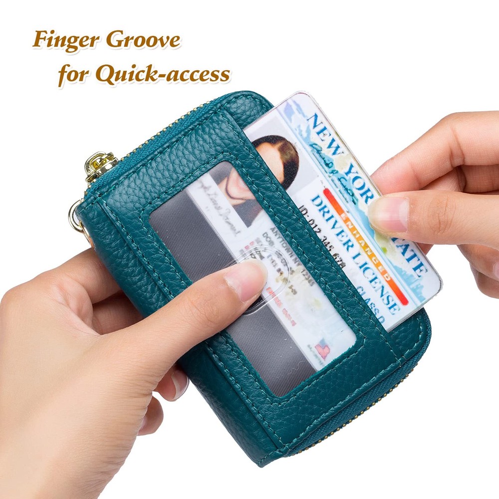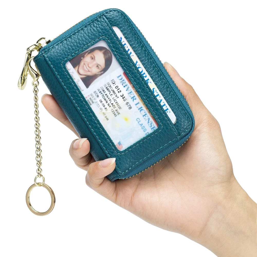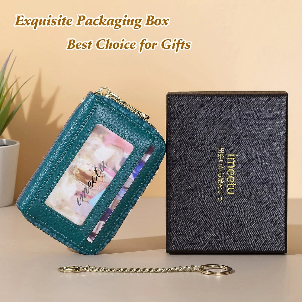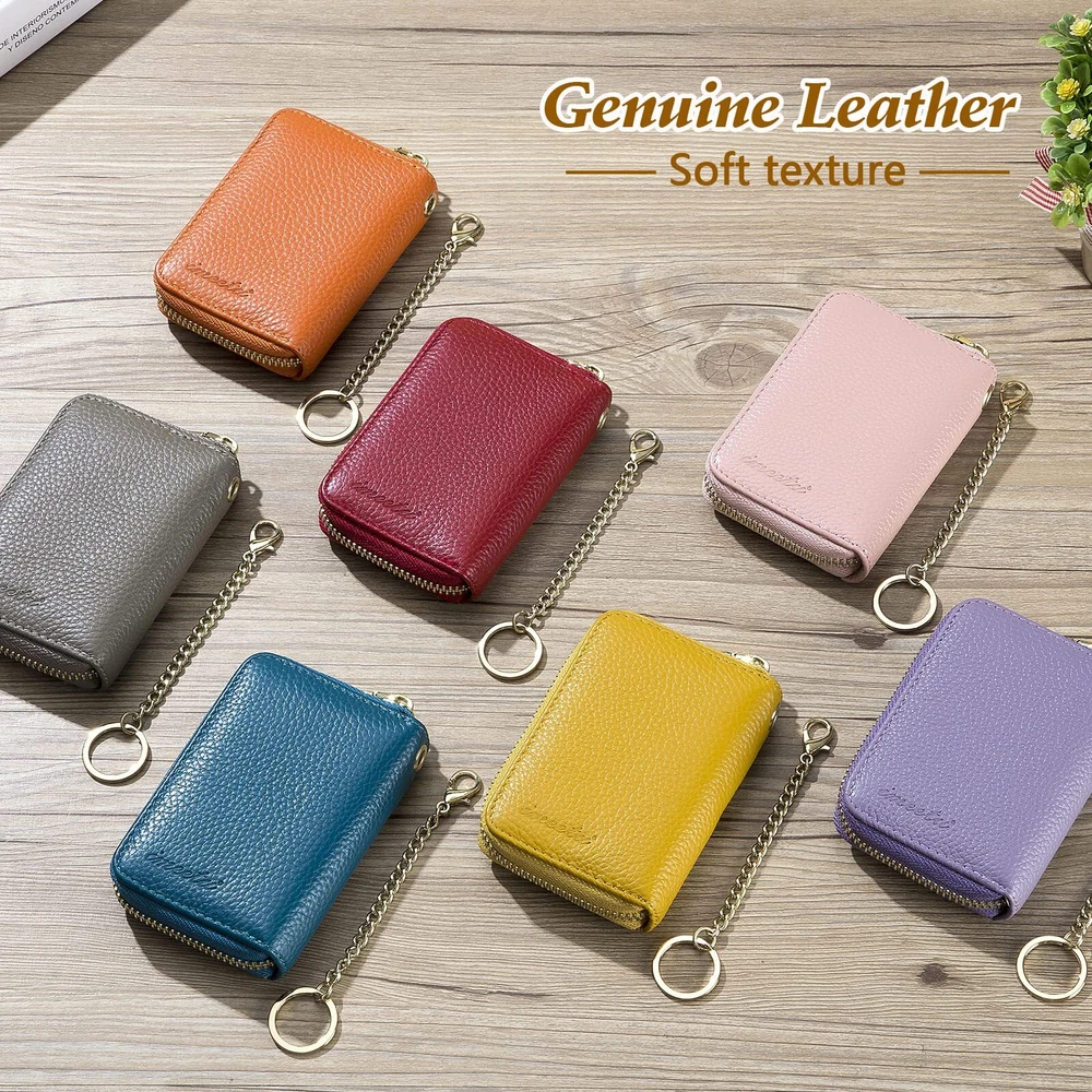 Multifunctional Keychain Card Wallet: Made of genuine leather, soft and durable. Designed with a detachable keychain for your house or car keys. And the external clear ID window is convenient to use. Perfect Size to Organize Almost Everything: 4.3 x 3 x 1.2 inches. There are 12 card slots for at least 12 cards, 2 wide slots for bills, folded cash, receipts, and a tiny zipper pocket for coins. The sturdy keychain can attach your keys firmly. RFID Blocking and Special Design for You: Equipped with advanced proprietary blocking technology, which aims to protect your personal information on the cards from unauthorized scanning. The classic style with various colors fits any occasion and easily matches your outfit. Ideal Gifts with Exquisite Packing Box: We designed it carefully for you, and you selected it carefully for your friends or family. It must be a wonderful gift on Thanksgiving Day, New Year's, Birthday, and Christmas. Happy Shopping Service: is striving to offer high-quality products and a range of professional and efficient after-sales service to our broad customers. , you meet better!