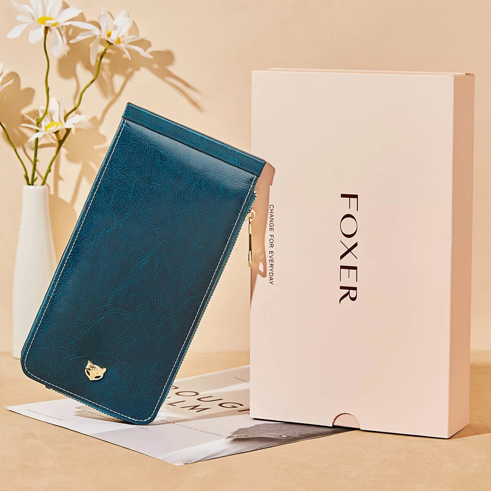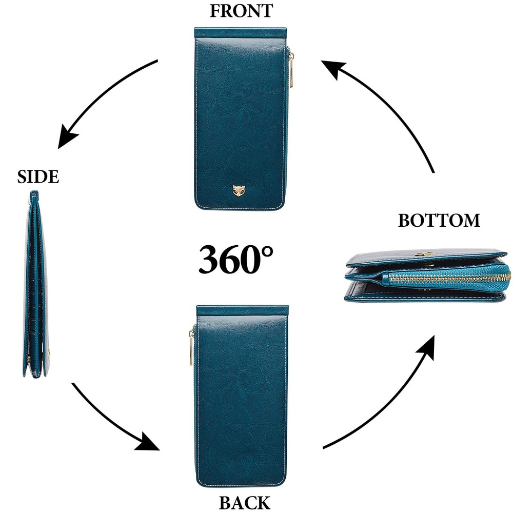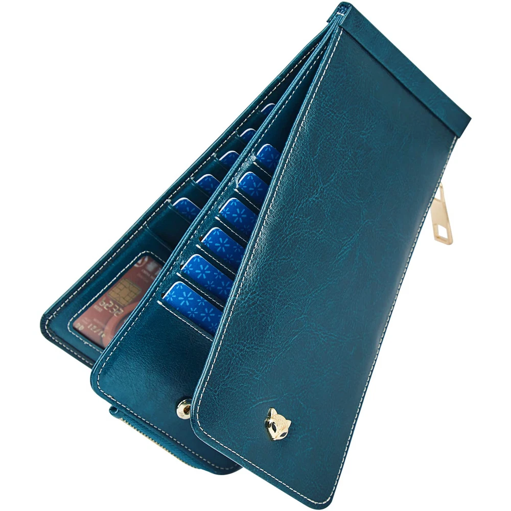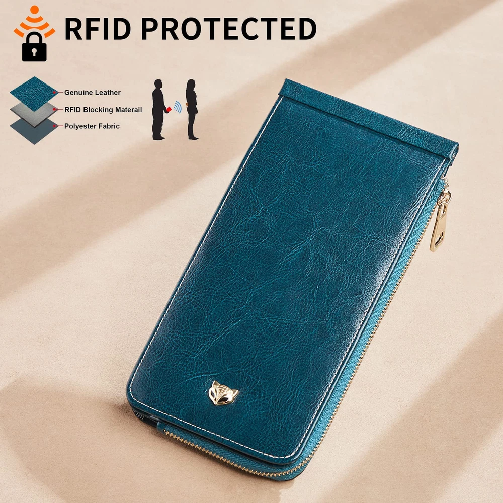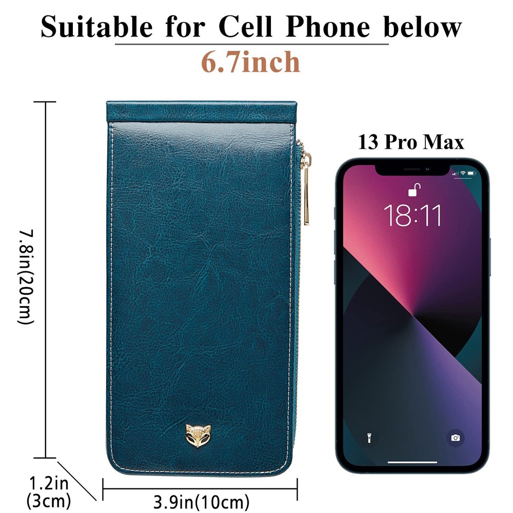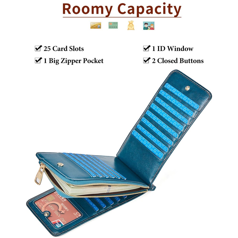 [Durable Material] - This credt card wallet for women is made of quality split leather, enhancing softness and comfort. Polyester lining is silky and it will not scratch your personal belongings. This wallet highlights your feminine elegance and always keep its shape. [Slim but Large Capacity] - Fashion thin design makes the credit card holder look elegant and vintage. Inside with 25 card slots, 1 ID window, 1 zipper pocket can be fit for iPhone X/12/13 Pro Max or other smartphones, passport, cash, etc. Dimension Approx. L 7.8 x W 3.9 x H 1.2 inch (20 x 10 x 3cm), Weight: 0.35lb (0.16kg). Perfect size to be held in your hand or fit in your handbag. [RFID Secure] - Block RFID readers from scanning your credit cards, debit cards, banking information, smart cards, RFID driver's licenses and other RFID Cards. Using this RFID credit card holder you can keep peace of mind while traveling on vacation and surrounded by strangers in airports, crowded streets, and shopping. [Features] - 2 snap buttons design allows you to open or close your wallet smoothly while keeping your cards safe, the zipper pocket can organize your phone/cash better and easily in and out. The metal fox logo in the middle highlights your feminine elegance. Our multi credit card wallet for women features stylish color design, classic and graceful. [Great Gift] - Our card organizer wallet are perfect for casual use /working /dating /party /wedding /travel /business. With Gift Box Packaging so it is a wonderful present for Women’s Birthday, Valentine's Day, Mother's Day, Wedding Anniversary, Thanksgiving, Christmas, etc.