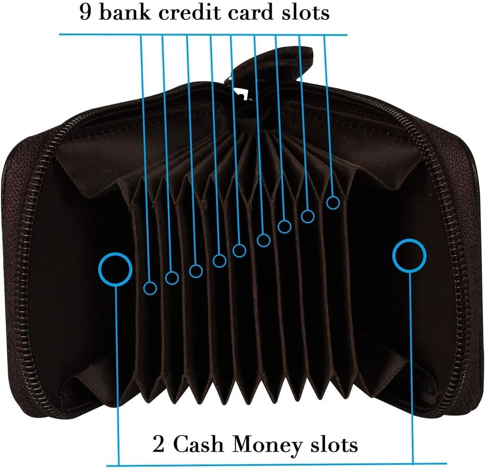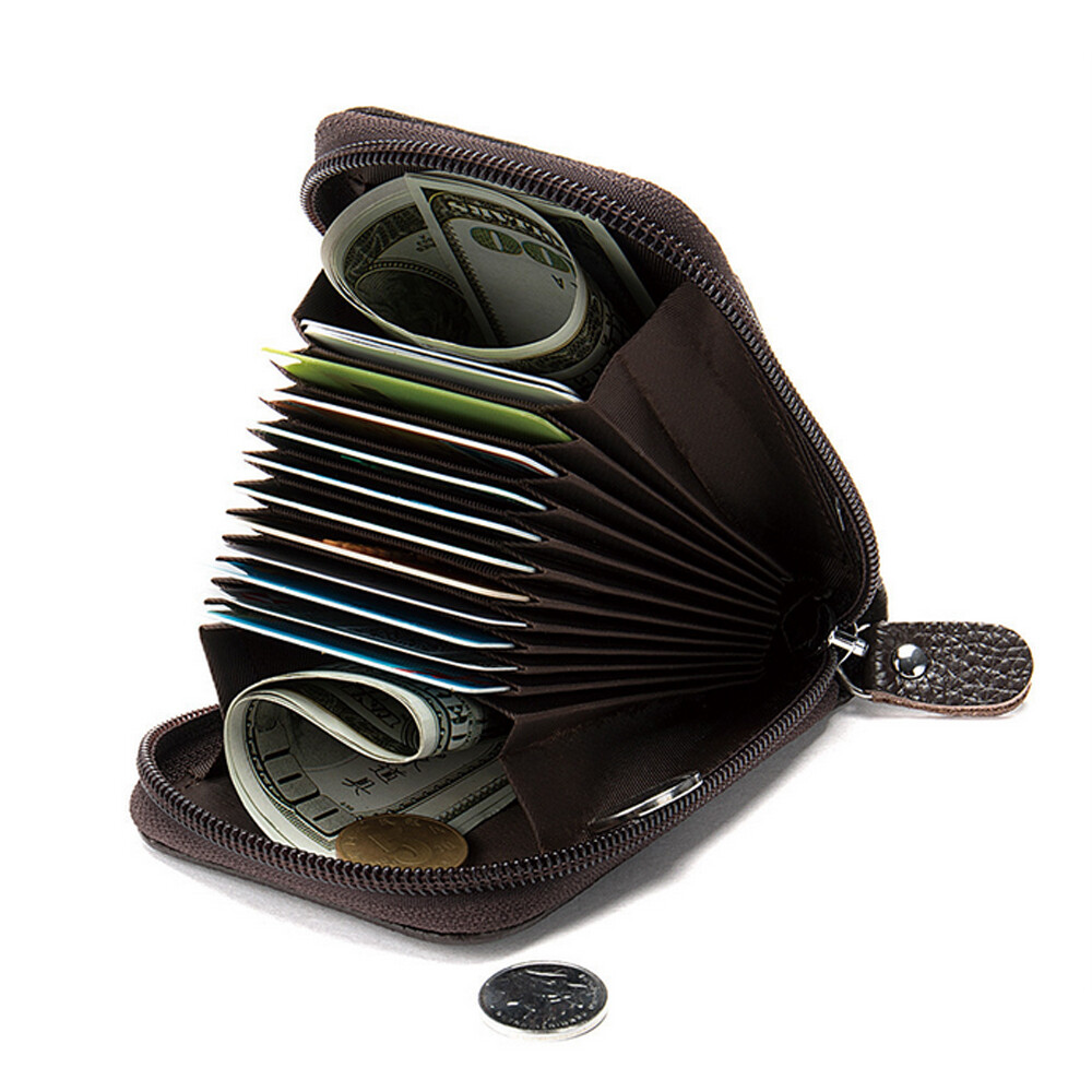 Description: 1 .Made of genuine leather, with zipper closure 2.Expanded like an accordion, with 9 card slots and 2 cash slots inside, 2 card slots outside 3.Keep your credit cards, ID card, cashes, coins, tickets organized 4.Equipped with advanced unique proprietary blocking material, which blocks RFID signals and protects the valuable private information stored on RFID chips from unauthorized scans Specification: Material: Genuine Leather Size: 7.5×11.5cm/ 2.95”×4.53” Structure: 9 card slots and 2 cash slots inside, 2 card slots outside Feature: RFID Blocking Technology, Slim Fold, ID Window, Credit Card, Organizer Package Included: 1 x RFID blocking w a l l e t
