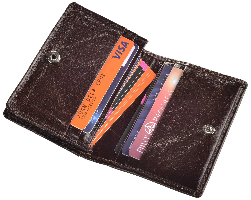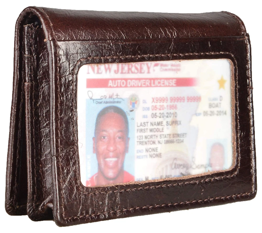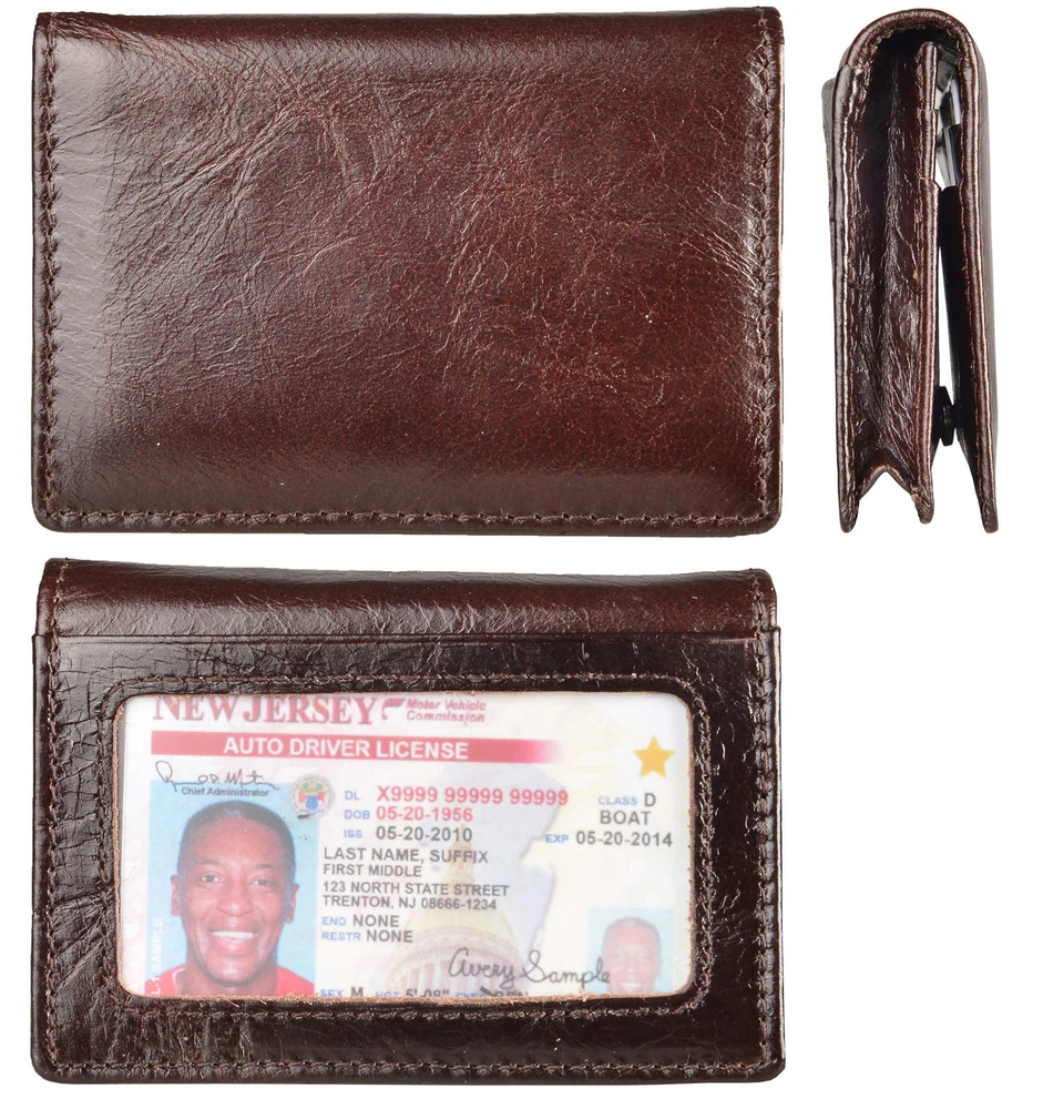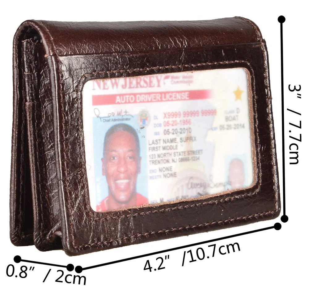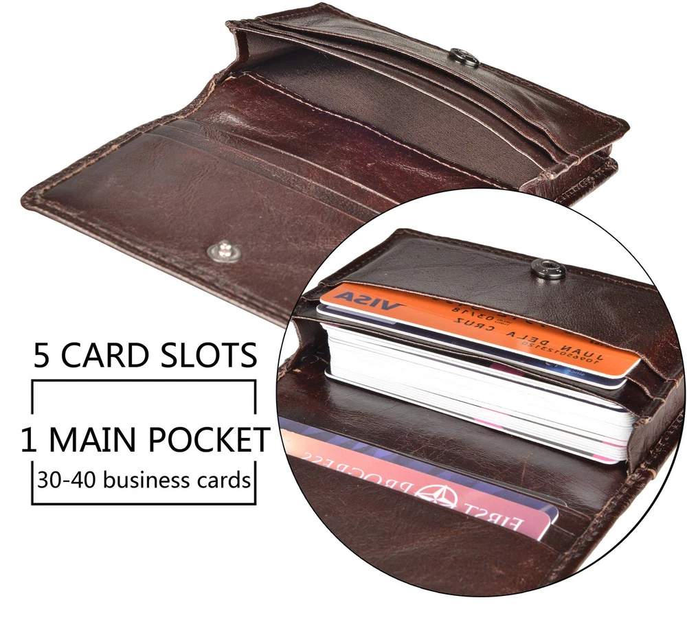 Material: Head layer genuine leather, soft, breathable comfortable. The lining was made of polyester, smooth and durable. Size: 10.6cm*7.6cm*1cm, great fit for use. It is easy to put into your front/back pockets. Capacity: 1 display window, 5 card slots and one pocket for about 40 business cards. RFID Blocking: RFID Blocking designed lining keeps your vital information Secure. Be safe and protected from Electronic Pick pocketing. Unisex Card Holder: Be a gift for husband, father, grandfather, boyfriend or son.