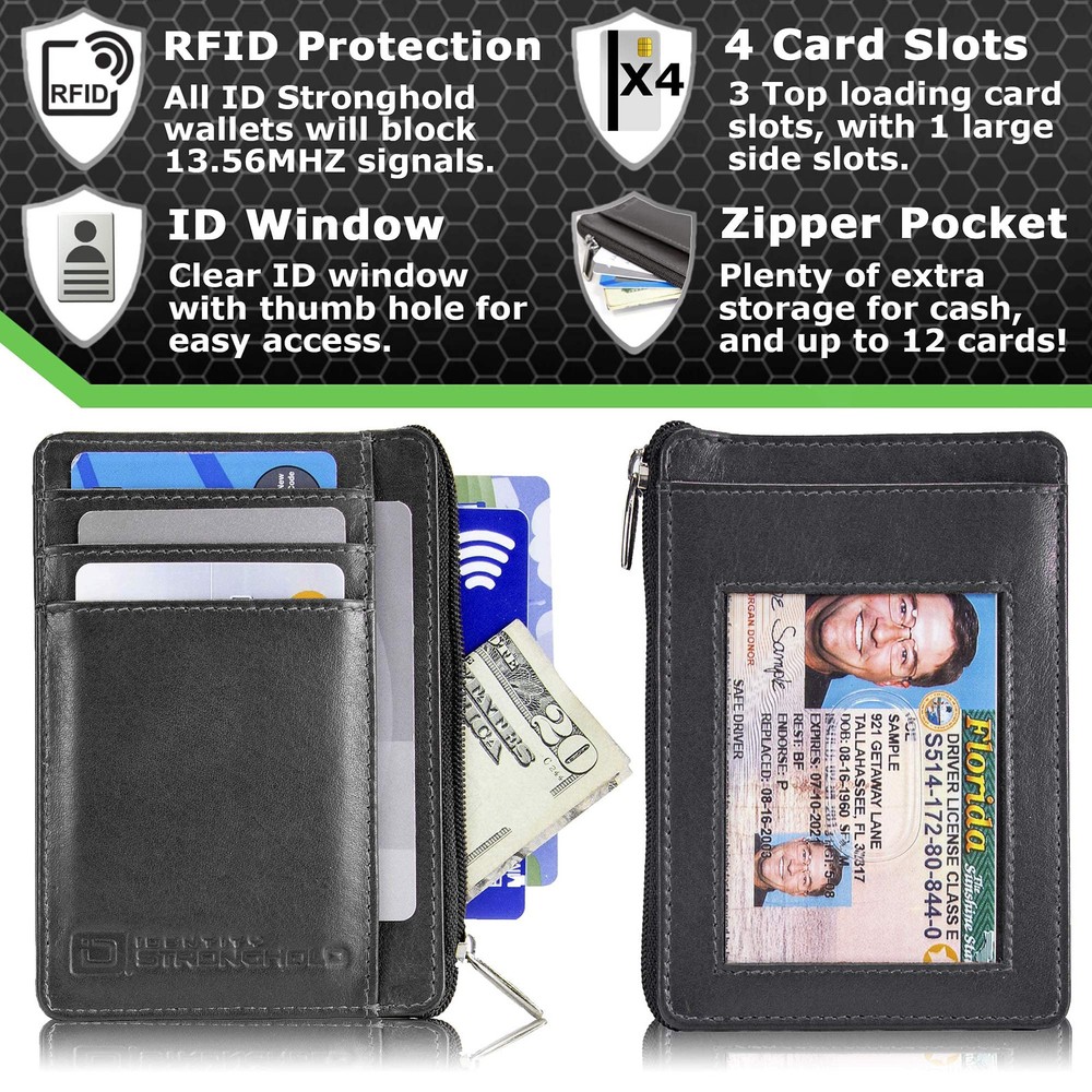INCREDIBLE STORAGE! This is the RFID Wallet that started a revolution in RFID protection. Many of our competitors have tried to imitate this wallet, which is the best form of flattery! This compact secure leather wallet can expand to hold many cards. It has 3 card slots on one side, an ID window on the other, and a zippered pouch in the middle which can hold up to 20 cards plus cash plus receipts. This wallet appeals to both men and women and will fit in your front or back pocket comfortably. PERFECT SIZE. You’re less likely to lose your wallet by theft or misplacing it when your wallet stays in your pocket. Think about going to the grocery store and leaving your large clutch on the front seat of the cart or in your handbag, and then turning around and reaching for something on a shelf. With your mini safely in your pocket, there’s no need to worry. You can put your license, payment cards, loyalty cards, and cash in one mini. GENUINE LEATHER. This RFID Wallet offers abundant functionality while remaining small and comfortable. Made with the softest leather, this wallet looks and feels great, making you look and feel great too! EVERY SLOT SHIELDED to protect your Credit Card, Debit Card, Enhanced Driver's License, Transit Card, Hotel Room Key, Passport Card, etc. transmitting at 13.56 Mhz and higher. Designed with top security in mind. As with all wallets, every slot, ID window, billfold, and compartment is individually shielded, so your information is protected no matter where you place your RFID cards. This is not a feature found in most RFID wallets. PERFECT GIFT! Each wallet comes with its own original GIFT BOX so you can buy one for yourself, and one for a friend. Looking for something different? Just search for at the top of Amazon to find all of our styles. Product Dimensions: 4.63 x 3.25 x 0 inches Product Weight: 1.13 ounces