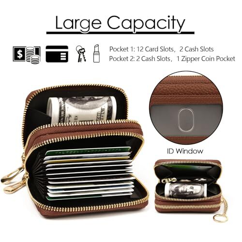Return Policy Fast Delivery Trusted seller RFID Credit Card Wallet, Genuine Leather Zipper Card Case Holder with Removable Keychain(Max - Brown) Product Description Multifunctional Keychain Card Wallet: Made of genuine leather, soft and durable. Designed with a detachable keychain for your house or car keys. And the external clear ID window is convenient to use. Double Zipper Multi-Slots Card Case: 12 accordion credit card slots, 4 cash slots (can store coins or folded banknotes), 1 zipper pocket, 1 clear ID window, and 1 removable wallet keychain, which is enough for holding your keys and daily cards, such as credit card, debit card, business card, ID card, folded cash and more. RFID Blocking and Special Design for You: Equipped with advanced proprietary blocking technology, which aims to protect your personal information on the cards from unauthorized scanning. The classic style with various colors fits any occasion and easily matches your outfit. Ideal Gifts with Exquisite Packing Box: We designed it carefully for you, and you selected it carefully for your friends or family. It must be a wonderful gift on Thanksgiving Day, New Year's, Birthday, and Christmas. Happy Shopping Service: is striving to offer high-quality products and a range of professional and efficient after-sales service to our broad customers. , you meet better! Shipping Returns Payment Shipping Shipping is FREE to all addresses other than APO/PO boxes in the lower 48 states. All our stock ships from US-based warehouses. Shipped via USPS or UPS (depending on location and package weight) Unless stated otherwise, all orders will ship within 24-72 hours of your payment being processed. Check our feedback to see the great reviews of FAST shipping we offer. Returns Seller does not accept returns Payment We currently accept payment via eBay managed payments only. Once payment is cleared, we will dispatch your shipment within 1-3 business days. Please refer to the "Shipping" tab for more information regarding shipping speed to your destination.