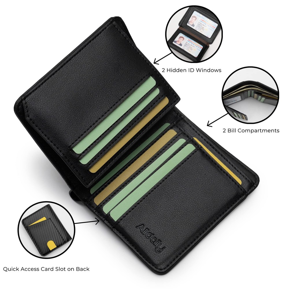 RFID Credit Card Wallet for Men Small Bifold Front Pocket Wallet with 2 ID Windows (Black Description and features SAFETY & PRIVACY: Our RFID credit card wallet is equipped with advanced proprietary blocking material that protects against unauthorized scans and keeps your valuable information safe. OPTIMAL ORGANIZATION: With 11 card slots, including a quick access card slot on the back, 2 hidden ID windows, and 2 spacious bill compartments, our wallet provides ample storage space for all your essential cards and cash. FUNCTIONAL & COMPACT DESIGN: Dimensions: 4.52 "L x 3.74 "W x 0.9 "H, Our RFID credit card wallet strikes the perfect balance between functionality and compactness. this small bifold wallet is designed to keep you organized without adding unnecessary bulk to your pocket or bag. DURABLE VEGAN LEATHER: Made from high-quality vegan leather with hand-stitched finish, our wallet is not only stylish but also durable, ensuring it lasts for a long time. PERFECT GIFT: Our RFID credit card wallet is not only practical but also makes a thoughtful and stylish gift for your loved ones. It comes with a and our responsive customer service team is ready to assist with any questions. This RFID credit card wallet is a men's wallet with advanced protection features. It features proprietary blocking material engineered to specifically block RFID signals of 13.56 MHz or higher, safeguarding the valuable information stored on RFID chips from unauthorized scans. The wallet has 11 card slots, including a quick access card slot on the back, 2 hidden ID windows, and 2 spacious bill compartments, providing ample organization for your cards and cash. In addition, this wallet boasts a slim and compact design, making it convenient to fit in your front or back pocket without adding unnecessary bulk. Crafted from high-quality vegan leather and hand-stitched for durability, it not only offers a stylish look but also long-lasting performance. Furthermore, it comes with a and a responsive customer service team to address any questions you may have. Whether you're purchasing it for yourself or gifting it to someone special, this RFID credit card wallet is a practical and thoughtful choice. With its privacy protection, elegant design, and durable quality, it's an ideal option for your daily life. Return Policy ❤ All our products come with a 30-Day Return Policy. If you would like to return your item and you are within 30 days of the purchase, and it is still in its original condition, you can return the item by contacting us through eBay messaging. ❤ If you are not 100% satisfied, please let us know the Detailed Problem,We will give you a 100% satisfactory solution ❤ If you received an incorrect, damaged, defective, or item not as described, contact us for a partial/full refund or replacement on our cost. ❤ Free Shipping and Free Return 30-Days Money Back Guarantee. ☎ For all returned products, buyers MUST contact us for the returning address. Shipping ❤ We do not ship to a different address. we will ship to the address you provide on the ebay only. Please check your address before purchase. ❤ It should take 2-4 business days for the product to reach your destination. ❤ If the product doesn't reach your destination within the time limit, please give it an additional 1-2 business days in case of postal delays and/or possible technical issues. ❤ We use a selection of shipping services such as UPS, FedEx, USPS etc. ❤ We ship only to the 48 contiguous states of America. We do not ship to Hawaii, Alaska, US Protectorates, APO/FPO addresses. Local pickups are not offered. ☎ If it takes any longer than that, please do not hesitate to contact us to resolve the issues. Contact us ☎ Please contact us via eBay message. And your message will be replied within 1 business days. For any queries, please feel free to contact us, we will get back to you as quickly as possible. Customer 100% satisfaction is our first priority and goal. We are always working hard for maintain high standards of excellence and resolve your problem in best way. So your POSITIVE FEEDBACK is very important. If you have any problem of the item, please feel free to let us know before leaving your feedback. We will try our best to solve your problem. About us We are here to give you quality products, competitive pricing and amazing service in order to make sure you get the best deal online, Thank you for your business and the opportunity to serve you.