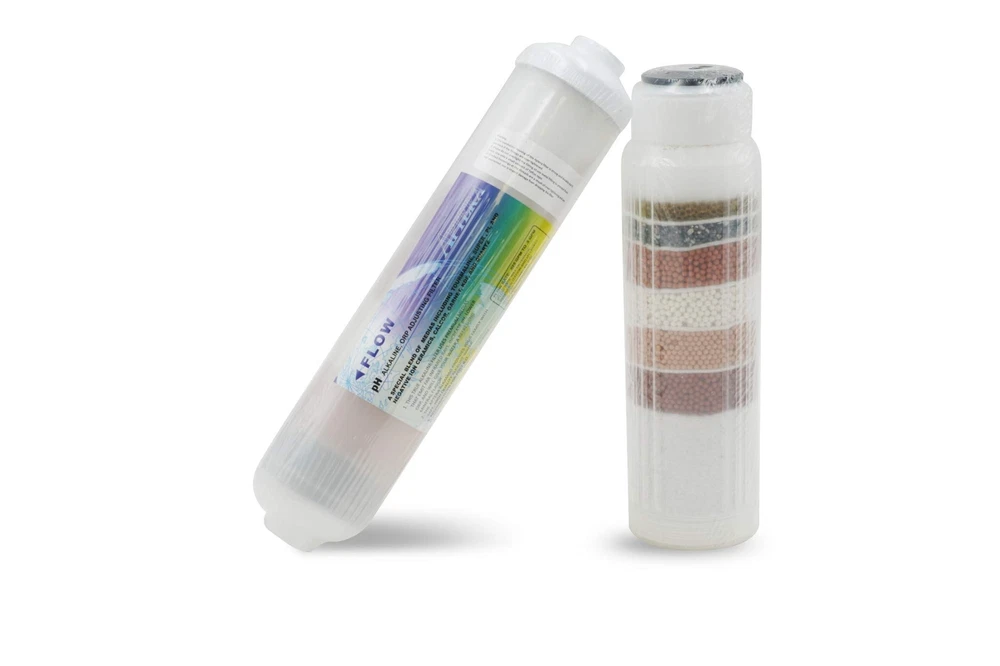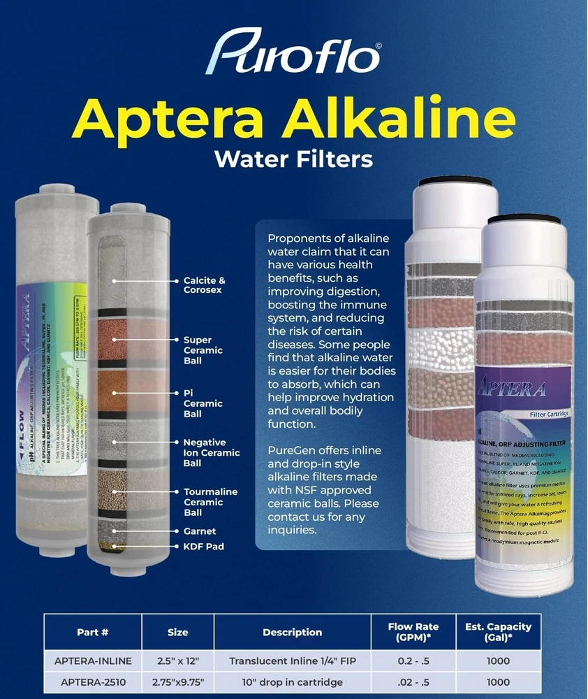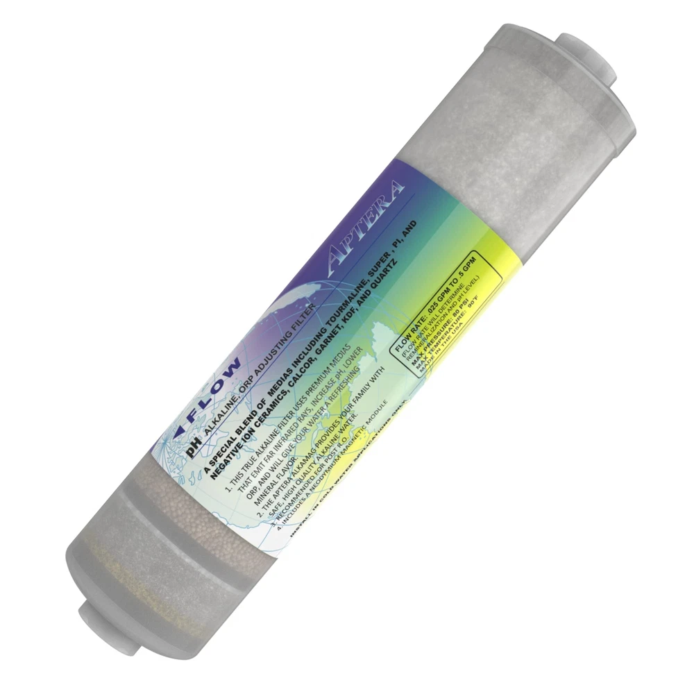 The Aptera Alkamag inline alkalinity filter is a true alkaline ionized filter that features 10 levels of filtration using premium medias, cermaics, and a magnet that emit far infrared rays, increases pH and alkalinity, lowers ORP, and gives your water a refreshing mineral flavor. Levels of Filtration -Sediment Filter Pad -KDF/Redox -Almandine Garnet -Super Cermamic -Pi Ceramic -Negative Ion -Tourmaline -CalCor (Calcite/Corosex) -Quartz -Neodymium Magnet Studies have shown that alkaline water enable the human body to function more efficiently as it does not have to buffer as much the acids we take in through food and drinks. The Aperta inline alkaline filter is recommended for post RO (Reverse Osmosis) use and includes a neodymium magnetic module. The Aptera alkaline ionized water filter requires a very slow flow rate of 0. 25-. 5 gpm in order for the water to have sufficient contact time with each of the medias of the ionized water filter. Using this filter in combination with your current water filter system gives you pure & great tasting water with more health benefits than standard filtered water. INCLUDES QUICK-CONNECT FITTINGS AND FILTER CLIPS. The filter includes two 1/4" FPT x 1/4" quick connect fittings and two 2. 5" double clips, making connecting your filter quick and easy WITHOUT going to the hardware store to get additional parts to connect. Increase your pH by 1. 0 - 1. 5 points AND lower the ORP of you water Provides truly alkaline water using minerals, ceramic beads, neo magnets, and far infared rays Includes two 1/4" quick-connect fittings to make adding the filter to your system quick and simple Includes two 2. 5" double clips to attach the filter to your current system Best results will be achieved by using with an RO system and . 25-. 5 GPM flows