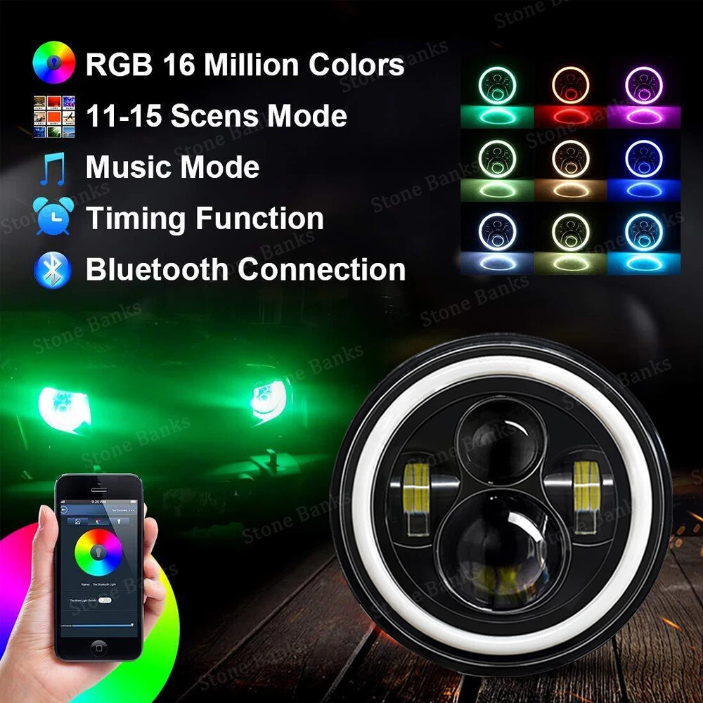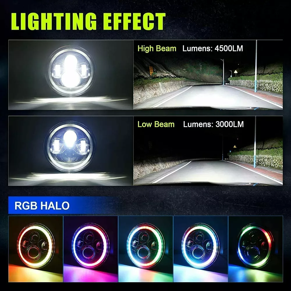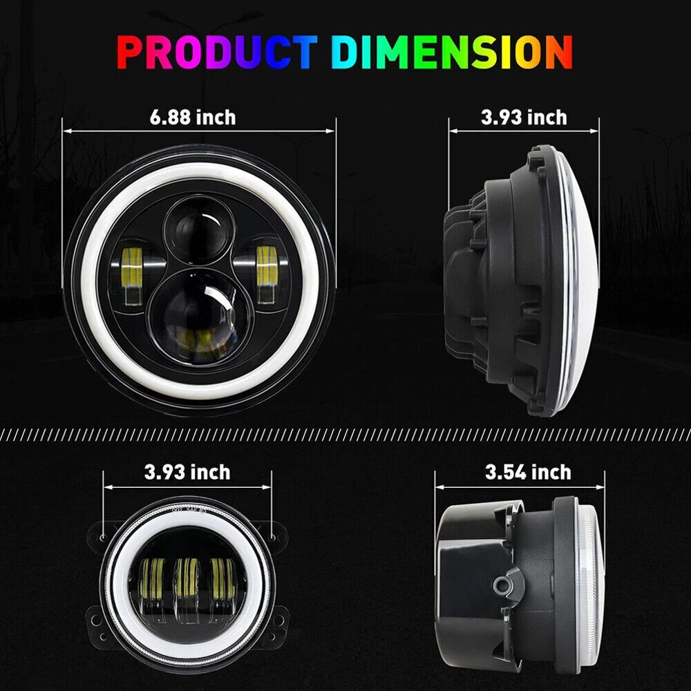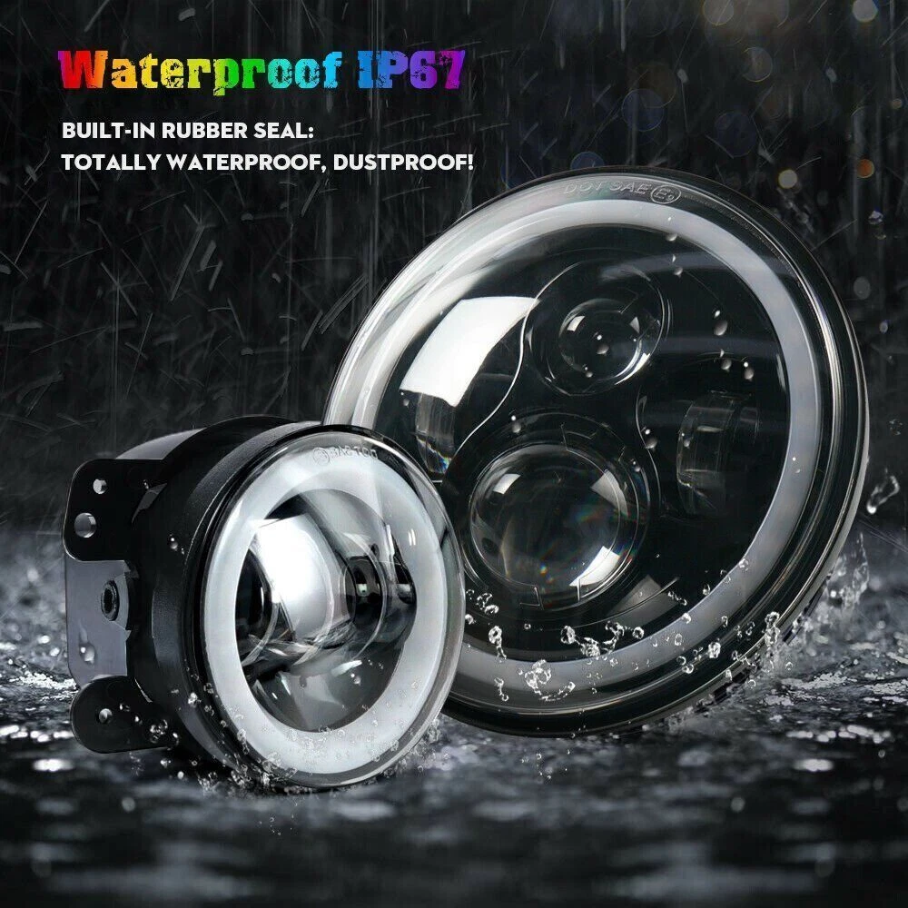 RGB 7" Halo LED Headlights 4" Fog Lights Combo For Jeep Wrangler JK JKU 2007-17 Similar Items Description # Ship within 24 hours. # 100% New & Excellent Quality # Strictly QC, Each item was fully checked before shipping # FREE & FAST Shipping Delivery with Tracking Number 2x 7'' RGB Halo LED Headlights DRL For Jeep Wrangler JK TJ LJ Adventure Design: Fit For RGB Jeep Wrangler LED Headlight adopt the latest fantastic design and new technology, keep your adventure going with an enhanced lighting system and super bright replaces original halogen. New LED, New APP. Multi Function: Our LED Headlight with Halo Angel Eyes, Full Functions, Have Fun! Music responsive,flashing/chasing mode,DIY blinking,Compatible iOS & Android,lighting patterns. Just Enjoy It. Excellent Material: Die-cast Aluminum design for optimal cooling and heat dissipation,LED Lens projector ensures this beautiful 7" LED headlight has super bright, reduced glare,impact resistant, scratch resistant. Built-in rubber seal with the performance of Waterproof, Shockproof and Dustproof. Easy Installation: 7inch LED Headlight fit for Jeep wrangler assembly will take you around 20 minutes for installation. Plug and Play, Connect the wiring and scan the QR code, RGB halos controlled by through APP. Size: 7 inch Voltage: 12-30V DC LED power: 60W Connector: H4 To H13 Housing Color: Black Life Span: 50000Hrs Working temperature: -40~85℃ Material: Die-cast Aluminum 2x Amber/White Halo 4" Inch LED Fog Lights For Jeep Wrangler JK TJ LJ Dimensions:4inch Led Power:30W Light Modes: White Fog Light, Amber/White Daytime Running Light, Turn Signal Light Operating Voltage:12V DC Housing Material: Die-cast Aluminum Color Temperature:6000K Housing Color: Black Waterproof Rate: IP 68 Theoretical Lumens Output:3000 LM Color Temperature:6000K Lens Material:PC Life Span: 50000+hours Fitment: Fit For Jeep Wrangler TJ (1997-2006) Fit For Jeep Wrangler TJ Unlimited / LJ (2003-2008) Fit For Jeep Wrangler JK 2 Door (2007-2017) Fit For Jeep Wrangler JK 4 Door Unlimited (2007-2017) Fit For Jeep Wrangler TJ 1997-2006 Fit For Jeep CJ-8 Scrambler 1981-1985 Fit For Jeep CJ-7 1981-1985 Fit For Wrangler JK Models require H4-H13 adapters Package Includes: 2 x 7inch RGB Halo LED Headlights 2 x 4inch Amber/White Halo LED Fog Lights Detail Image Payment 1.We accept ebay payment only. 2.All major credit cards are accepted through secure payment processor ebay payment. Shipping 1.We ship to your eBay or ebaypayment address. Please make sure your eBay and ebaypayment address is correct before you pay. 2.Items will be shipped within 1-3 business day when we received payment. 3.Delivery time depends on destination and other factors; 4.International buyers please note: a.Import duties, taxes and charges are not included in the item price or shipping charges. These charges are buyer’s responsibility. We will try our best to reduce the risk of the custom duties. b.Please check with your country's customs office to determine what these additional costs will be prior to buying. Returns The buyer is responsible for all return shipping including a result of customer error or defective item. 1) If you received an incorrect, damaged, defective, or item not as described, contact us for a partial/full refund or replacement on our cost. 2) If you want to return the item, please contact us within 30 days after package received. Return products must also be in its original condition: including box, packaging and all other accessories. FAQ Q1:Will this bulb fit my vehicle? We can match almost any vehicle to one of our bulb sizes. eBay only lets us include some vehicle fitments per listing, but if your vehicle does not show up on the compatibility table at the top of our listings, welcome you to contact us for free consulation before purchasing a product. Q2:Neither side lighting up? Both sides flicker, flash, interfer radio or work inconsistantly. Check the headlight fuses to insure correct installation. If this doesn't work, there may be a voltag Q3:My bulbs won't fit Special bulb holder may be required. See if you can take the holder from the stock bulb. If not, let us know. The bulb size may be wrong, double check the item you received with the item you ordered. Do you have an aftermarket lighting housing? These may not be perfectly fitted for aftermarket bulbs and will require some manual modifications. Please buy a universal extended dust cover if the cover can not hold the headlight after installation. Q4:WARNING ABOUT POLARITY, Unlike halogen bulbs, LED are polarity sensitive. BEFORE you start your LED kit installation, verify the polarity on your vehicle by simply plugging the LED bulb into your vehicle socket. - if your light turns on, please proceed to install both bulbs onto your vehicle. - if your light DOES NOT turn on, disconnect the bulb and flip the socket in order to reverse the polarity (this will not damage your vehicle electrical system in any way). Once you made sure the LED bulb turns on, please proceed to install both bulbs onto your vehicle. Note: There is no convention when it comes to polarity. Different car manufactures have different polarity setup, even within the car model the polarity setup on your low beams and high beams might be different.