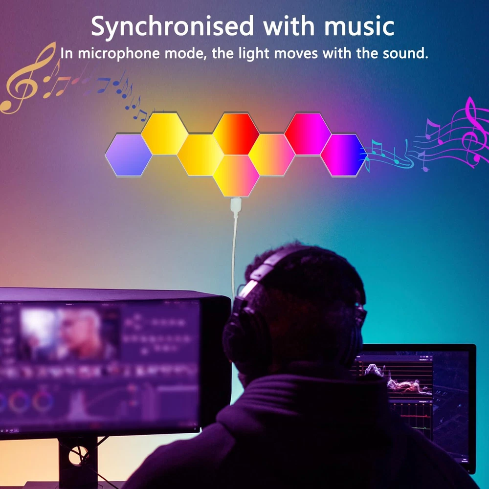 Versatile Lighting: This 8-pack of hexagon light panels offers smart RGB LED lighting with app and remote control for customizable ambiance. Modular Design: The modular hexagon tiles can be arranged in various shapes and patterns to suit your space and creativity. Music Sync: Enjoy an immersive experience as the lights sync with your favorite tunes, creating a captivating visual display. Multiple Modes: Choose from various lighting modes, including static colors, dynamic effects, and DIY customizations. Ideal for Spaces: Perfect for living rooms, bedrooms, gaming setups, or as a unique gift for DIY enthusiasts and kids alike.