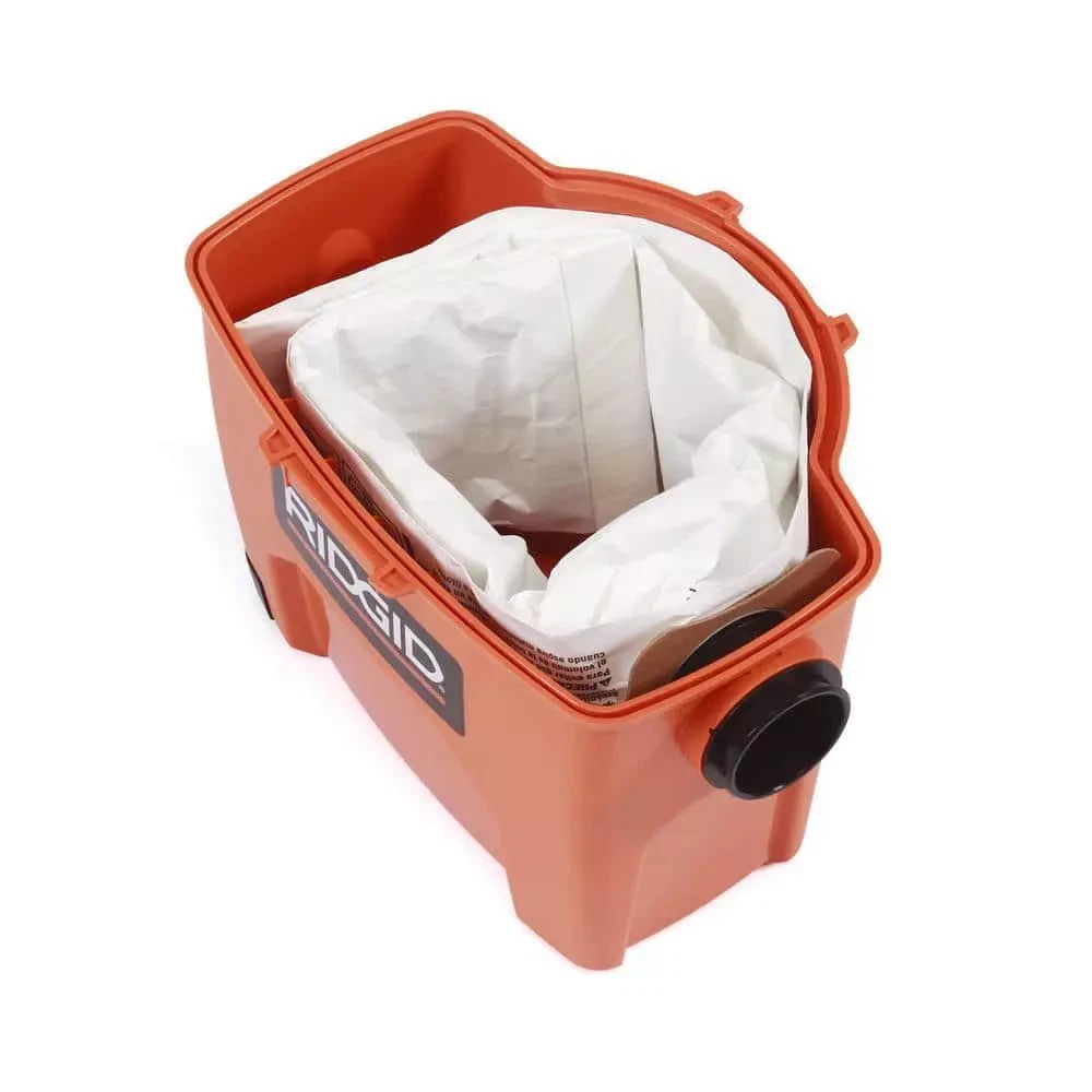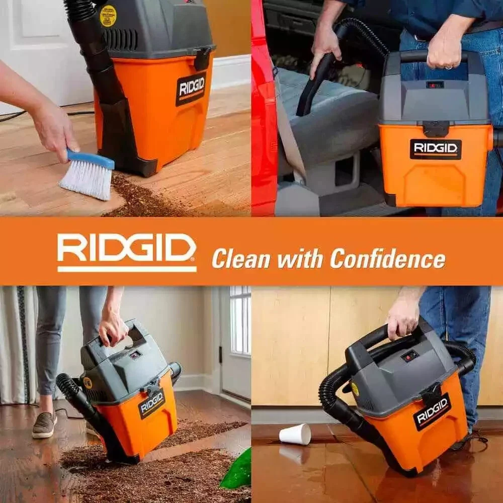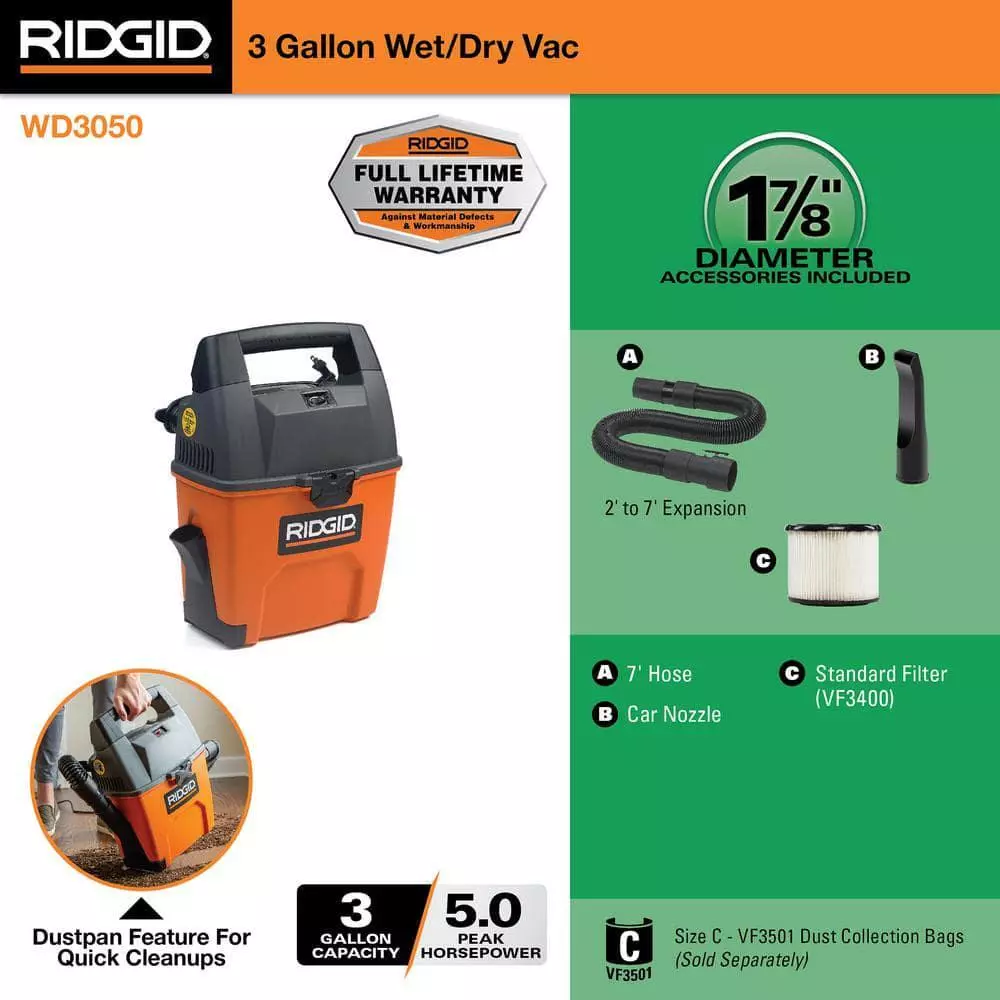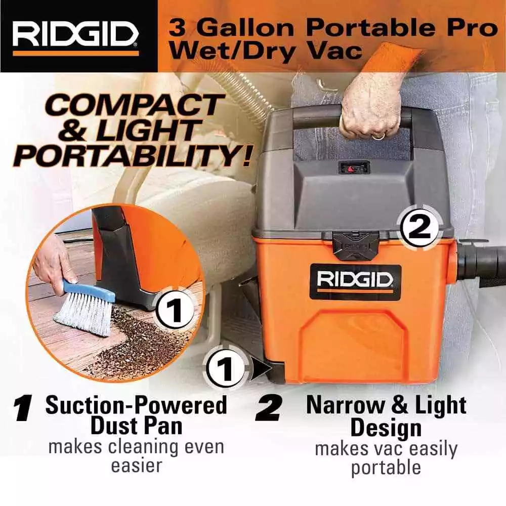 RIDGID 3 Gal 3.5 Peak HP Handheld Shop Vac Wet Dry Vacuum with RIDGID SWEEP Dust Pan, Filter, Locking Hose and Car Nozzle About This Product The RIDGID 3 Gal. 3.5 Peak Horsepower Portable Wet Dry Shop Vacuum with built-in RIDGID SWEEP dustpan feature is a compact and portable vacuum that is designed to deliver powerful performance. The 3-Gal. shop vac is lightweight and makes it easy to take the vac with you on road trips, use it around the house, or for smaller messes. The included car nozzle is designed to clean upholstery and carpet and can be stored onboard the vac when not in use. Its small size and large carry handle provide comfortable portability. Store it easily in your garage or workshop. The innovative RIDGID SWEEP feature is a suction-powered dustpan built right into the shop vac - sweep the dust directly into the shop vac or use it to glide over spilled areas. The wet dry vacuum's 3.5 peak horsepower motor, 10 ft. power cord, locking expandable hose, and filter will please pro's and DIYers alike. The RIDGID 3 Gal. wet dry vac shop vac also comes with a general debris filter (VF3400) and is compatible with other filters for any job or mess pickup (VF3500, VF3600, VF3700 and VF3800; sold separately). Replace RIDGID wet dry vac filters frequently to maintain optimal vacuum performance and protect motor. Highlights RIDGID 3 Gallon 3.5 Peak Horsepower Wet/Dry Shop Vacuum with built-in "RIDGID SWEEP" Dustpan provides powerful suction while offering the freedom and convenience of portability Perfect for general household cleanup, small garage and basement messes, and areas around workstations Includes 1-7/8 in. attachments: hose, car nozzle Filtration includes general debris wet/dry vac filter (VF3400) for capturing general dirt and Qwik Lock filter snaps on or off the wet/dry shop vac for easy cleaning Weighing less than 10 lbs., and the integrated large carry-handle makes this vacuum easy to transport, with a compact size for stowing in small spaces Integrated RIDGID SWEEP suction-powered dustpan makes cleaning even easier, sucking up debris as it is swept right in Use the onboard cord wrap for storage of the 10 ft. power cord and the cord has a quick-release option so you can spend your time cleaning, not unwrapping the cord Accessory storage space gives you quick access to the included car nozzle 1-7/8 in. diameter hose offers non-clogging performance like larger diameter hoses with the flexibility of smaller diameter hoses Car nozzle is perfect for soft surface areas in your car and home Replace your filters often to prolong the life of your shop vac and reduce suction power loss RIDGID offers additional replacement filtration options (VF3400 general debris filter, VF3500 fine dust filter, VF3600 HEPA material filter, VF3700 wet application filter, and VF3800 HEPA filter; sold separately) that capture a variety of dirt and debris and VF3501 Size C dust collection bags (sold separately) for quick and easy cleanups Gallons indicated reflect drum volume, not necessarily collection capacity, actual capacity dependent upon type of debris collected, condition of filter and other factors Peak Horsepower represents a level at or below the maximum horsepower output of an electric motor tested in a laboratory using a dynamometer Dimensions Hose Diameter (in) 1.875 in Hose Length (ft.) 7 ft Peak Horsepower (php) 3.5 Product Depth (in.) 10.5 in Product Height (in.) 18.4 in Product Width (in.) 24 in Details Air Volume (CFM) 62 Amperage (amps) 7 Blower Port Not Included Color Family Oranges/Peaches Cord Length (ft.) 10 Cordless/Corded Corded Debris Type Dust Mites, General Debris, Pollens, Sawdust Filter Type Cartridge Included Accessories No additional accessories included Power Source Electric Product Weight (lb.) 9.85 lb Recommended Surfaces Auto Interior, Bare Floor, Carpet, Concrete, Laminate, Leather, Stairs, Tile, Upholstery, Vinyl, Wood Tools Product Type Vacuum Vacuum Maximum Capacity (Gallons) 3 gal Voltage (V) 120 V Wet/Dry Attachment & Accessory Type Dust Bin