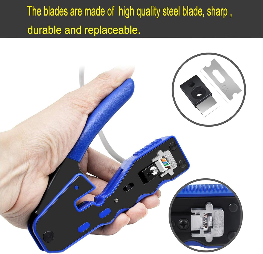 ✅RJ45 Crimp Tool for Pass-Thru RJ45 cat5e cat6 cat6a connectors,work with 26awg ~23awg cable.. ✅Mini Design --Compact design is 2/3 the size of traditional crimpers, weighs 1/3 lighter than traditional pliers,you can handle it with only one hand. ✅RJ45 crimp tool -It integrates the functions of cutting, stripping and crimping. Even if you are a novice, you can also complete the installation work like a professional. ✅Replacement-Blade -other crimper blade is only fixed on the surface of the crimping port with nails. It is easy to run off when crimping cable or after replaceing the blade , making the tangent not neat. But the crimping port of our pliers has a special notch for fixing the blade. It is wrapped with a black clip firstly and then fixed with nails. Ensure that the blade will not run off the track. ✅Package contents: 1 piece RJ45 crimp tool for RJ45 pass through plug . Product Description Product Description PETECHTOOL CRIMP TOOL FOR PASS THROUGH RJ45 CONNECTORS *Compatible Cable: work with cat5e cat6 and cat6a connectors, and support to cut,strip and crimp 26awg~23awg cable. *Compact and smaller design: 2/3 the size of traditional crimpers. All-in-one crimp tool Modular crimp-connector install tool for Pass-Thru 8P RJ45 connector plugs,All-in-one design can make your cuts, strips and crimps work be done with only this tool. Precision Crimp Die Industrial precision molds,laser milling groove processing ,tooth pitch deep, tooth width, accuracy close to" wire". Replacement Blade The blades of other crimp tool are only fixed on the surface with a nail, so that they are always not neatly cut when crimping and cutting, but our blades completely avoid this problem. The blade is first fixed by the black clip, and then fixed in the slot of the blade with a nail to avoid deviation during crimping. 2/3 the size of traditional crimpers It is only 2/3 the size of the traditional crimpers, you can handle this crimp tool with only one hand.