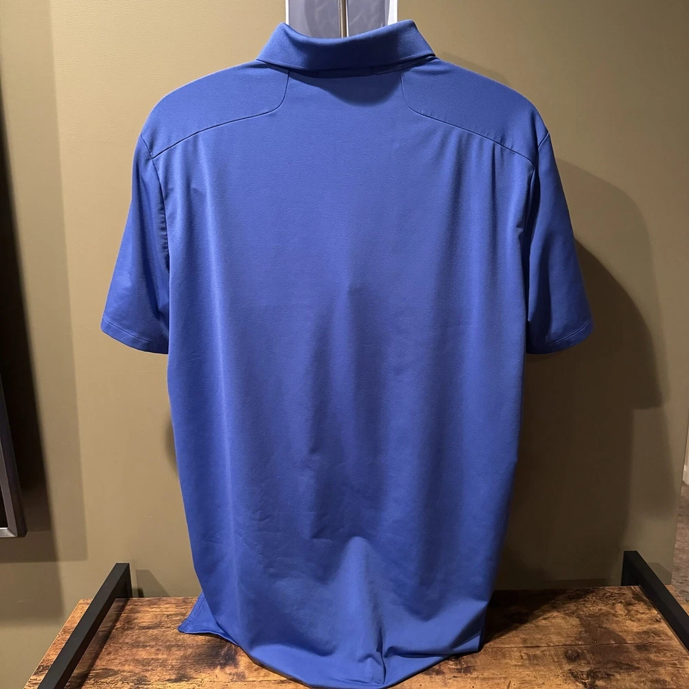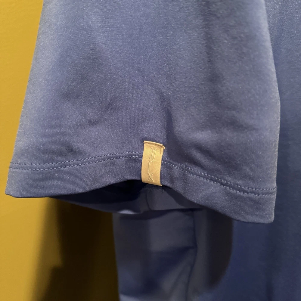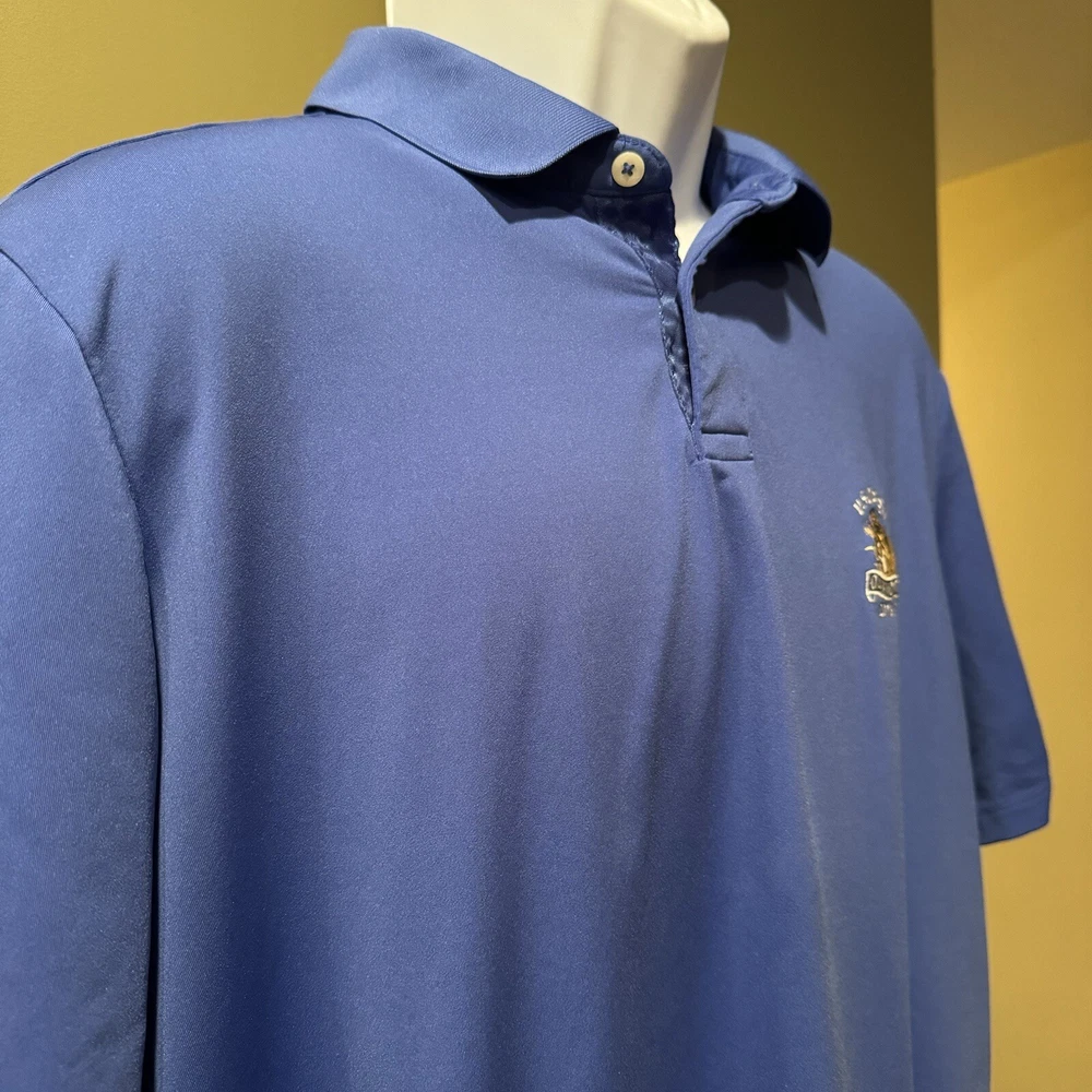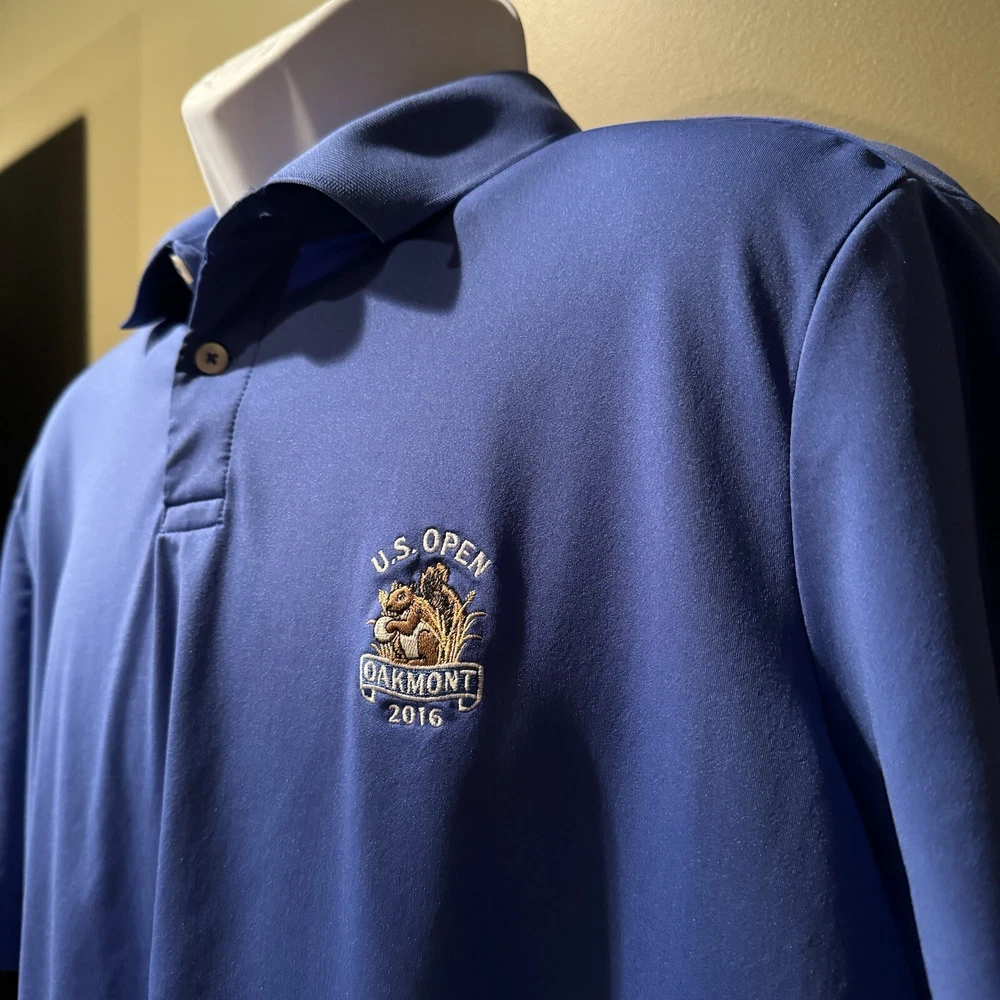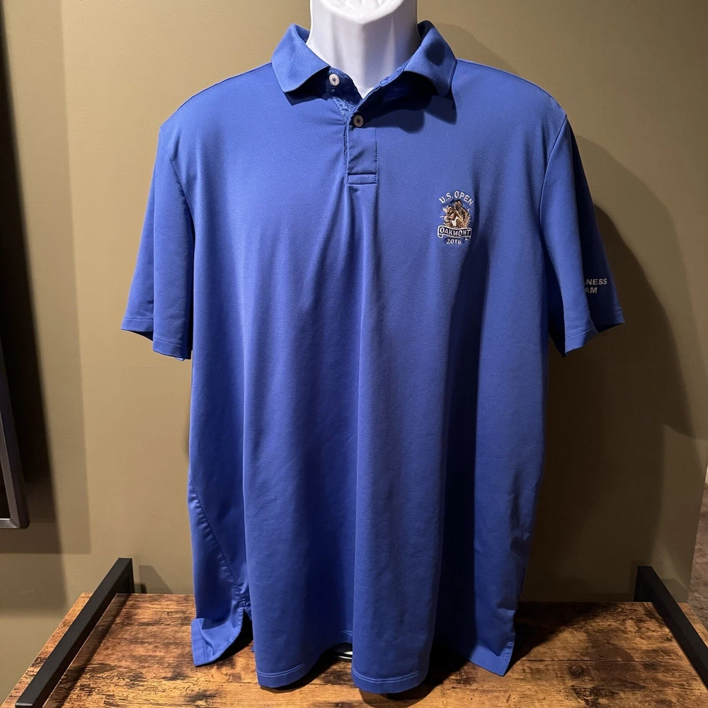 *Please note logos on chest and sleeve* ------------------------------------------ This RLX Ralph Lauren men's polo shirt in blue is perfect for golf, casual outings, and sports activities. Made of 100% polyester material, this shirt has a solid pattern, short sleeves, and a collared neckline. The shirt has a regular fit and is available in size XL, making it ideal for men. The shirt features the Oakmont logo, making it a must-have for golf enthusiasts. This polo shirt is from the 2016 US Open collection and is part of the RLX product line. It's perfect for men who want to look stylish while playing golf or engaging in other sports activities.