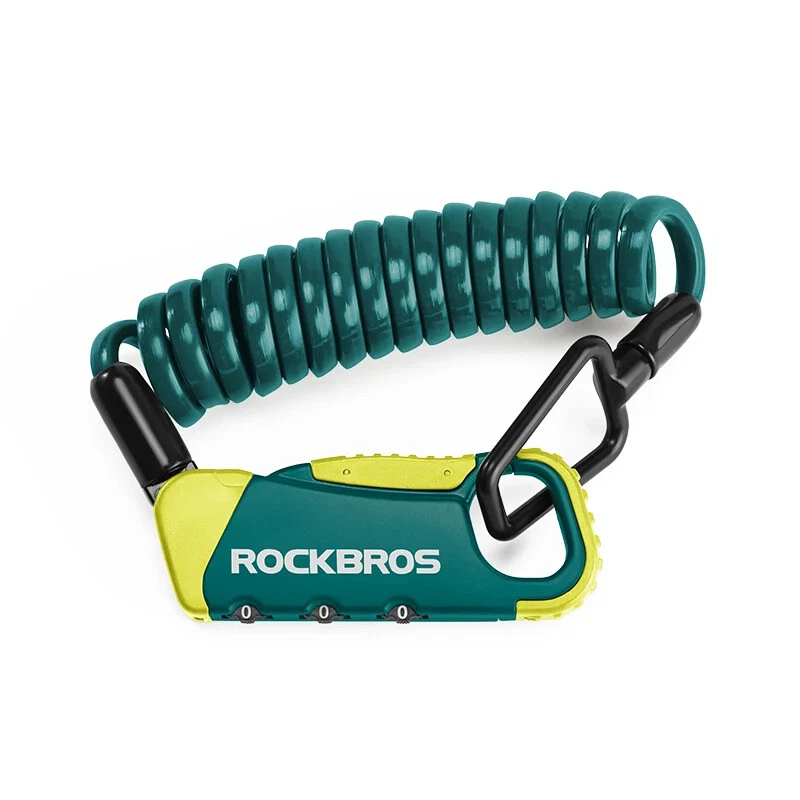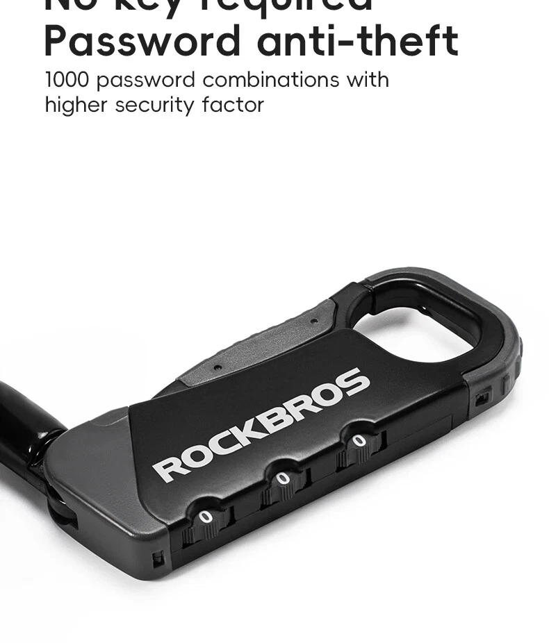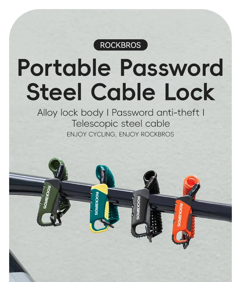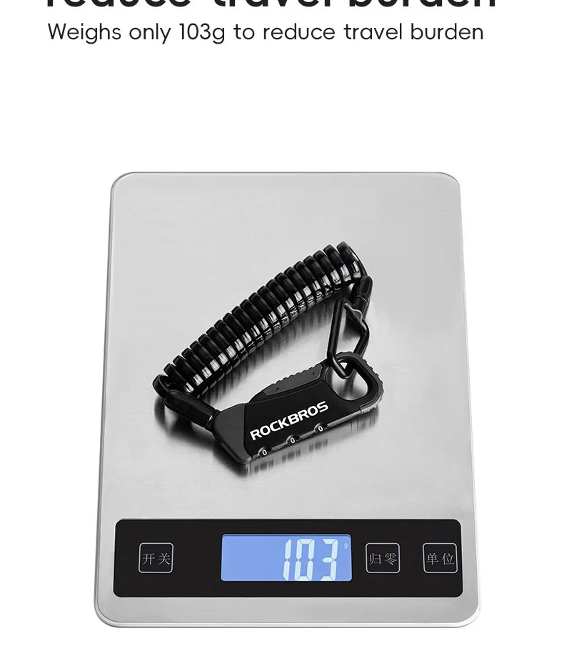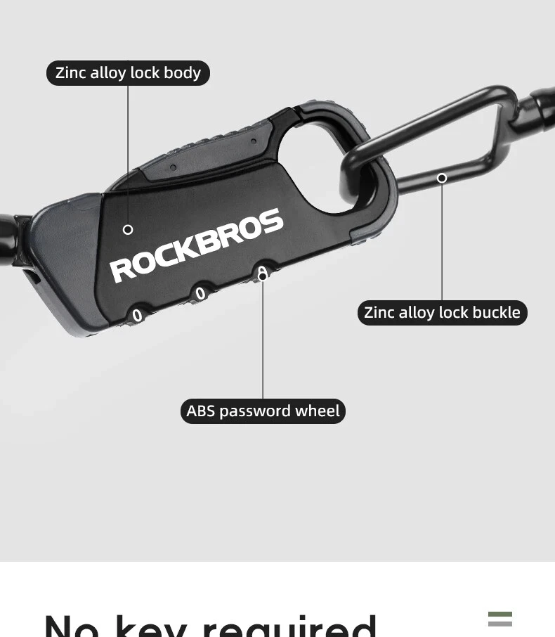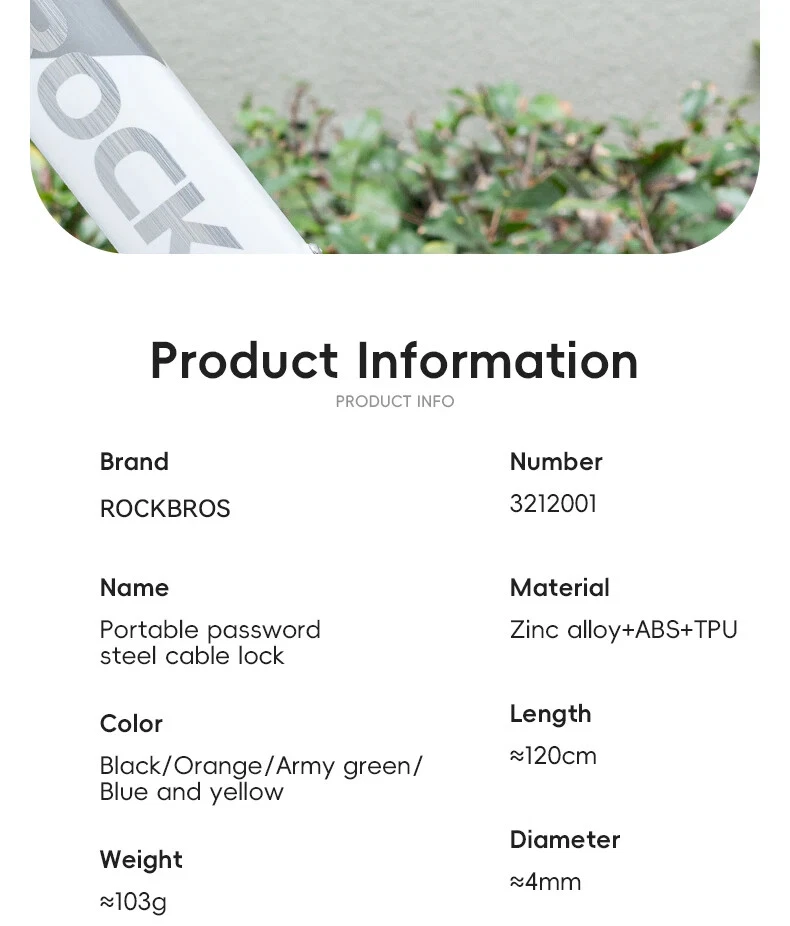 PRODUCT INFORMATION Brand: ROCKBROS Product name: Bicycle cable lock Material: Zinc alloy + ABS + TPU Weight: about 103g Length: about 120cm Color: Black, Orange, Army green, Blue-yellow PASSWORD SETTING 1. Dial the initial password 000 2. Press the side part of the lock 3. Dial the password wheel with the other hand to set the new password 4. Release the side part, password setting complete