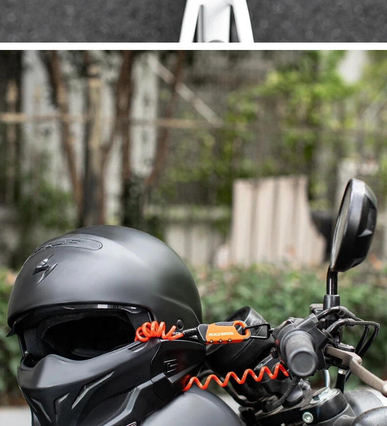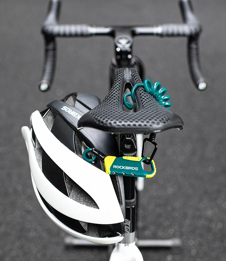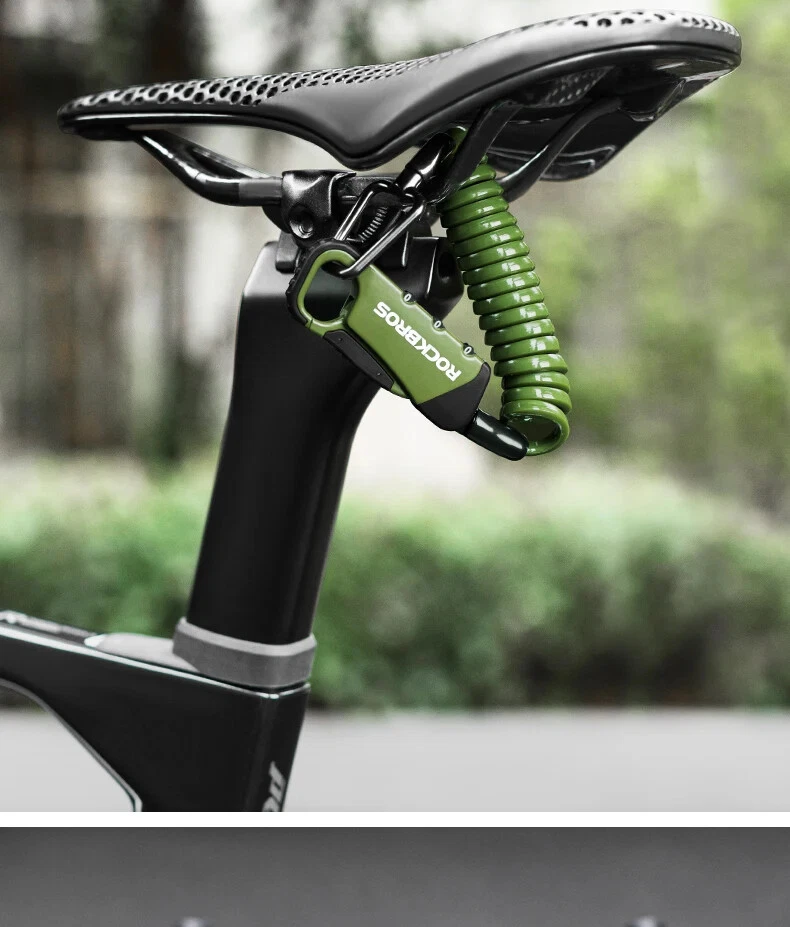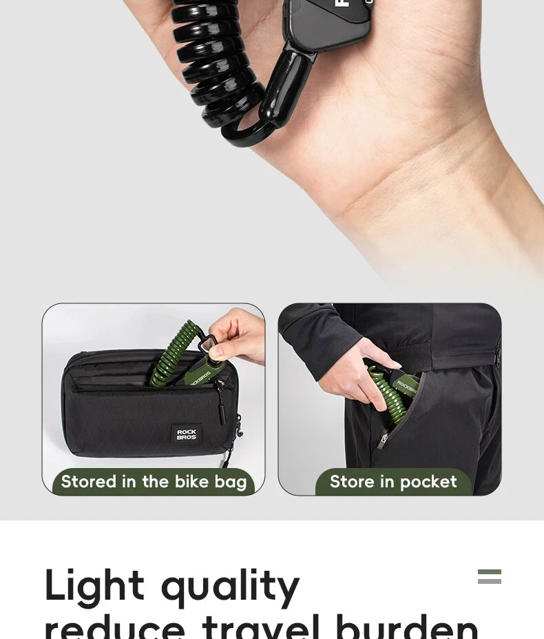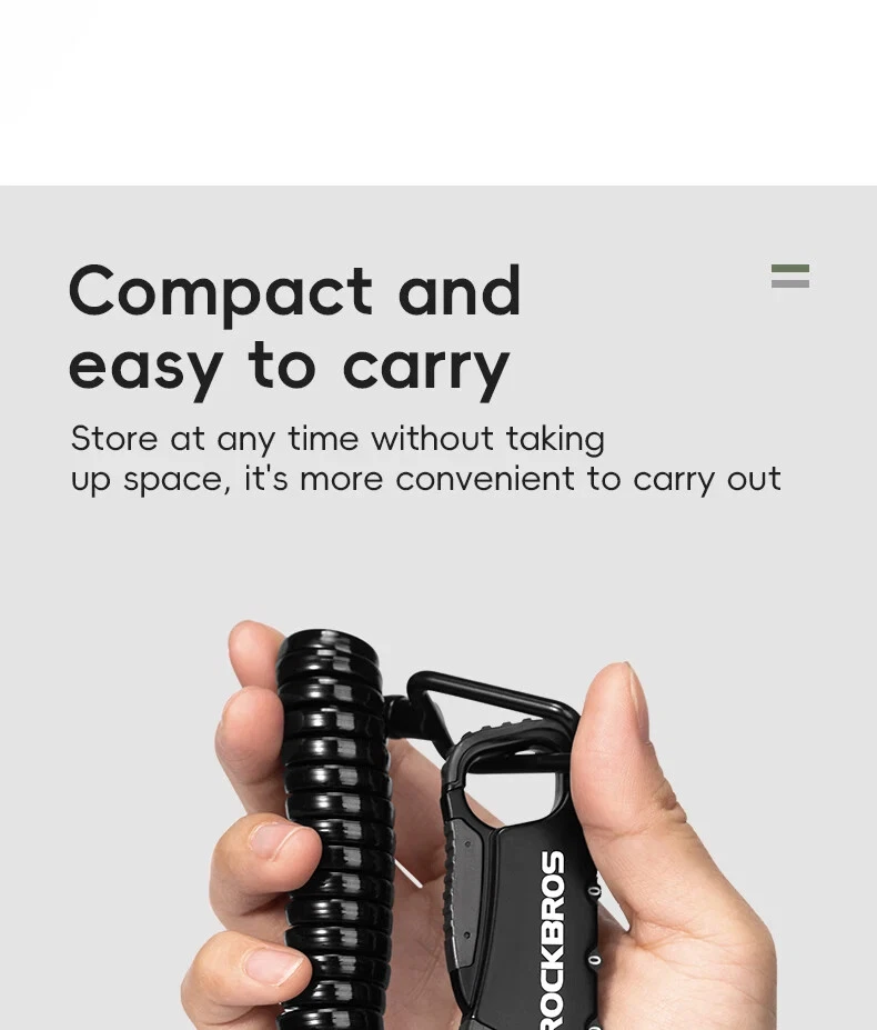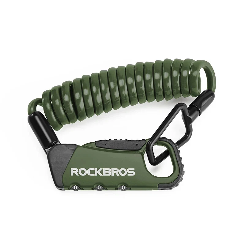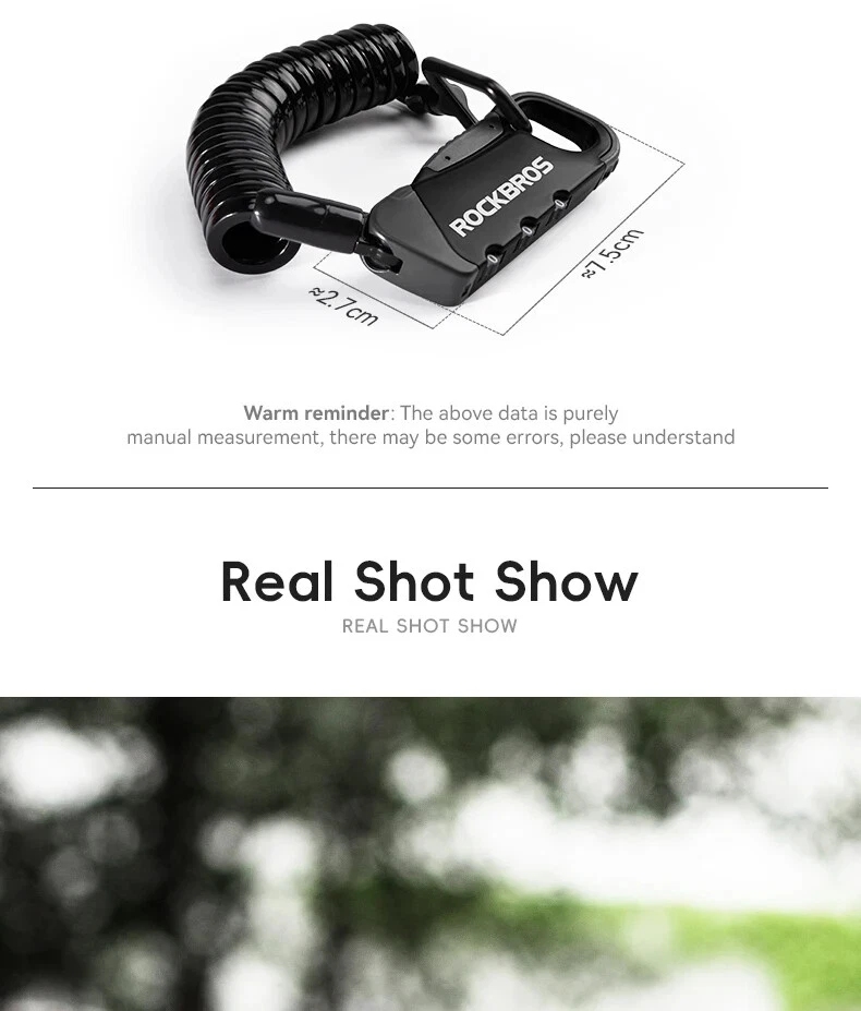 PRODUCT INFORMATION Brand: ROCKBROS Product name: Bicycle cable lock Material: Zinc alloy + ABS + TPU Weight: about 103g Length: about 120cm Color: Black, Orange, Army green, Blue-yellow PASSWORD SETTING 1. Dial the initial password 000 2. Press the side part of the lock 3. Dial the password wheel with the other hand to set the new password 4. Release the side part, password setting complete