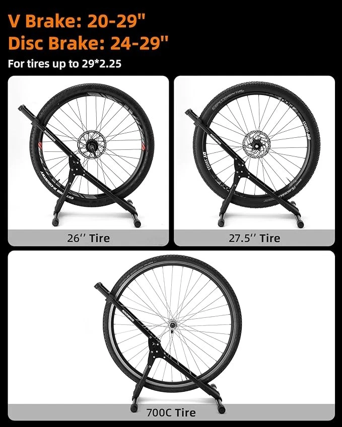 Brand:ROCKBROS Name:Folding racks Material:Carbon steel weight:1905g (racks wrench) color:Black Applicable models: V Brake type :20-29 inches Disc brake type :24-29 inches Used tires:29*2.25 or less Characteristic:Folding/small/ High stabilityl applied models