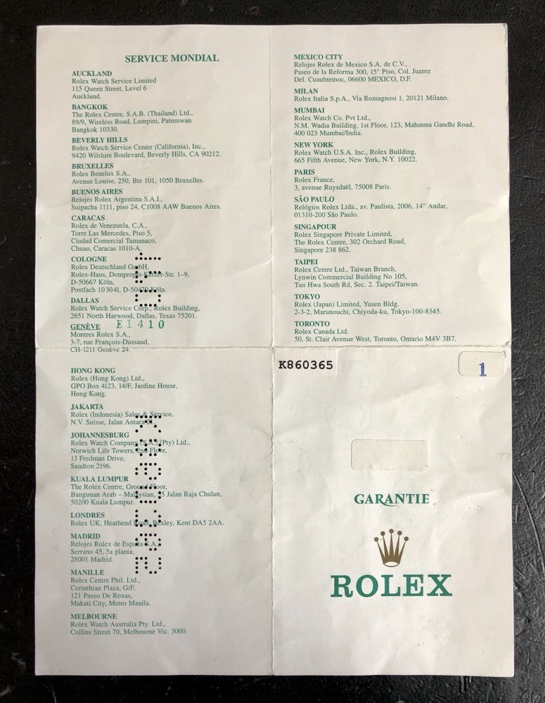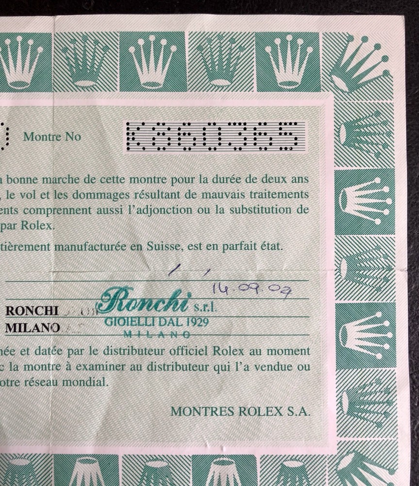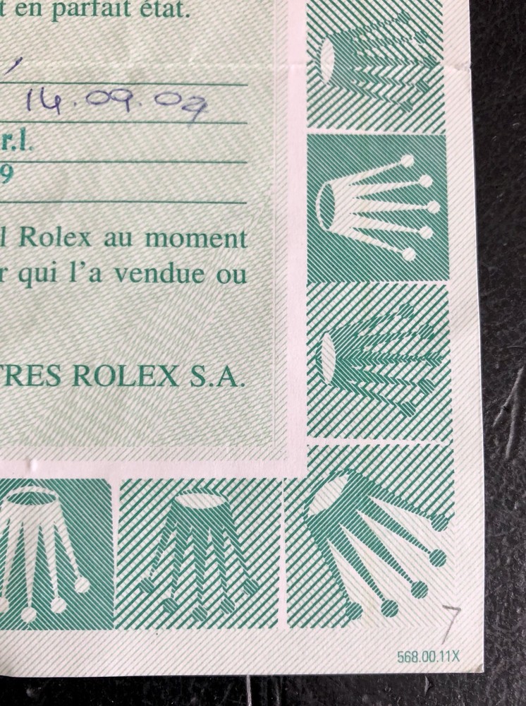 ROLEX Genuine Certificate Part: 568.00.11X Serial: K860365 Country Code: 170 = Italy Private Collection ORIGINAL ---------------------------------------------- These products are being sold for Collection purposes ONLY. I am Member of WTA since 1998 I am not affiliated with Rolex . I am not an official Rolex Dealer Questions : Please ask us all the questions you have before bidding. ------------------------------------------------- We sell products that might have been used or otherwise known as "take-offs". Some parts are like new or very gently used, and others show signs of wear and may need to be cleaned or polished. Please see pictures for more details. We try to take pictures of any defects the item may have. If you have any additional questions, feel free to ask us and we will get back to you as soon as possible. Customer Service If for any reason you have an issue with our product, please choose “Contact Seller” via eBay before leaving negative feedback or opening a case. We promise to resolve any issues as soon as possible. Positive feedback and 5-star seller ratings are extremely important to us as we are looking to provide outstanding products and services to our customers. Returns We reserve the right to charge a 10% restocking fee on all returns. Shipping and handling charges are not refundable. The buyer is responsible for the return shipping fee. Shipping We typically ship orders Monday through Friday (except for Holidays) within 3 business days of receipt of cleared payment. Please make sure your shipping address is correct before sending payment. All orders are shipped with a tracking number. You will receive and email with it as soon as your order ships. Please allow a few extra days for delivery if there is a weather problem. IMPORTANT NOTE FOR INTERNATIONAL BUYERS All our goods are shipped from Spain, but we are a UK based eBay shop, sales to the European community might be subject to VAT. Please see the link below: VAT on eBay purchases for EU buyers | eBay.com BUYERS OUTSIDE THE EUROPEAN UNION: The tariffs, duties and import taxes are not included in item price or shipping charges. These charges are the responsibility of the buyer. Refer to the customs authorities of your country to inquire about these costs before bidding on an item or buying it. These fees are usually charged by the carrier or when the buyer takes the item and should not be confused with additional shipping costs.