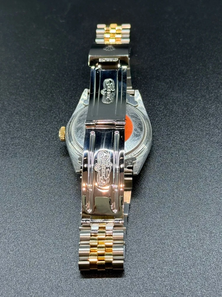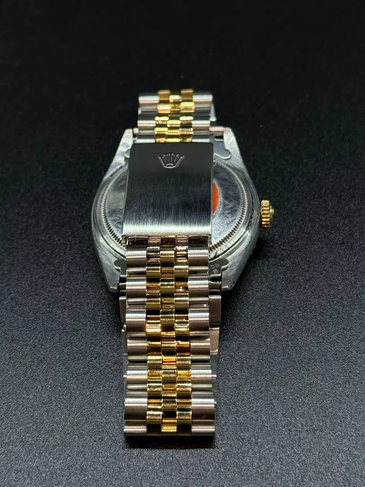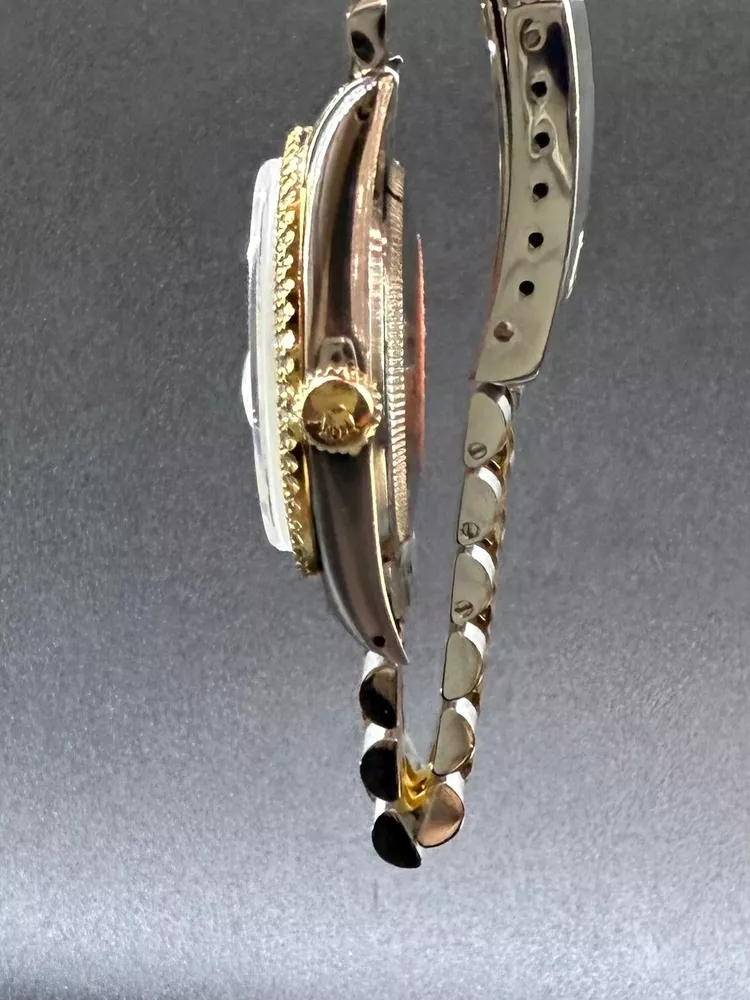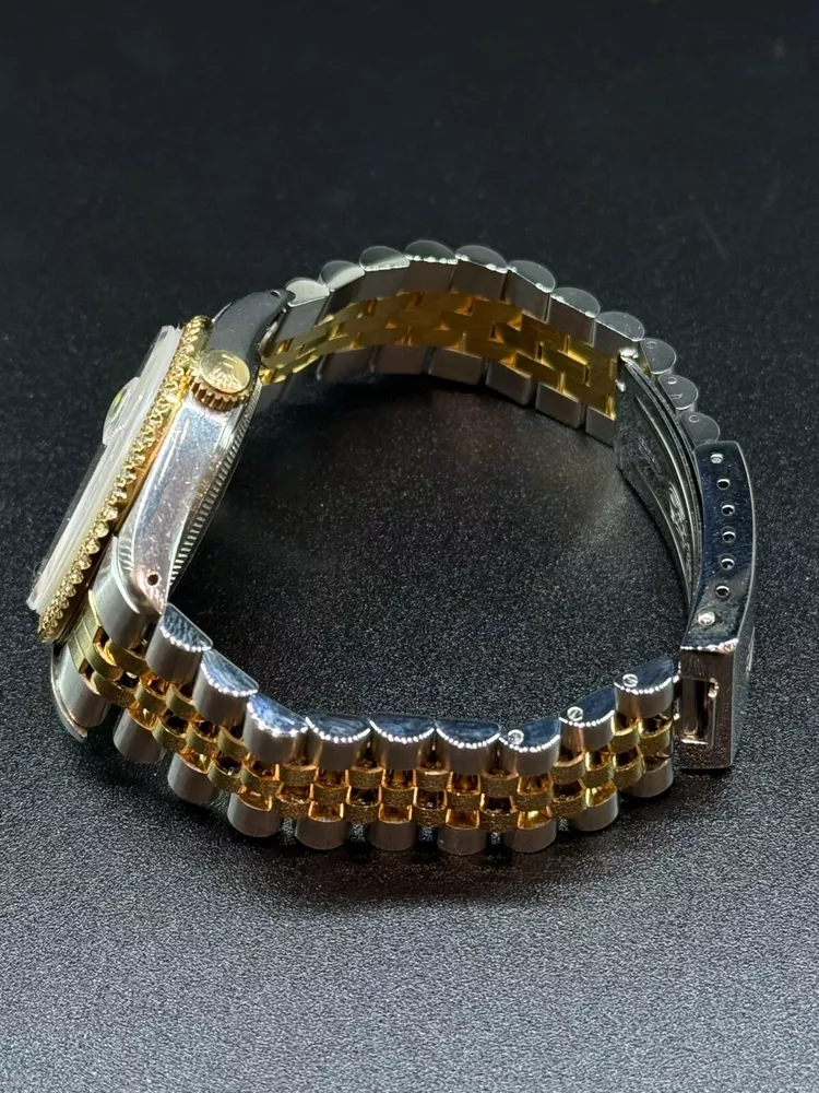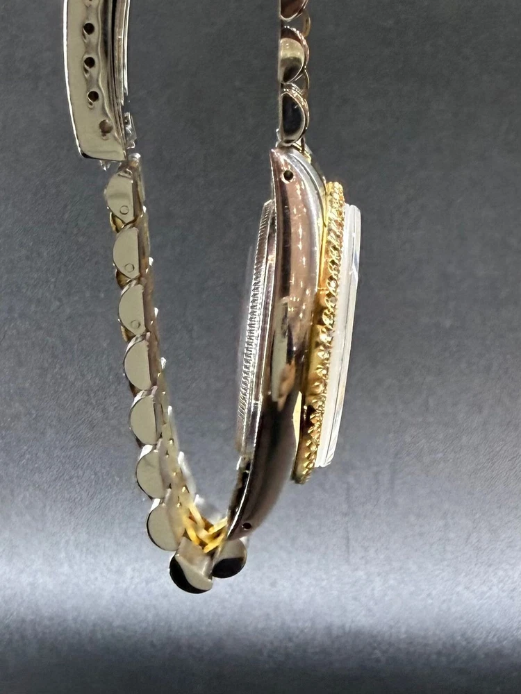 Rolex Date Just 36mm, 16013 Custom Silver Diamond Jubilee Custom 1.5ct Diamond, Aftermarket Dial, Bracelet and Bezel. The Rolex 16013 is a vintage watch model from Rolex's Date Just series that was produced from the late 1970s to the early 1990s. It is a popular and highly sought after watch model among collectors and enthusiasts. The Rolex 16013 features a 36mm case made of stainless steel. The Rolex 16013 is powered by a self-winding movement with a power reserve of approximately 48 hours. One of the unique features of the Rolex 16013 is its two-tone design and quickset feature. This 2tones combination creates a versatile and timeless look that can be worn for both formal and casual occasions. The Quickset feature is achieved through a mechanism that allows the user to change the date by simply pulling out the winding crown to the second position and turning it in a clockwise or counterclockwise direction. This causes a quick-change mechanism to engage, allowing the wearer to advance the date forward or backward by one day. Before the introduction of Quickset, Rolex watches required the wearer to rotate the hands through a full 24 hours to adjust the date, which could be time-consuming and potentially damaging to the movement if done repeatedly. The Quickset feature is a valuable addition to Rolex watches, as it allows for easy and efficient date adjustment, making the watch more convenient and user-friendly. Today, most modern Rolex watches come equipped with the Quickset feature. This Beautiful Watch Comes Fully Serviced, Time-Tested, Air/Water Pressure Tested with aftermarket Rolex Watch Box & Watch Appraisal Included from Seller. Comes to fit 7.5 Inch But Can Accommodate Larger or Smaller Upon Request.