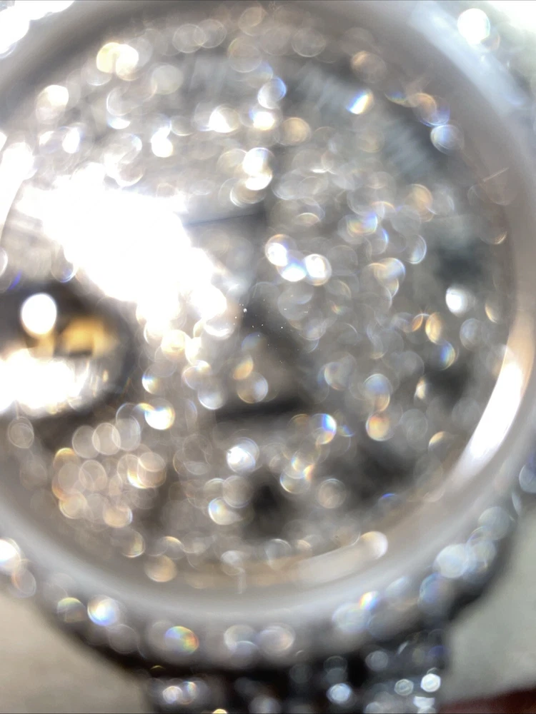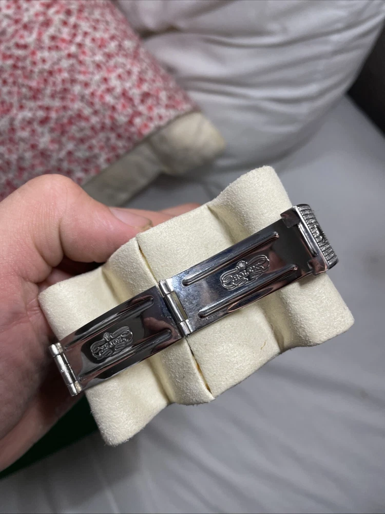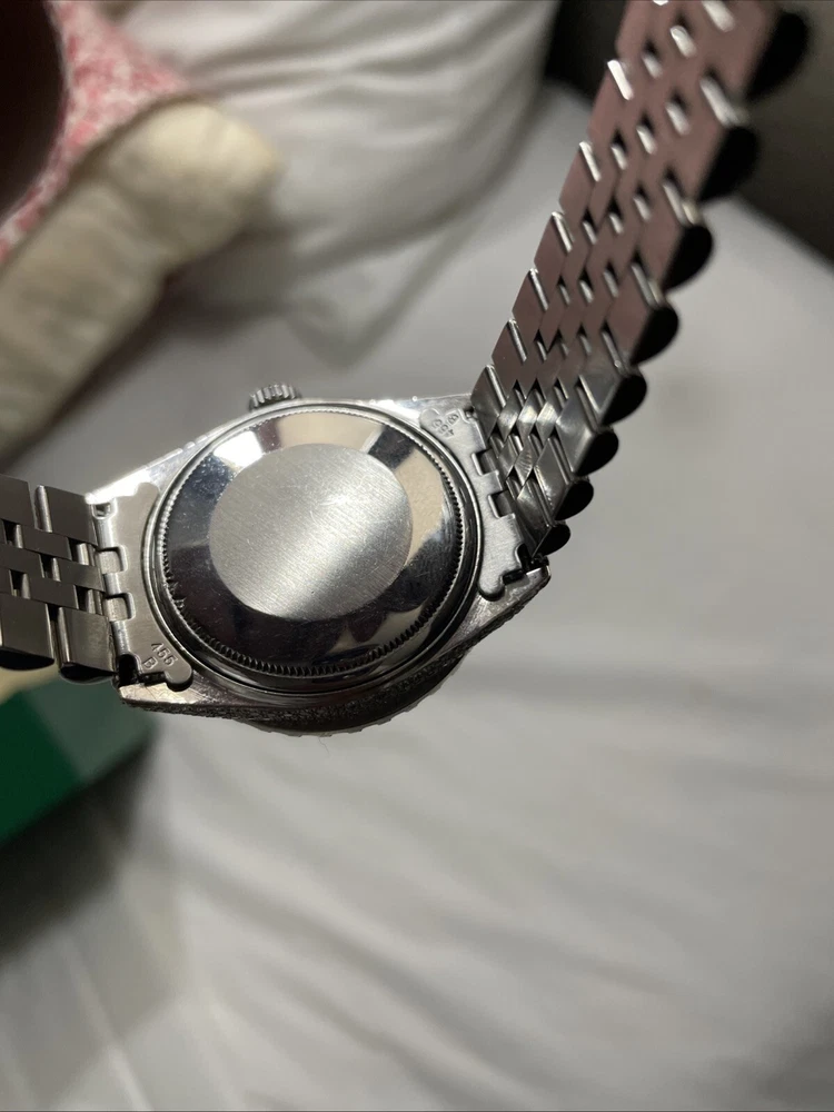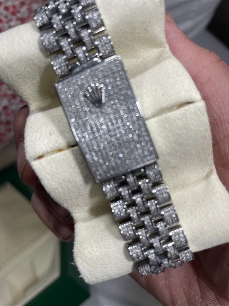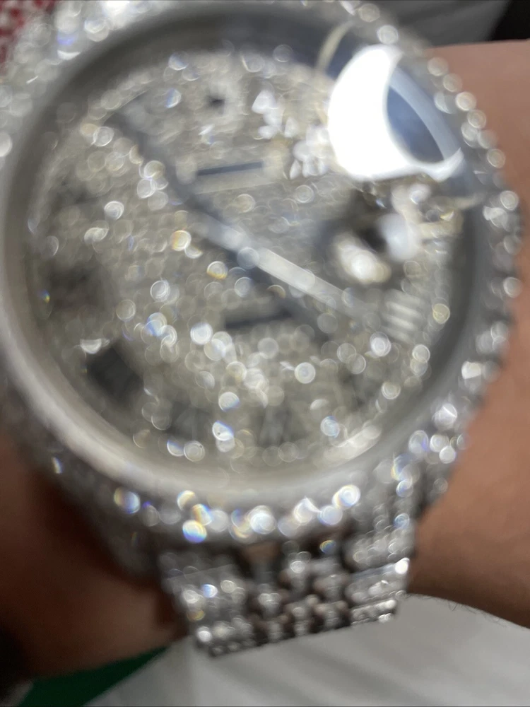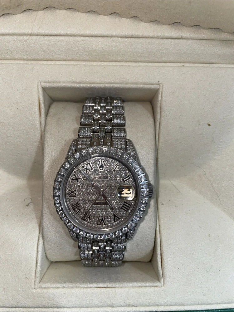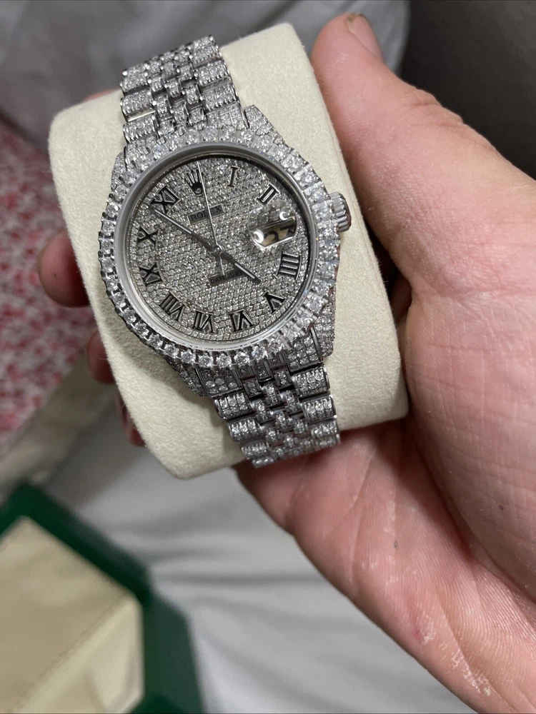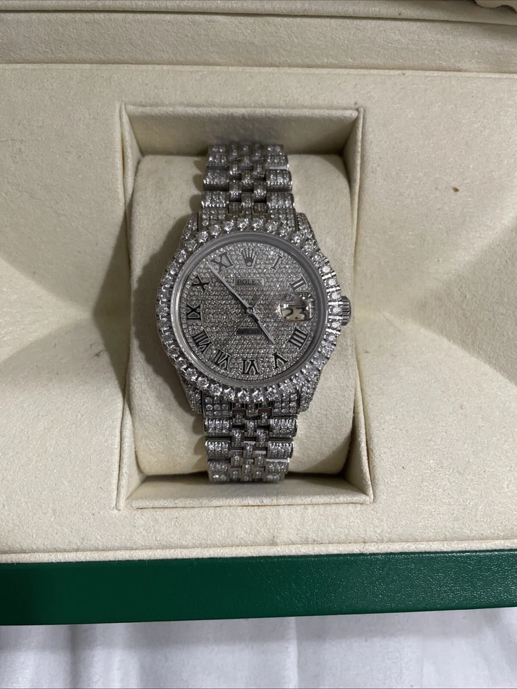 This is a genuine Rolex Datejust wristwatch with a silver bracelet and a 36mm round silver case. The watch features a diamond pattern on a black dial with Roman numerals and diamond markers as indices. It has a solid case and a water resistance of up to 160 meters. The watch is customized with 10-15ct of natural diamonds. but does not come with papers but has the original box/packaging. The watch was manufactured in Switzerland between 1980-1989 and has a stylish and luxurious design, perfect for dress/formal occasions or as a celebrity accessory.