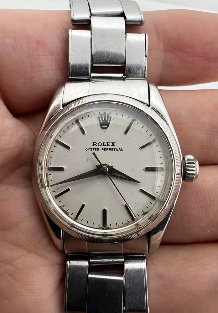 ROLEX OYSTER PERPETUAL AUTOMATIC BUTTERFLY ROTOR REF 6549 CALIBER 1130 G. FRERES BANDS WATCH 30mm THE WATCH IS IN VERY GOOD CONDITION LIKE YOU SEE THE PHOTOS AND KEEP THE TIME VERY WELL. THE DIAL IS IN GOOD CONDITION. IT HAS TINY DAMAGES AT THE CHAPTER RING INSIDE AS YOU CAN SEE FROM THE PHOTOS. THIS WATCH IS VINTAGE FROM 1958. THE MOVEMENT IS AUTOMATIC BUTTERFLY ROTOR CALIBER 1130 IN VERY GOOD CONDITION LIKE YOU SEE THE PHOTO THE CRYSTAL IS PLASTIC IN VERY GOOD CONDITION THE CROWN IS ORIGINAL IN VERY GOOD CONDITION LIKE YOU SEE THE PHOTO THE CASE IS S.STEEL IN VERY GOOD CONDITION. IT IS 30 mm WITHOUT CROWN AND 34 mm with crown.IT HAS TINY SCRATCHES AS NORMAL USE. THE BANDS ARE ORIGINAL AND THEY ARE VERY RARE FOR COLLECTORS .THEY ARE WITH SIGN G .F. BANDS AND THEY ARE IN GREAT CONDITION LIKE YOU SEE THE PHOTOS.THE BANDS ARE MEDIUM SIZE FOR YOUNG LADYS IT HAS TINY SCRATCHES AS NORMAL USE. I SELL AS IT IS IN THE PHOTO THANK YOU